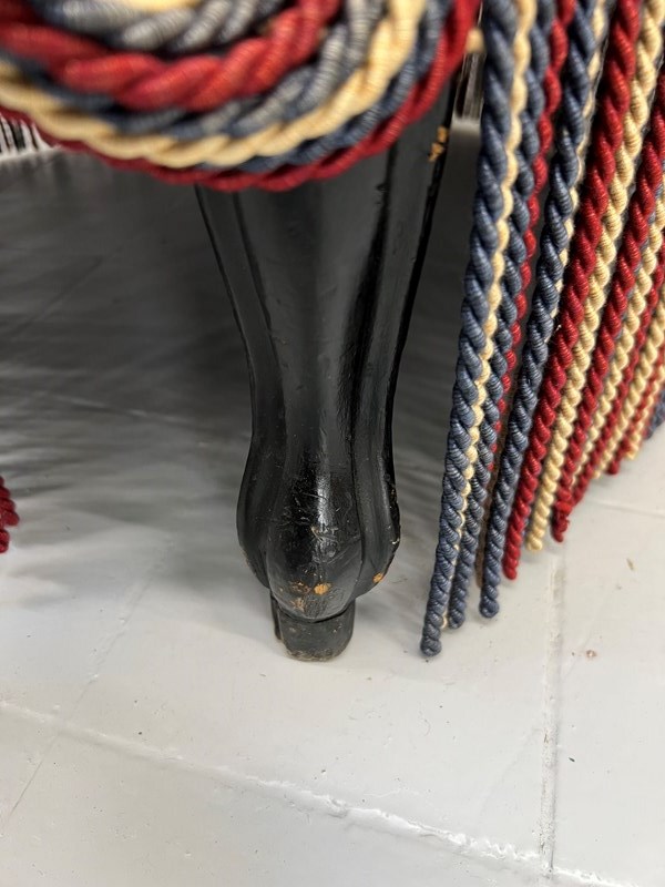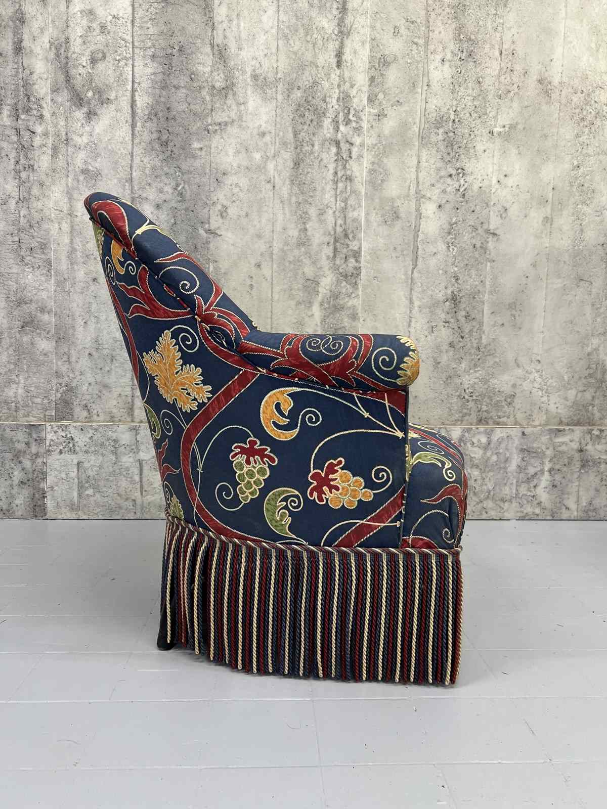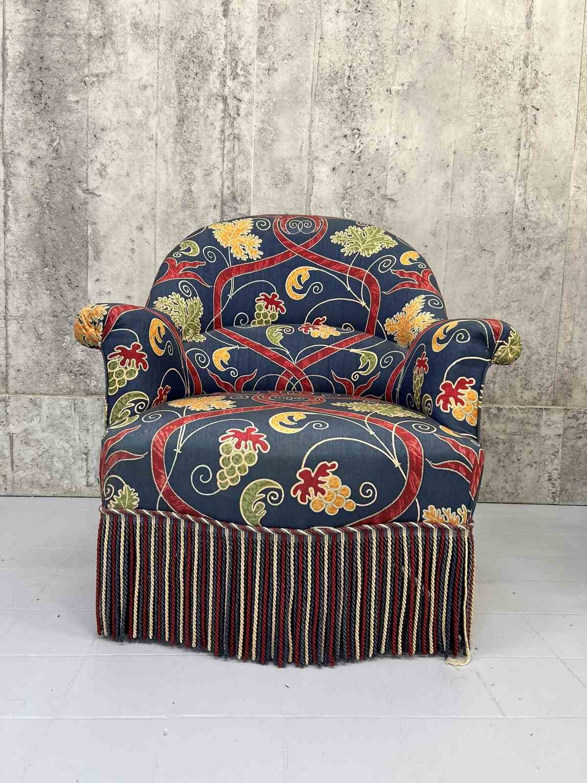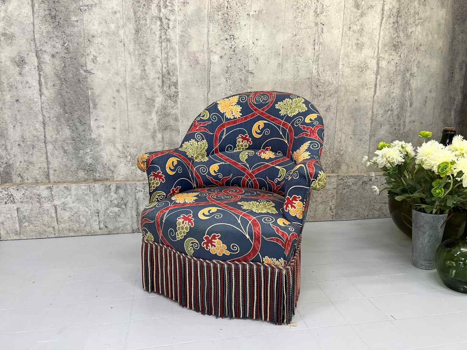 A fabulous example of the Crapaud style tub chair, a classic French seat shape. With carved ebonsied legs, this example is in good condition. The fabric is a 1980's cotton, which we recommend would be replaced, so we have priced accordingly.