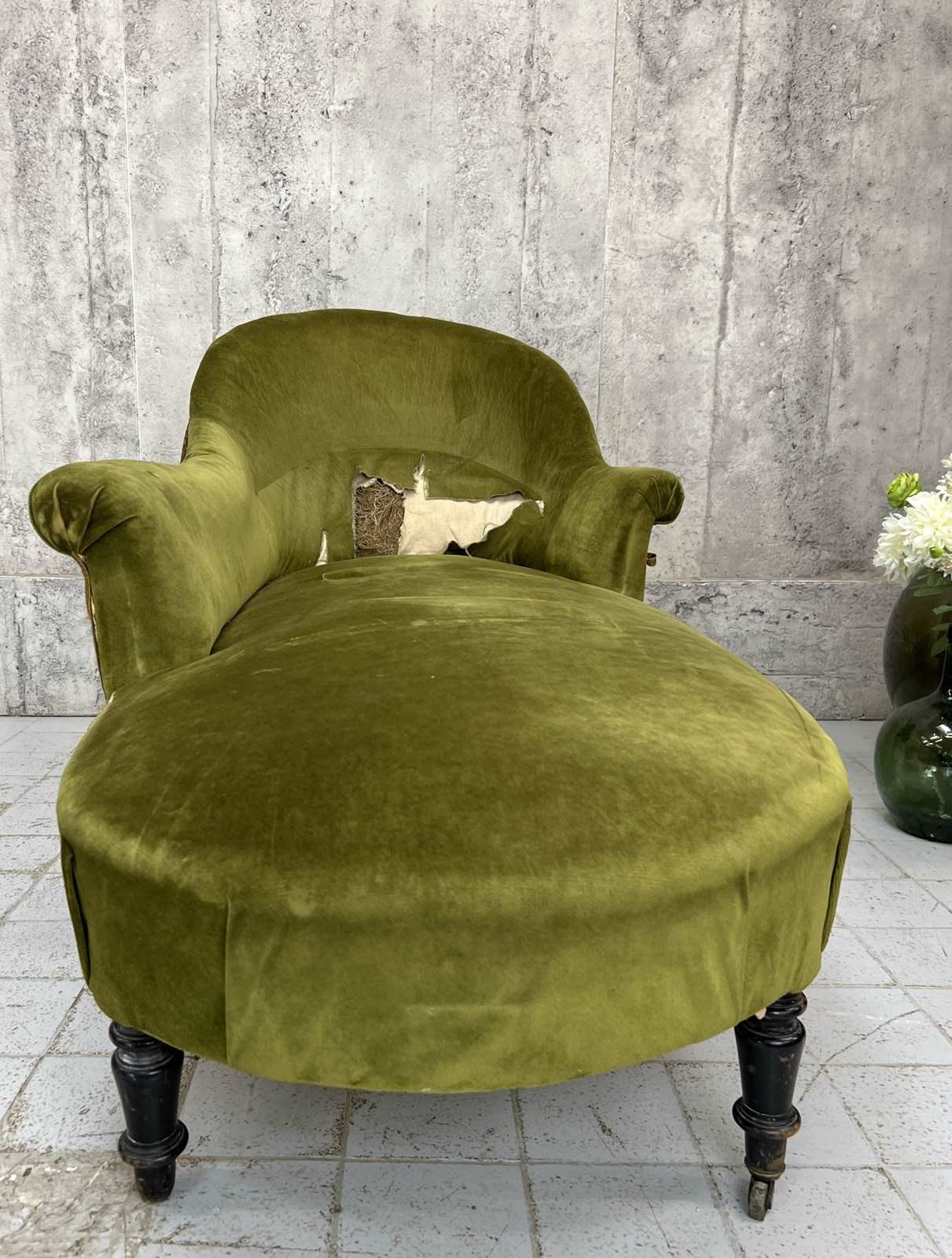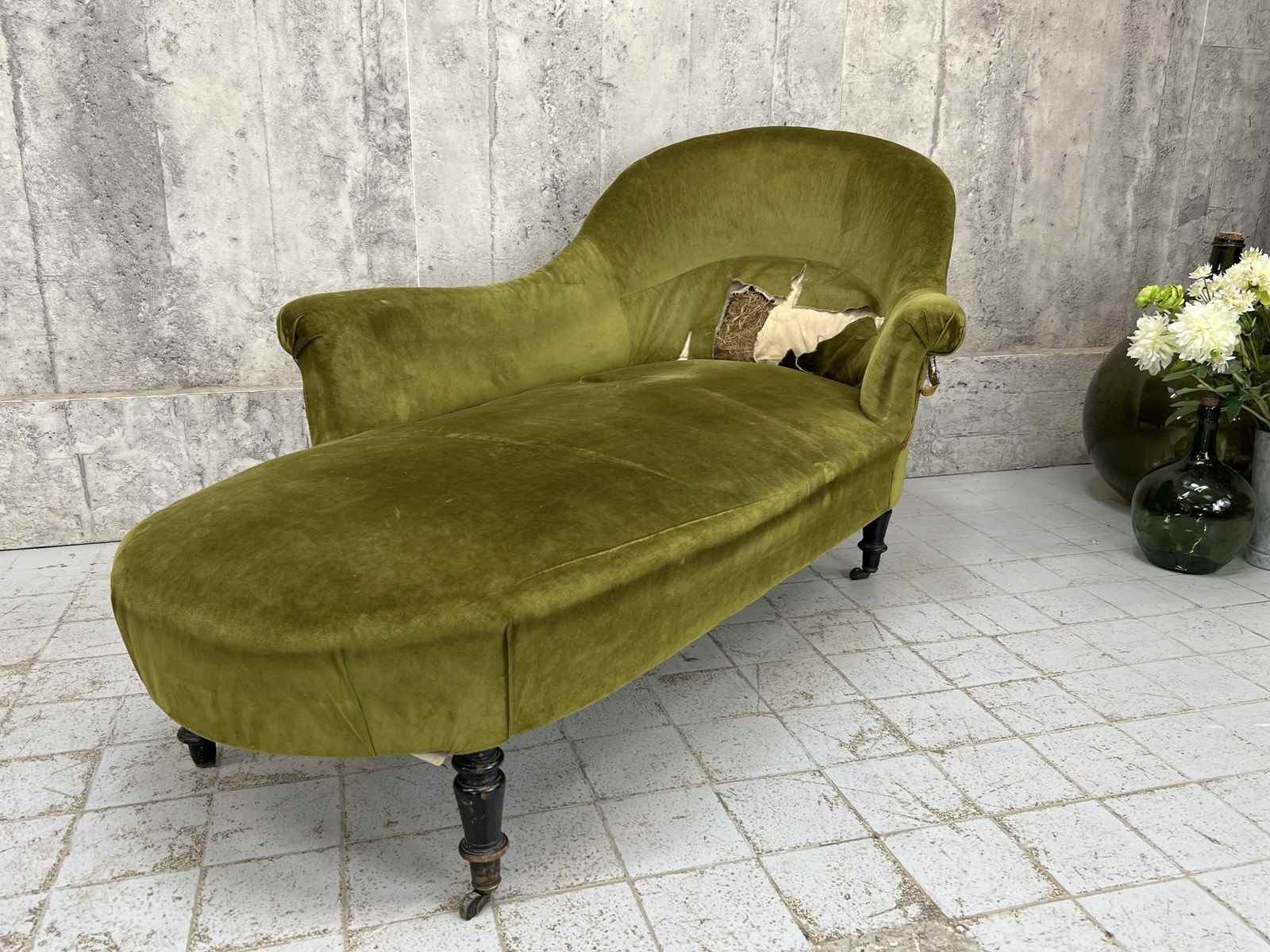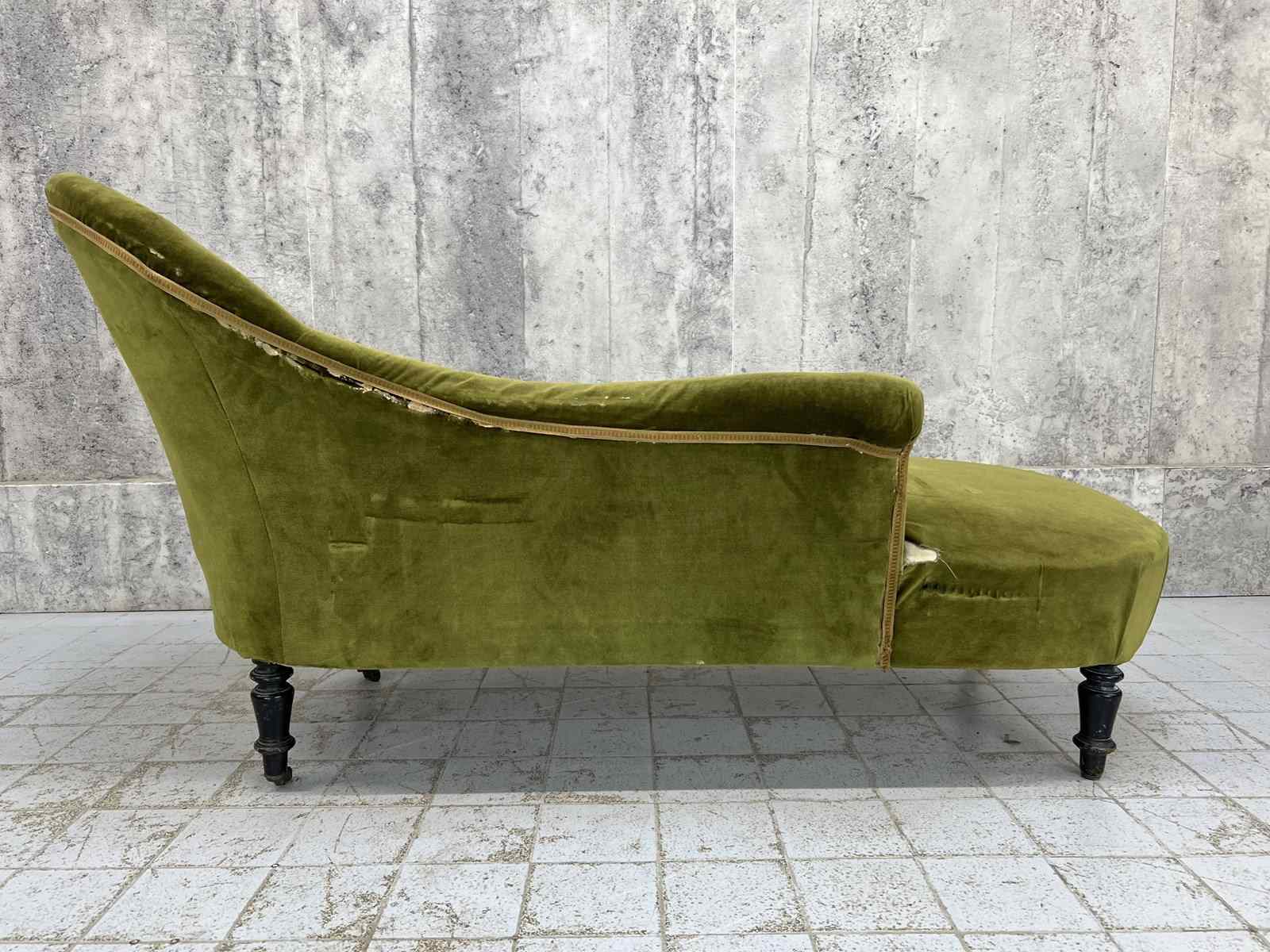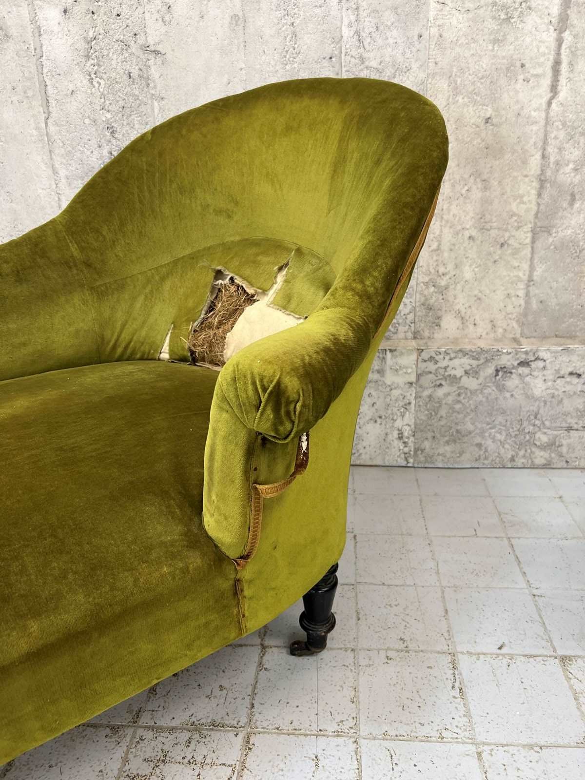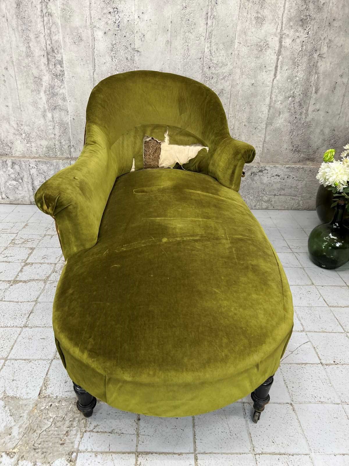 I absolutely adore this Napoleon III moss green cotton velvet chaise longue despite its obvious areas for improvement. The colour of the fabric is delicious, the form of the chaise longue is perfect.. I love sliding int a chaise longue, putting my feet up and having a moment of me time. The legs are ebonised turned pear wood, the velvet is cotton and this is a wonderfully comfortable example. A you can see there are areas of braid that need sticking back down and the panel that has the lumber support has been ripped... you can see the original stuffing underneath. As you can see from the photographs however, if this is nearly perfect for you and a few throw cushions are up your street, this can be used as it is. WE have priced with the rarity and beauty in mind but in consideration of the work required too. An absolute treasure.