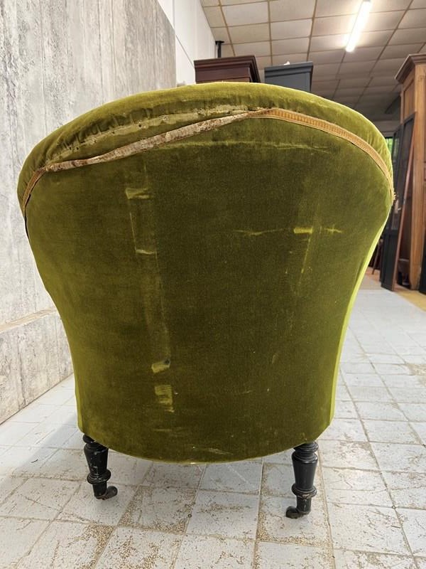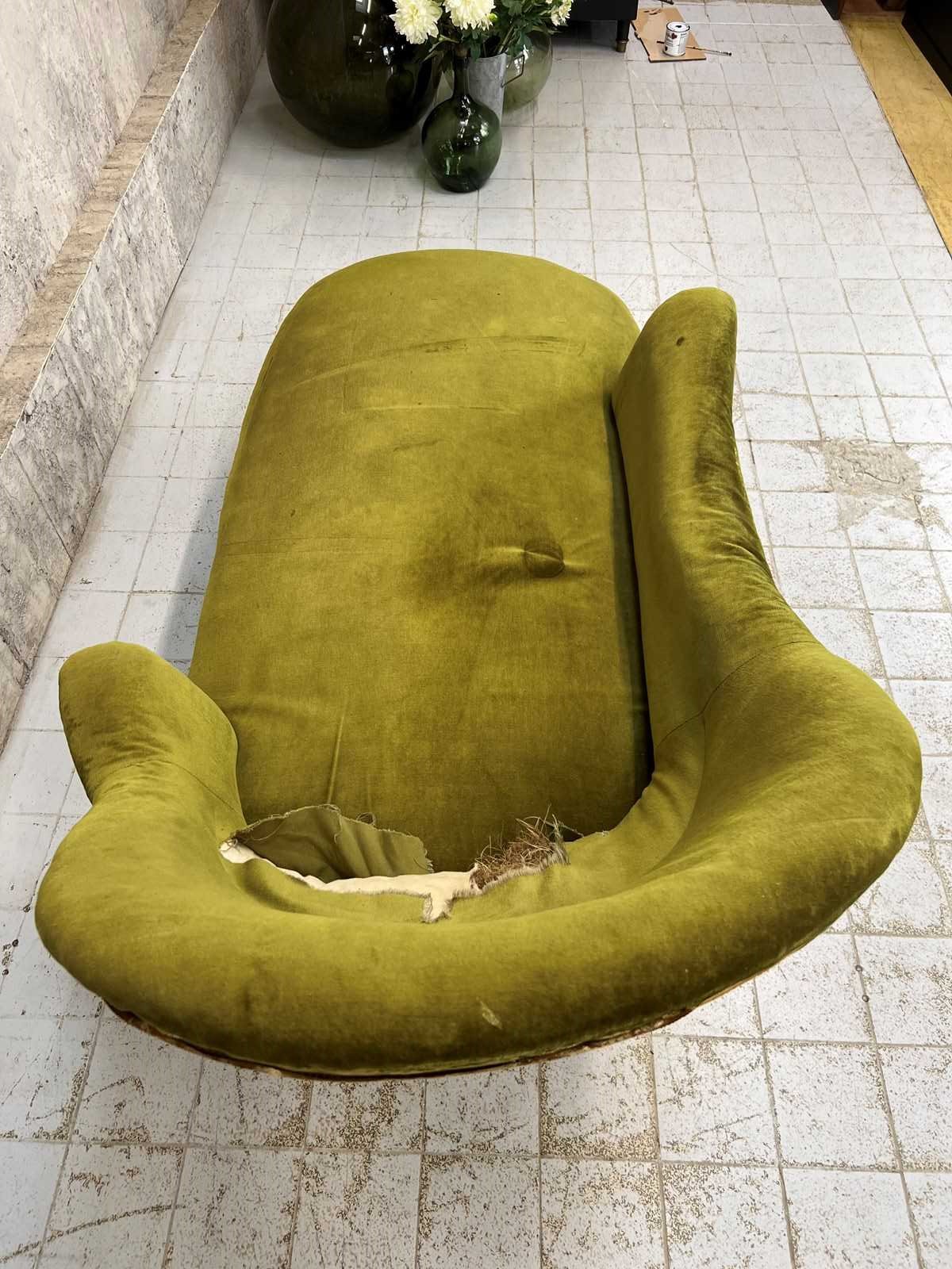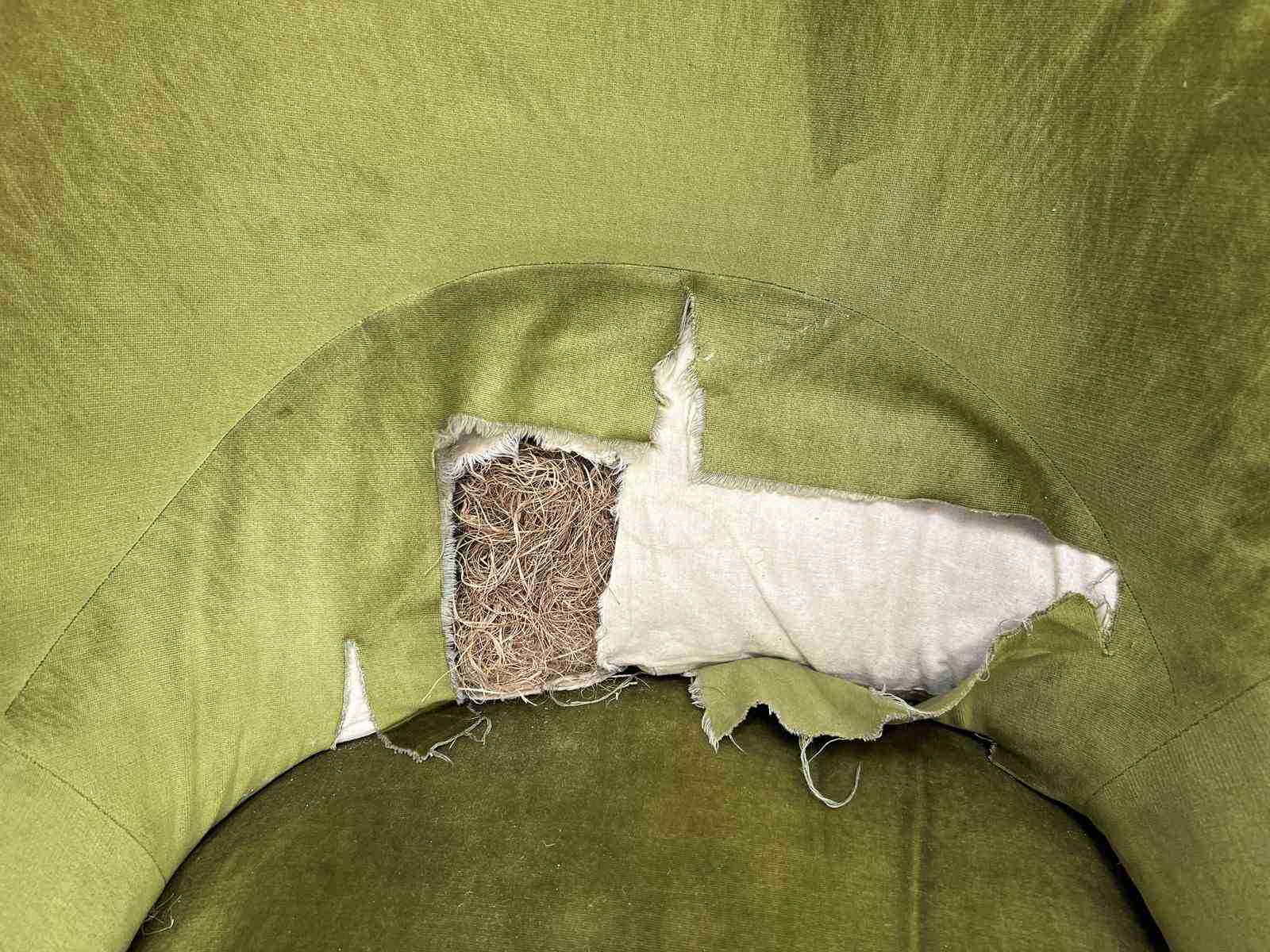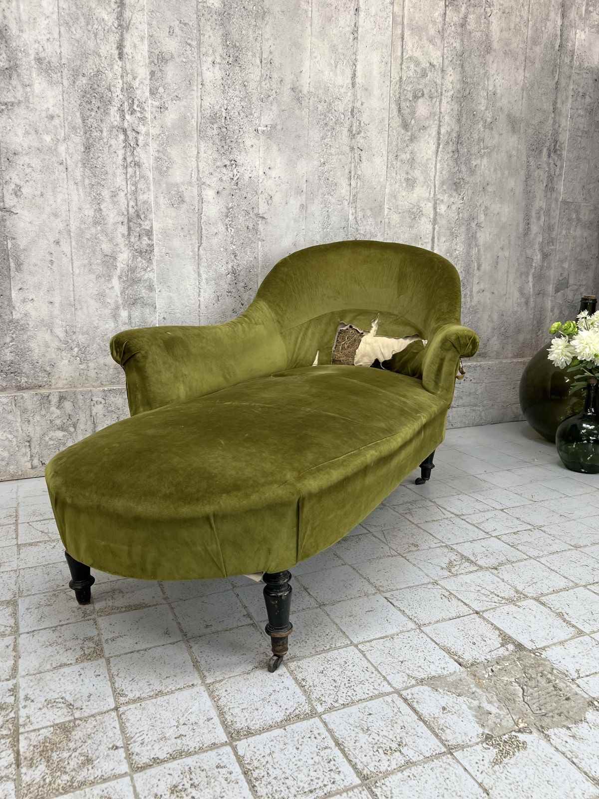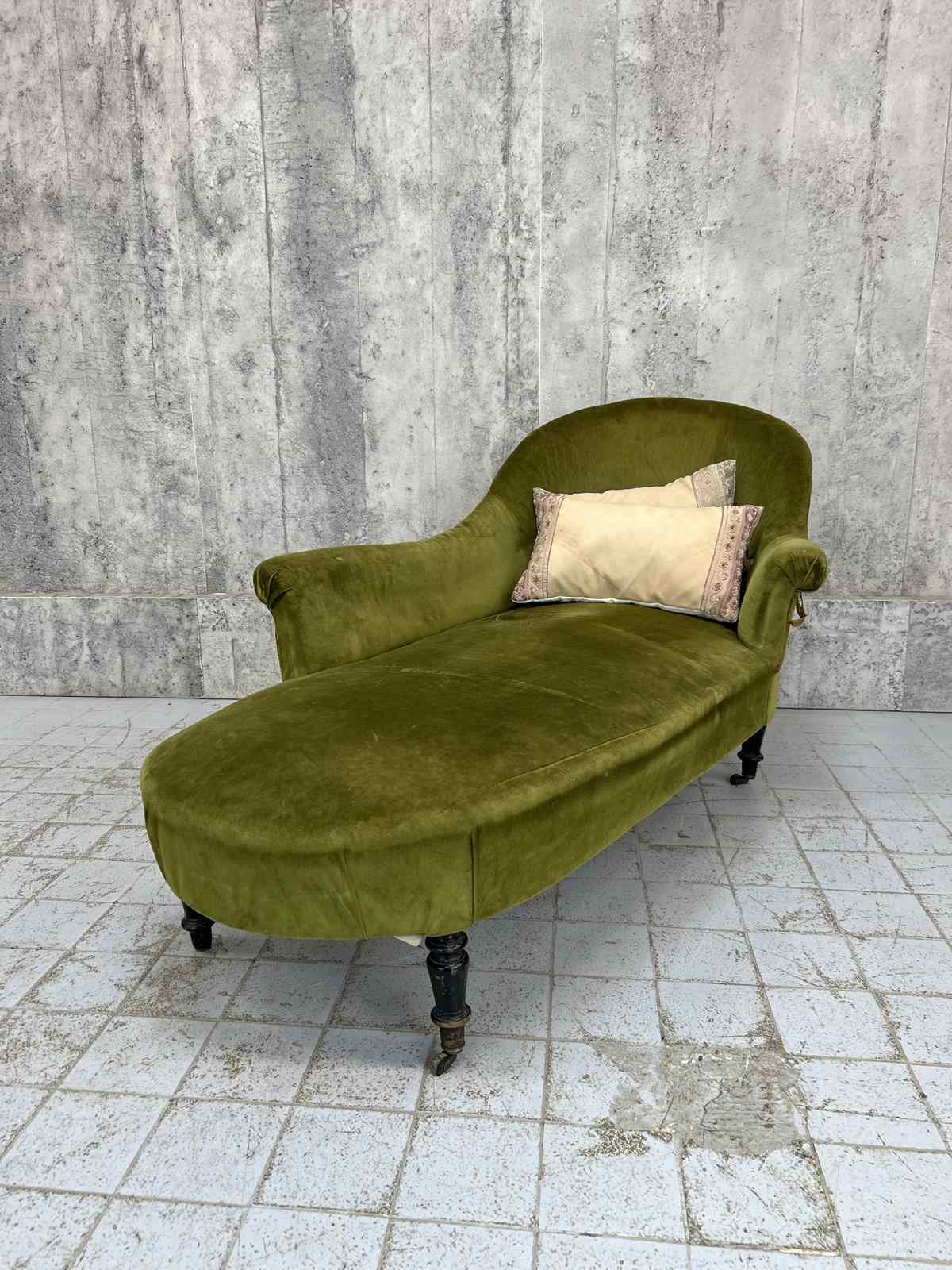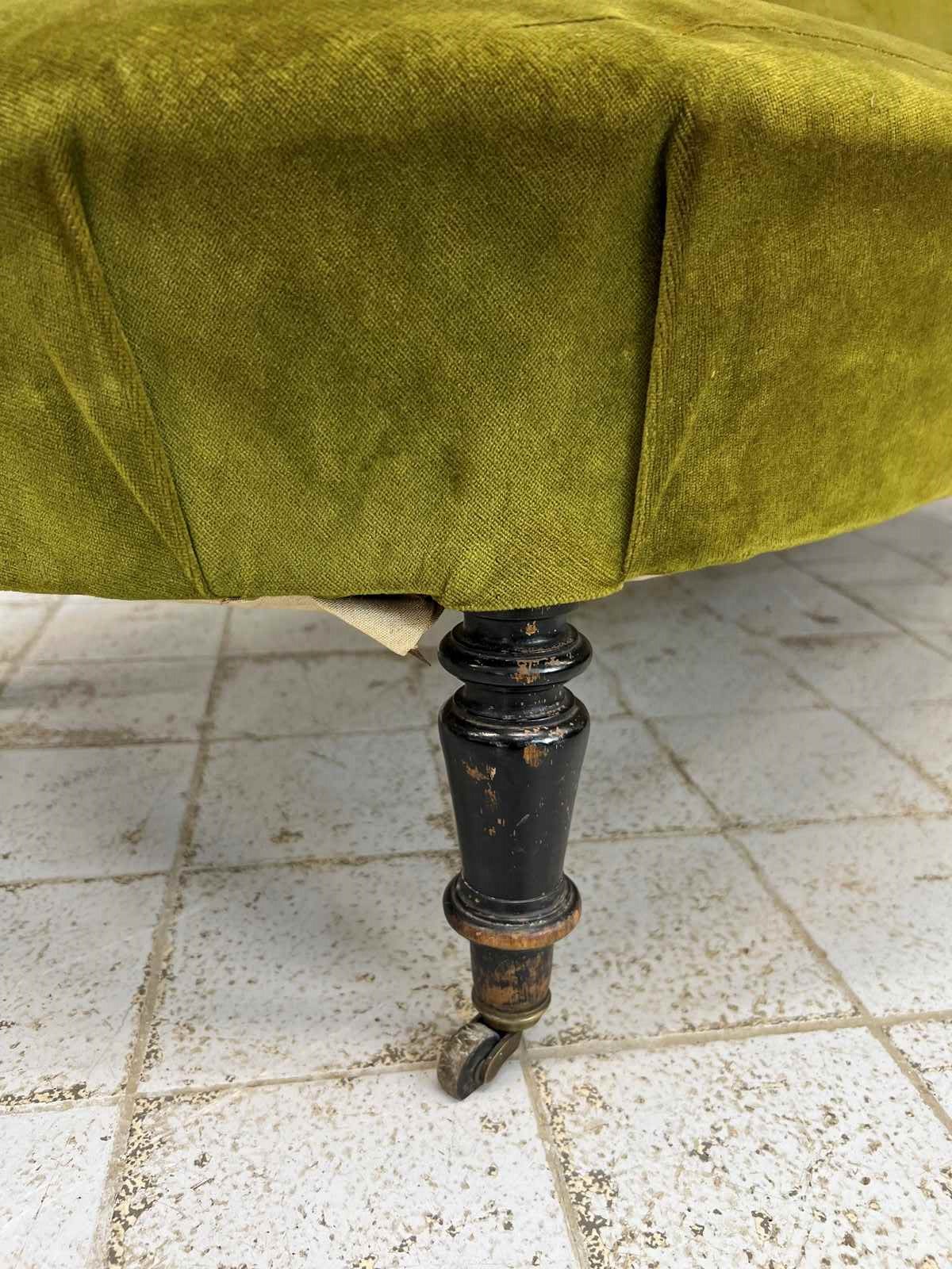 I absolutely adore this Napoleon III moss green cotton velvet chaise longue despite its obvious areas for improvement. The colour of the fabric is delicious, the form of the chaise longue is perfect.. I love sliding int a chaise longue, putting my feet up and having a moment of me time. The legs are ebonised turned pear wood, the velvet is cotton and this is a wonderfully comfortable example. A you can see there are areas of braid that need sticking back down and the panel that has the lumber support has been ripped... you can see the original stuffing underneath. As you can see from the photographs however, if this is nearly perfect for you and a few throw cushions are up your street, this can be used as it is. WE have priced with the rarity and beauty in mind but in consideration of the work required too. An absolute treasure.