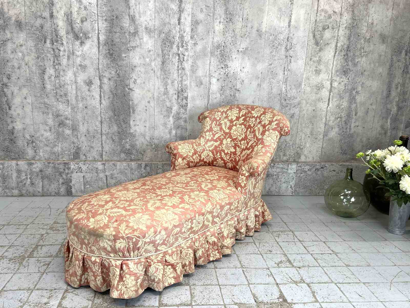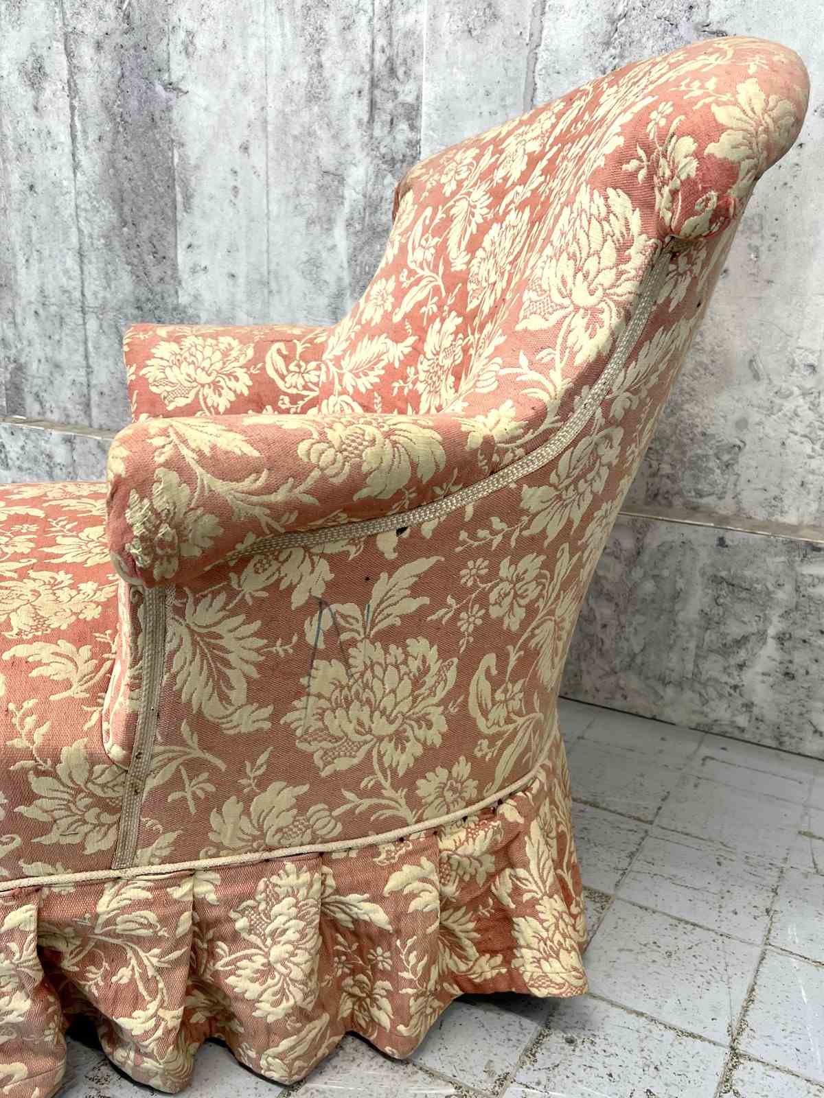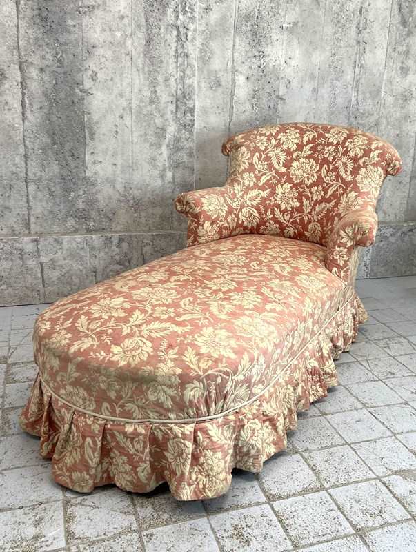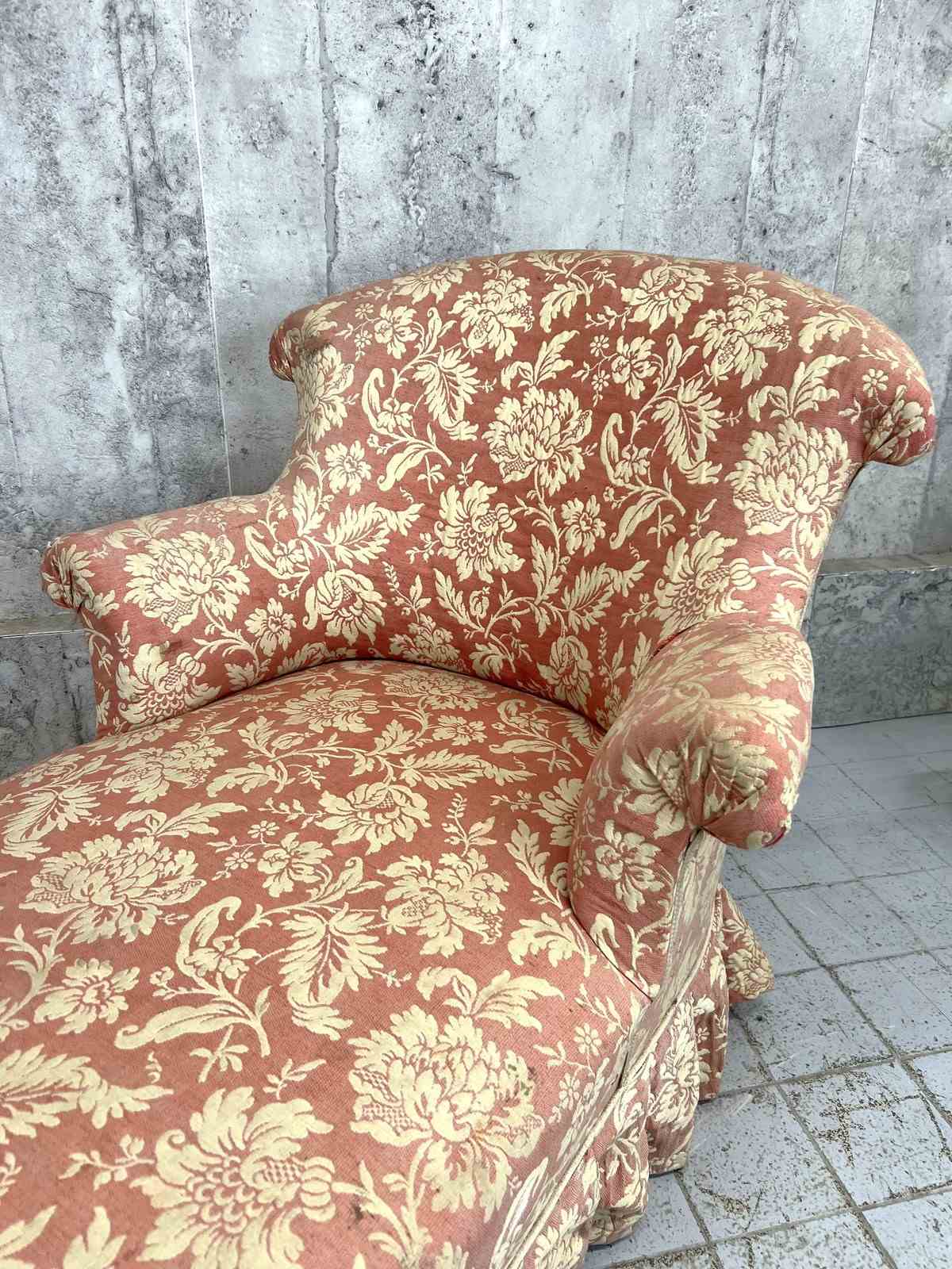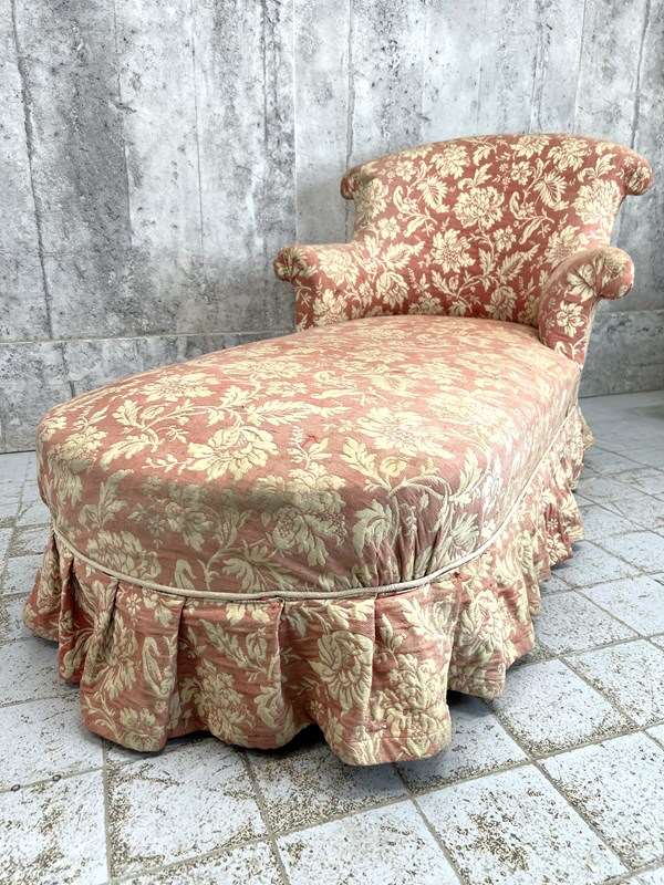A very beautiful Napoleon III chaise longue with turned legs and the original pink and cream jacquard fabric and upholstery. There are of course signs of wear to the fabric, discoloration and a split in the seam, but overall in lovely usable condition if you like the 'shabby' original look. The structure is sound, checked over by our own renovator. A beautiful and original piece. Ready to use as it is or you can reupholster should you prefer.