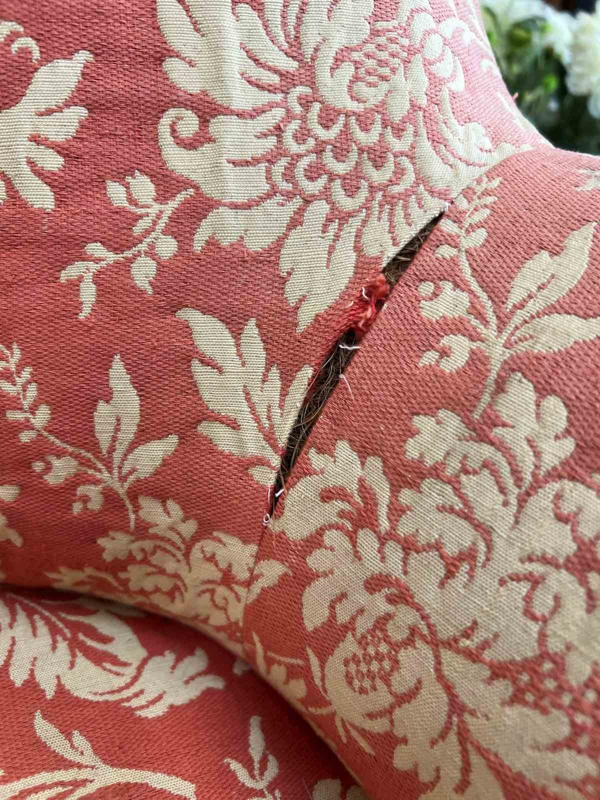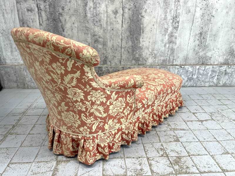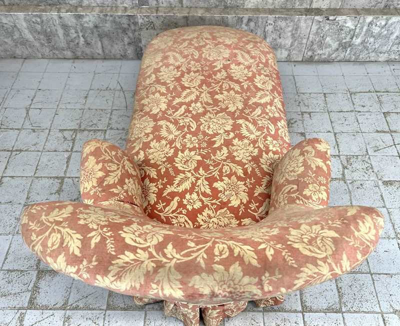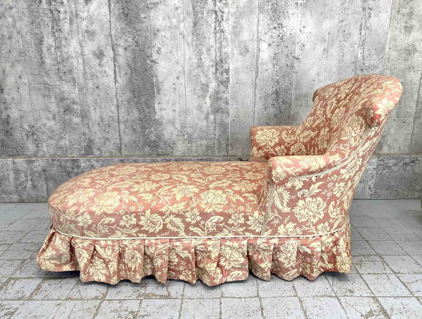 A very beautiful Napoleon III chaise longue with turned legs and the original pink and cream jacquard fabric and upholstery. There are of course signs of wear to the fabric, discoloration and a split in the seam, but overall in lovely usable condition if you like the 'shabby' original look. The structure is sound, checked over by our own renovator. A beautiful and original piece. Ready to use as it is or you can reupholster should you prefer.