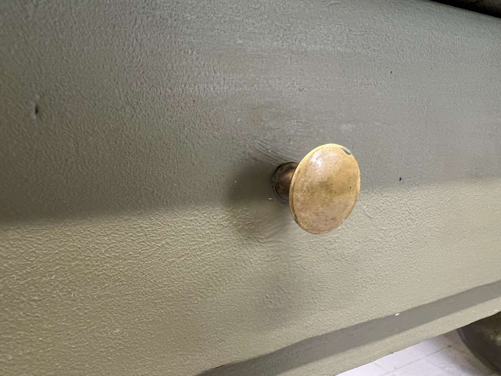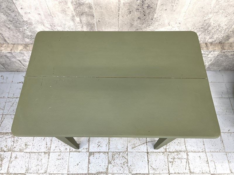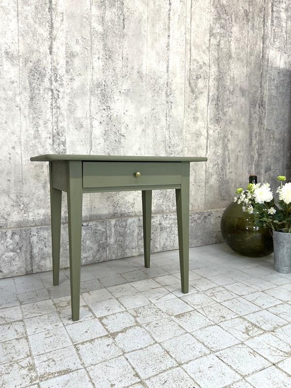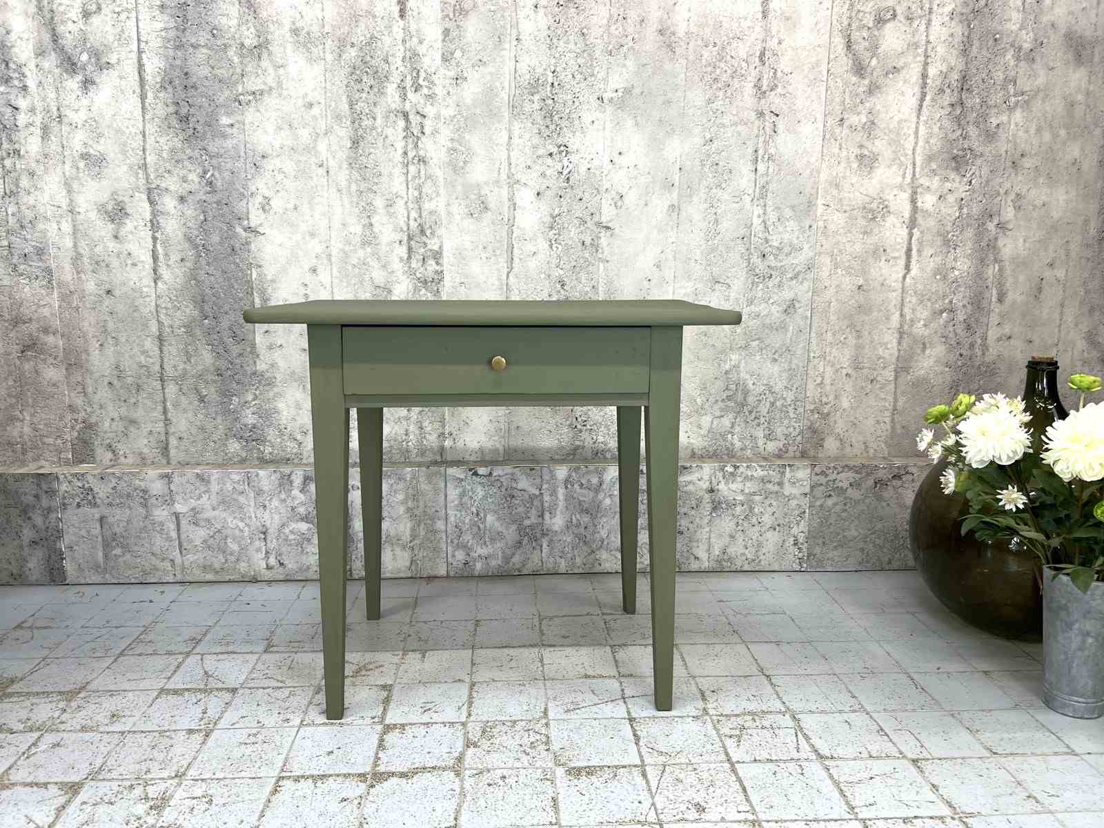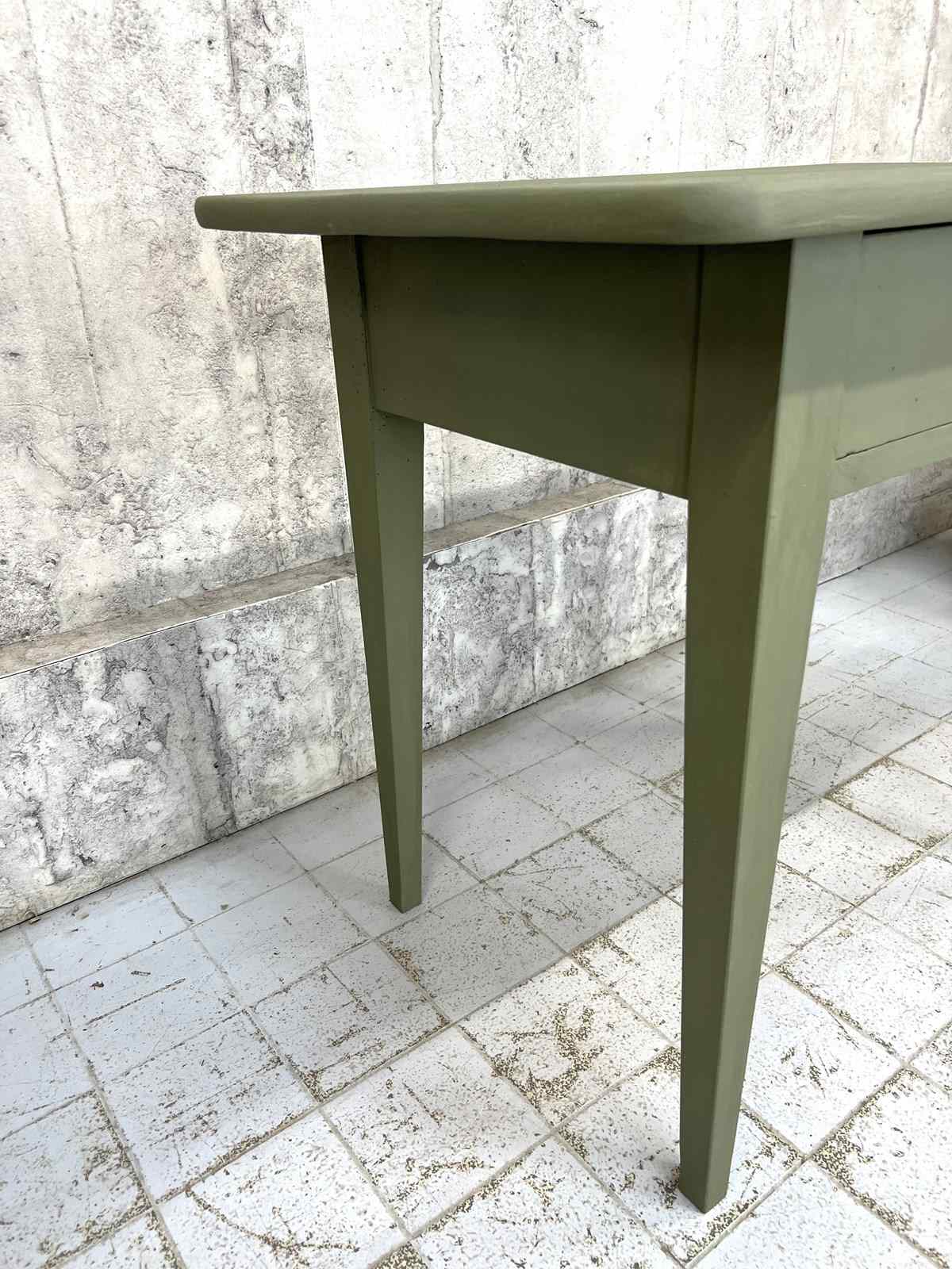 A very pretty, classic taper leg table which has been painted in this pretty olive green chalk paint with a useful drawer with the original drawer furniture. Ideal as a child's desk or a console able. Ready to use as it is.
