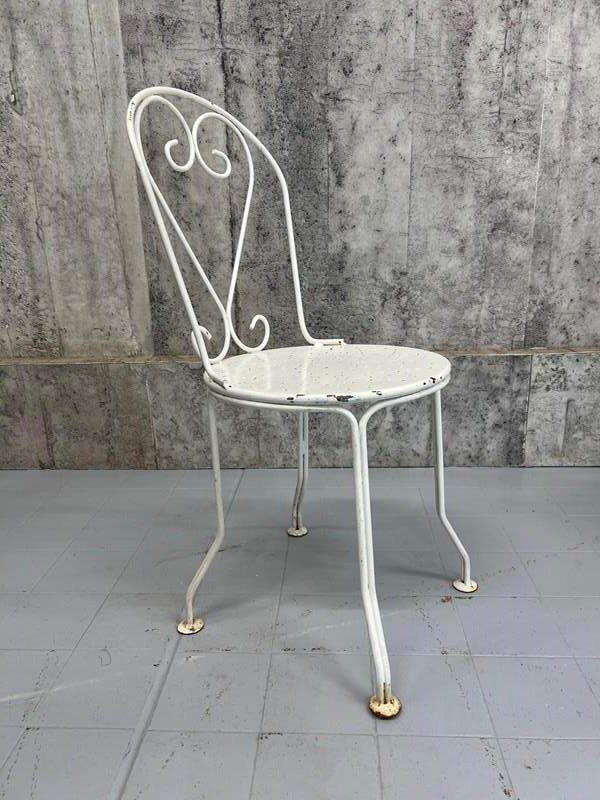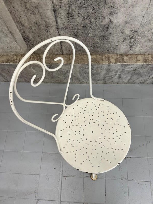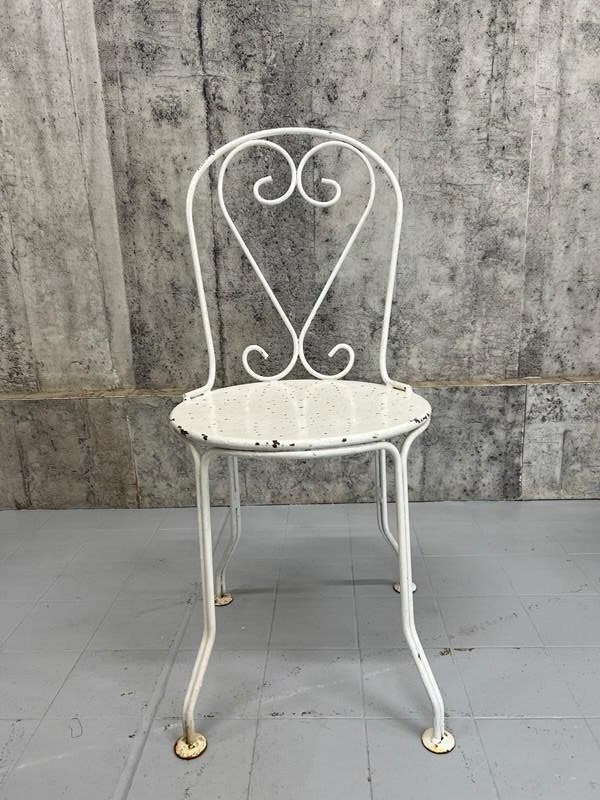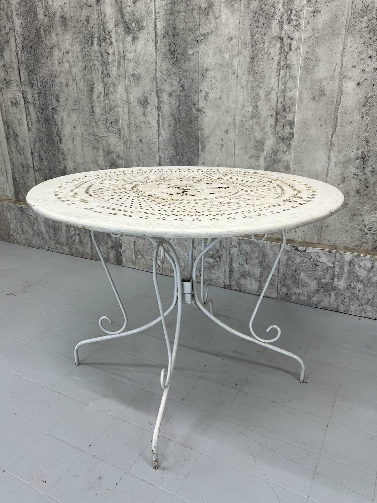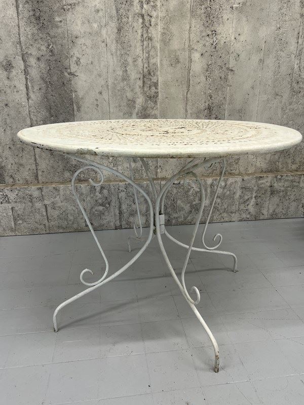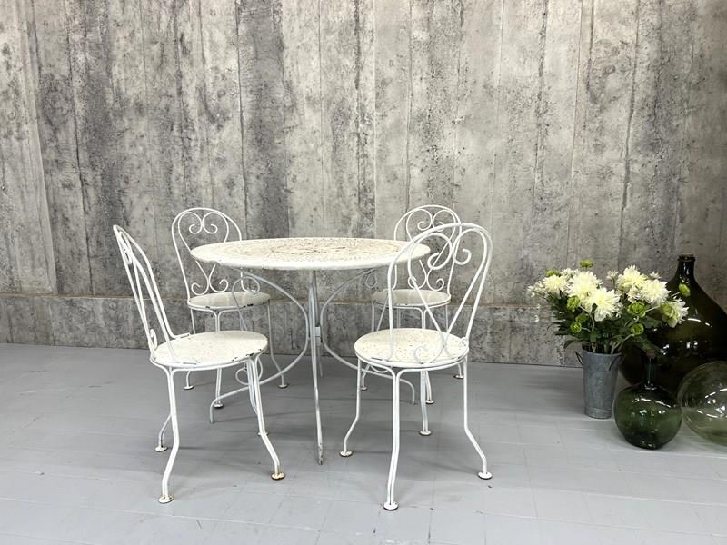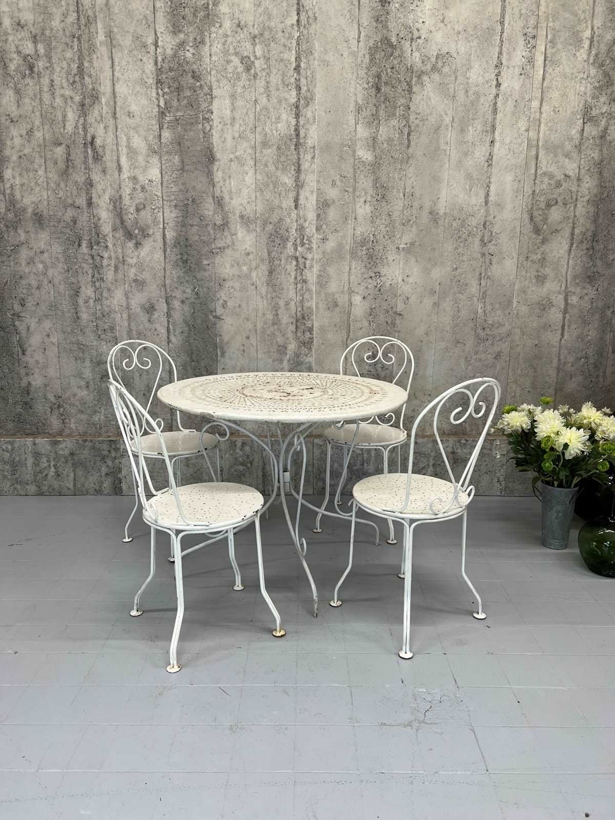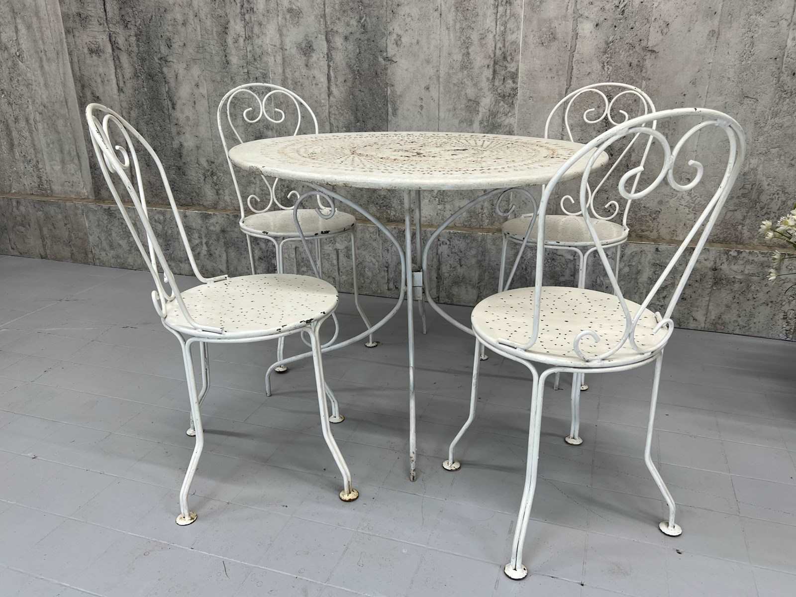 A fabulous set of a painted white circular garden table and 4 matching chairs. All have layers of paint and chips with light rust. Not too impact the structural integrity of the set however. Ideal for the garden or a terrace. Ready to use as they are or to repaint should you prefer. Classic French garden style.
