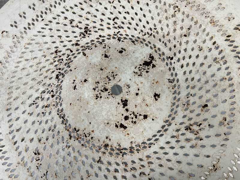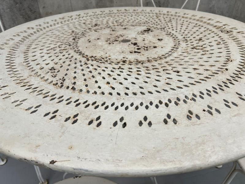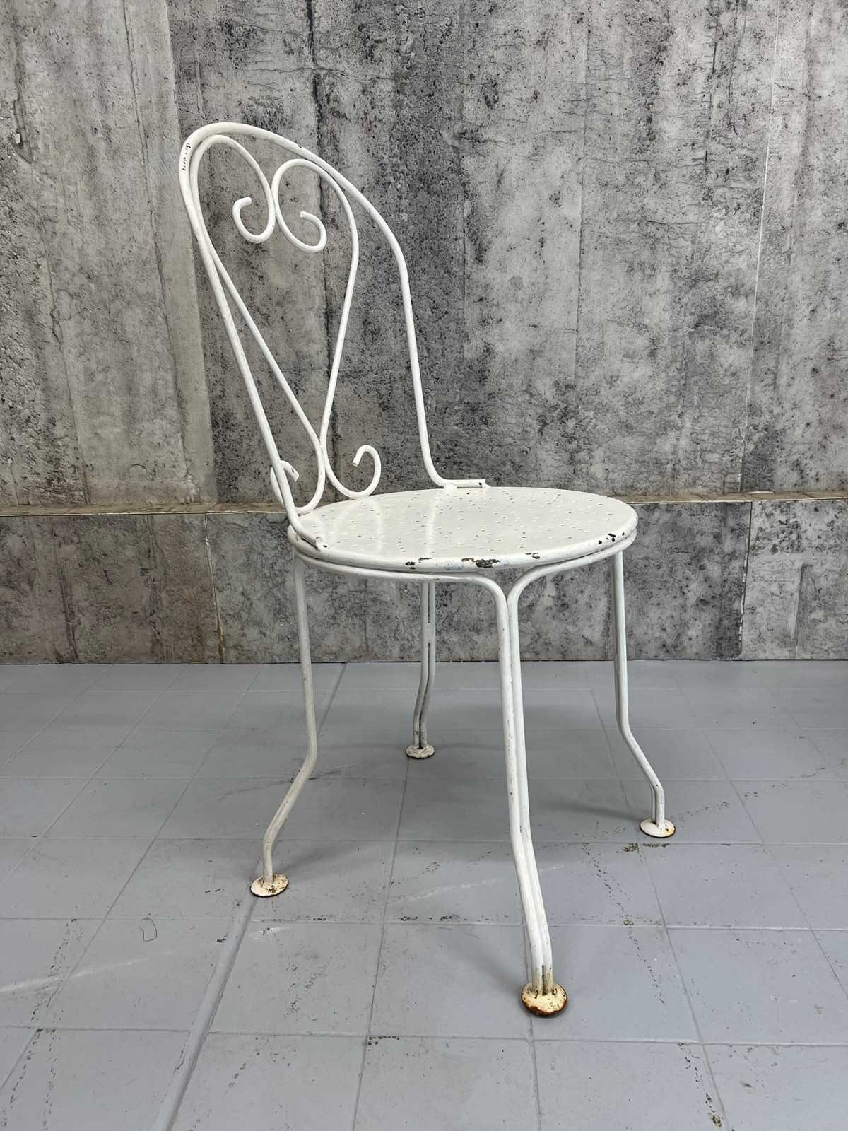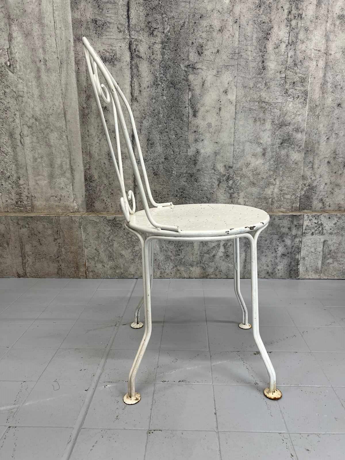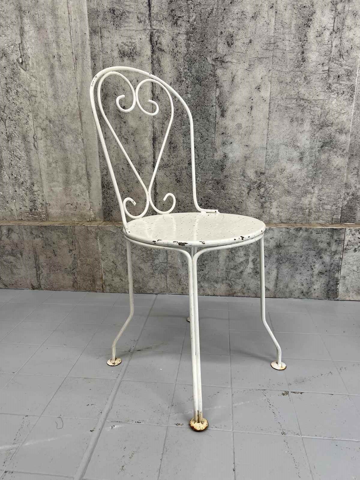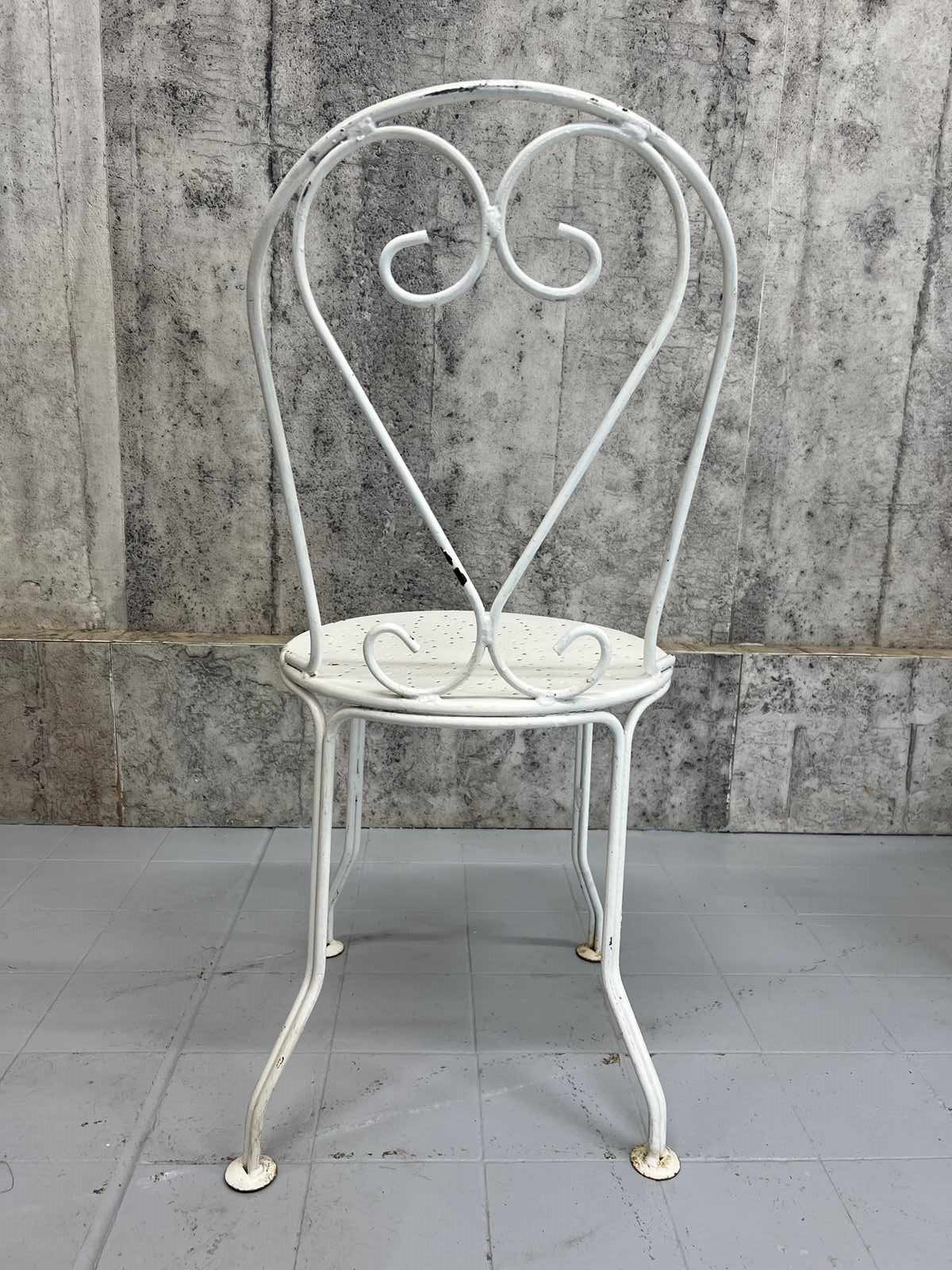 A fabulous set of a painted white circular garden table and 4 matching chairs. All have layers of paint and chips with light rust. Not too impact the structural integrity of the set however. Ideal for the garden or a terrace. Ready to use as they are or to repaint should you prefer. Classic French garden style.