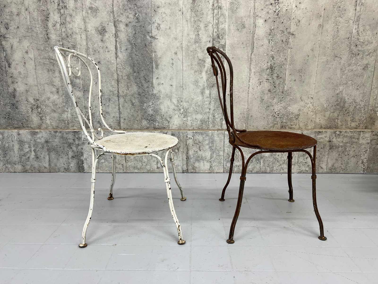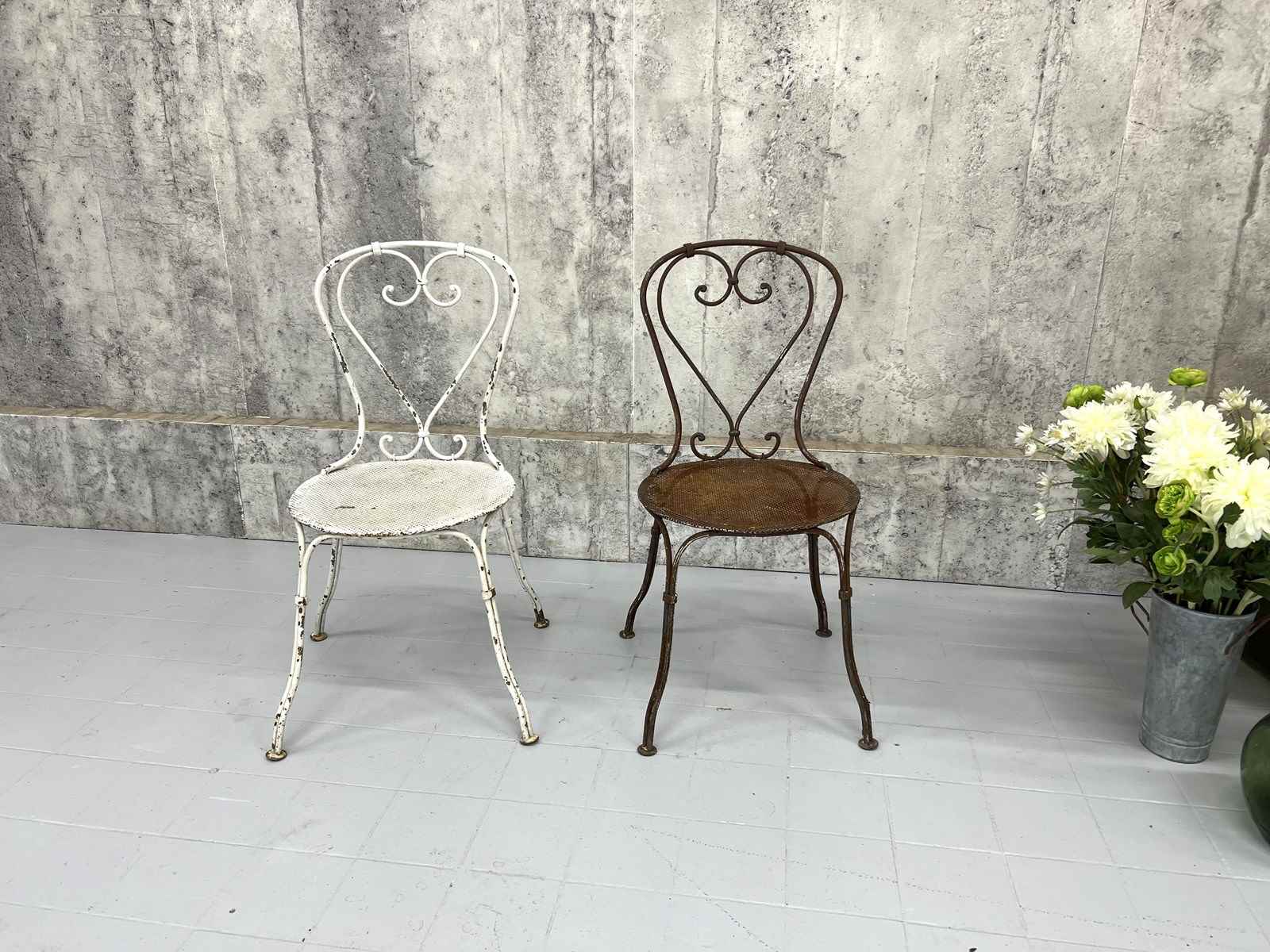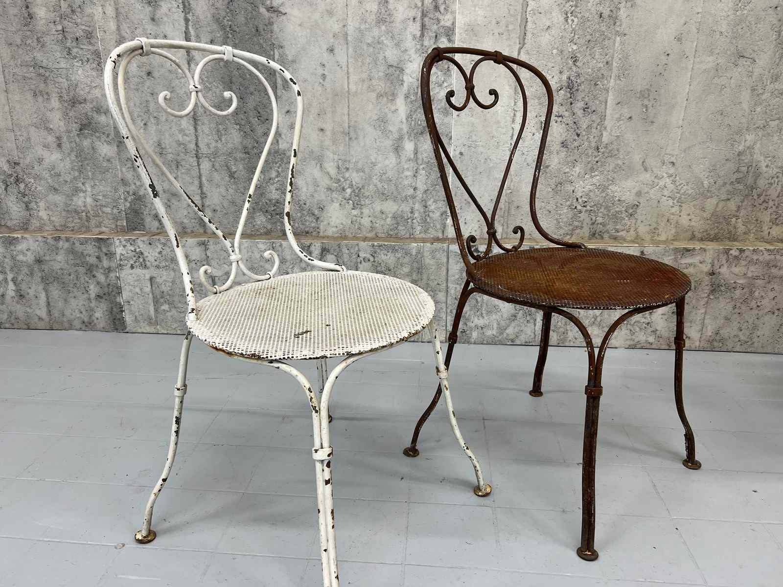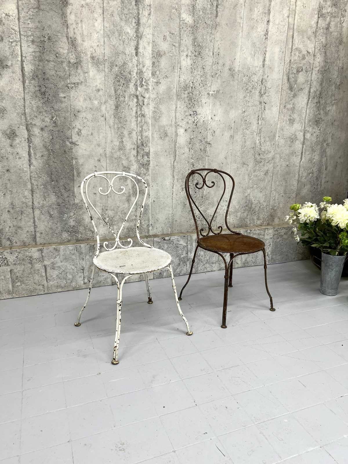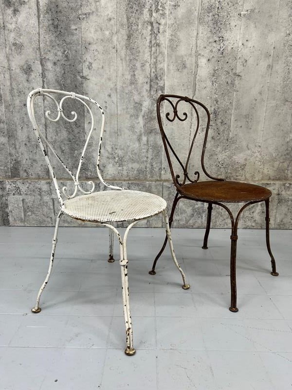 At first glance it may not be apparent, but this pair of antique metal garden chairs are in fact a matching pair. Admittedly, one has lost its paint layer and is now this fabulous rust coloured.. only superficial.. not structural.. and the second has the chipped white paint. These are a delightful pair and can either be left as they are or painted to match each other. Either way, these are a wonderful set.. heavy and ready to use as they are.