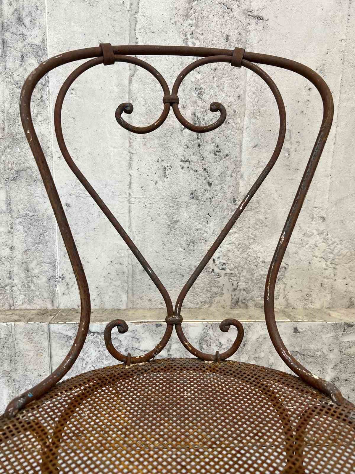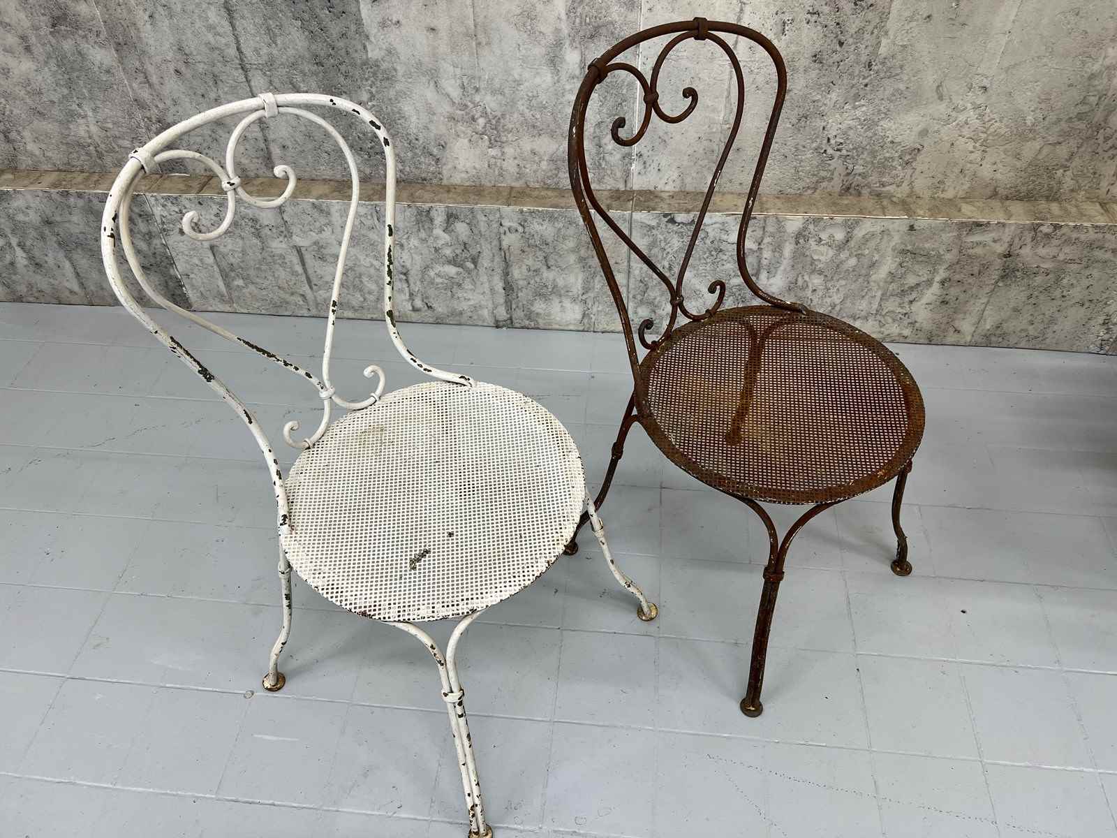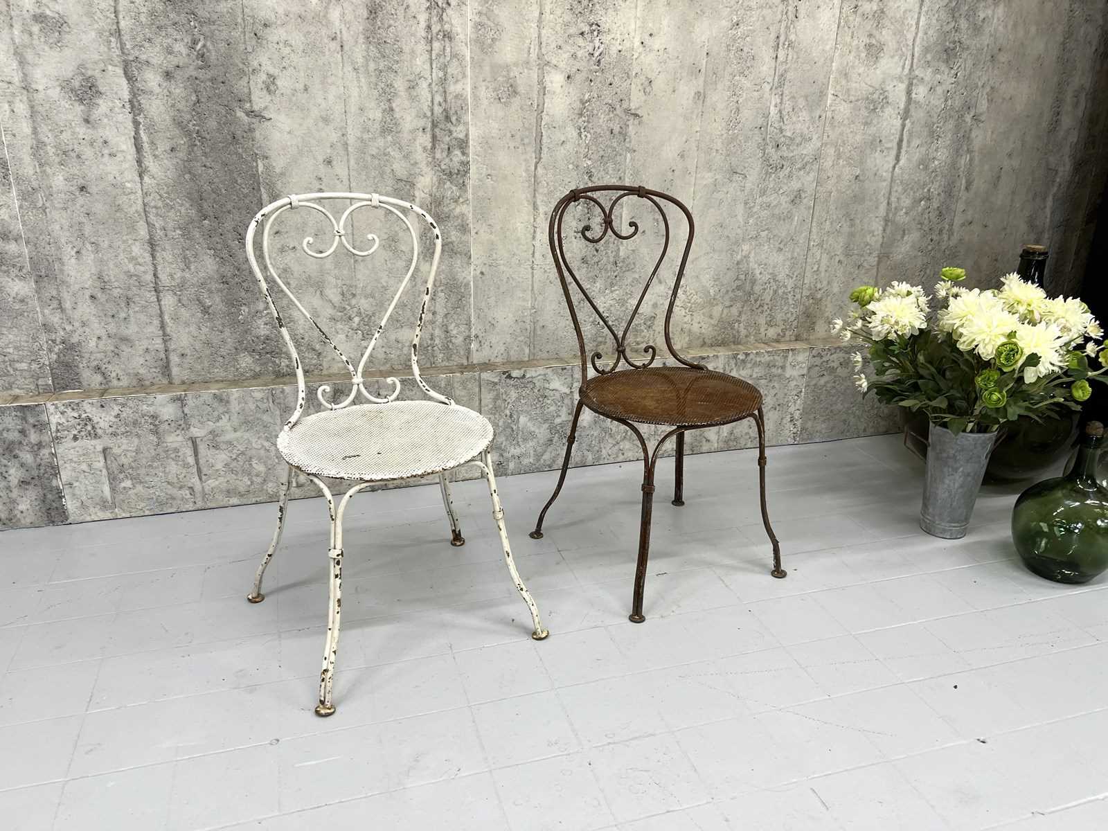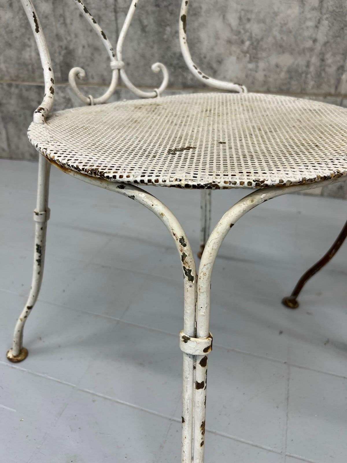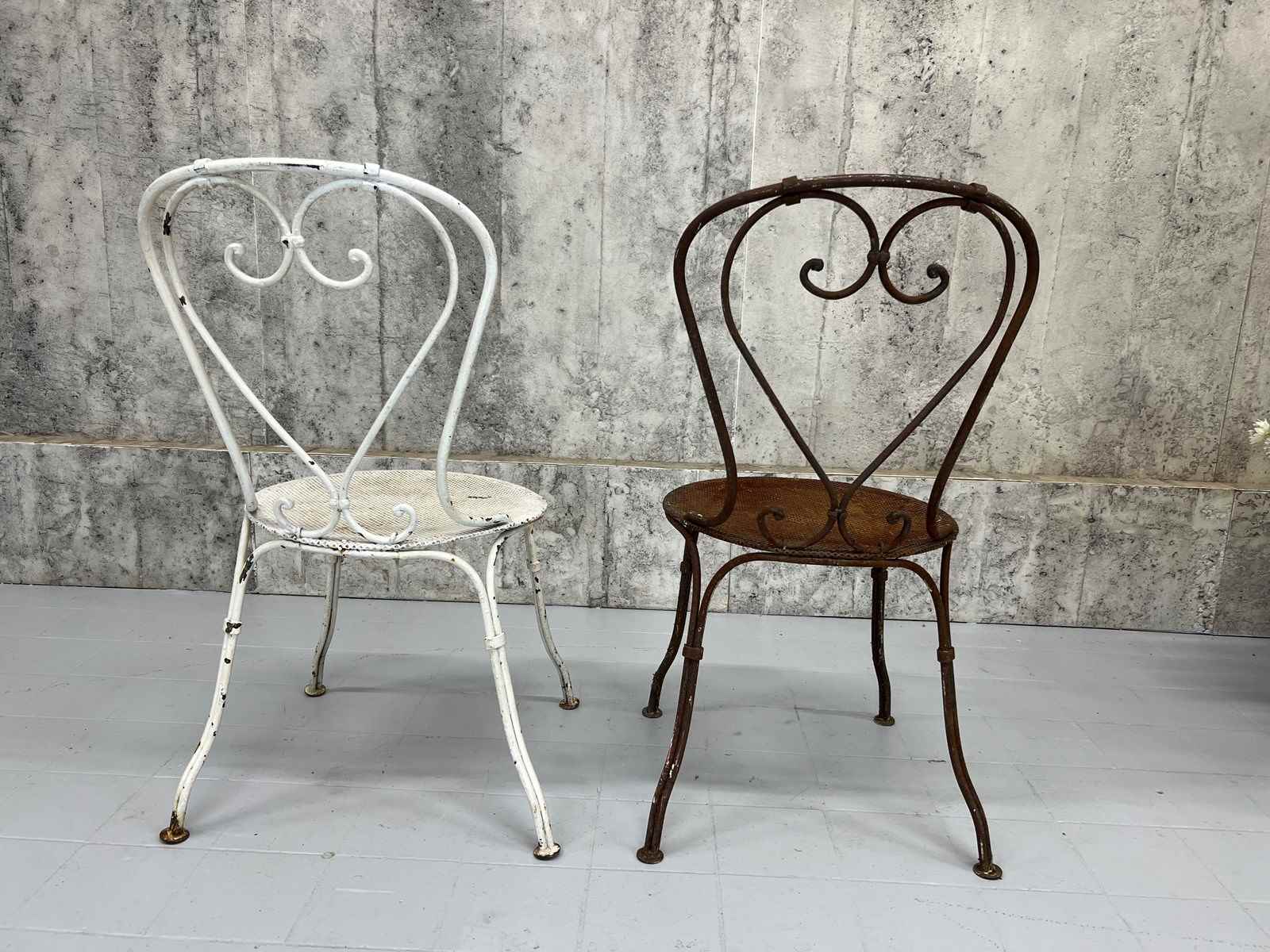 At first glance it may not be apparent, but this pair of antique metal garden chairs are in fact a matching pair. Admittedly, one has lost its paint layer and is now this fabulous rust coloured.. only superficial.. not structural.. and the second has the chipped white paint. These are a delightful pair and can either be left as they are or painted to match each other. Either way, these are a wonderful set.. heavy and ready to use as they are.