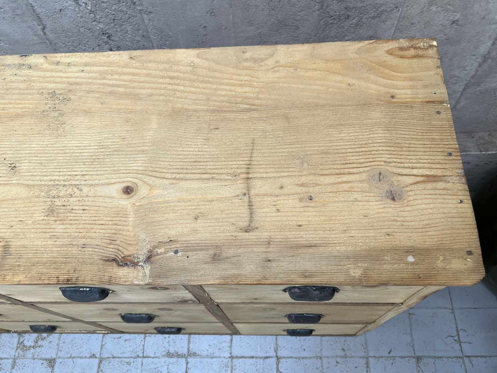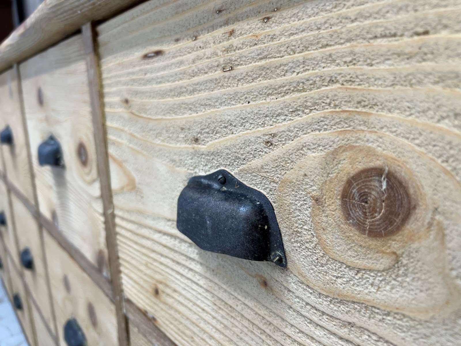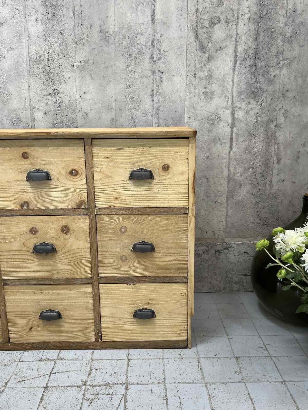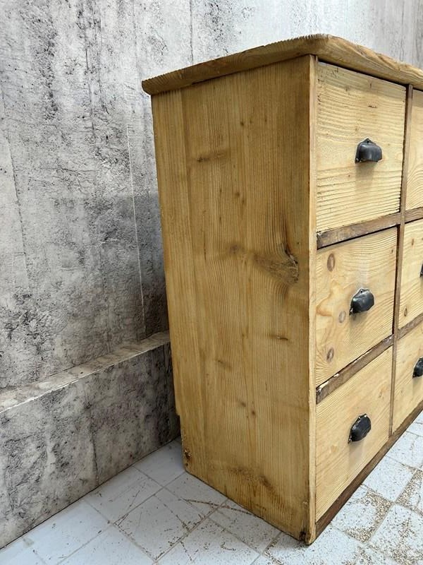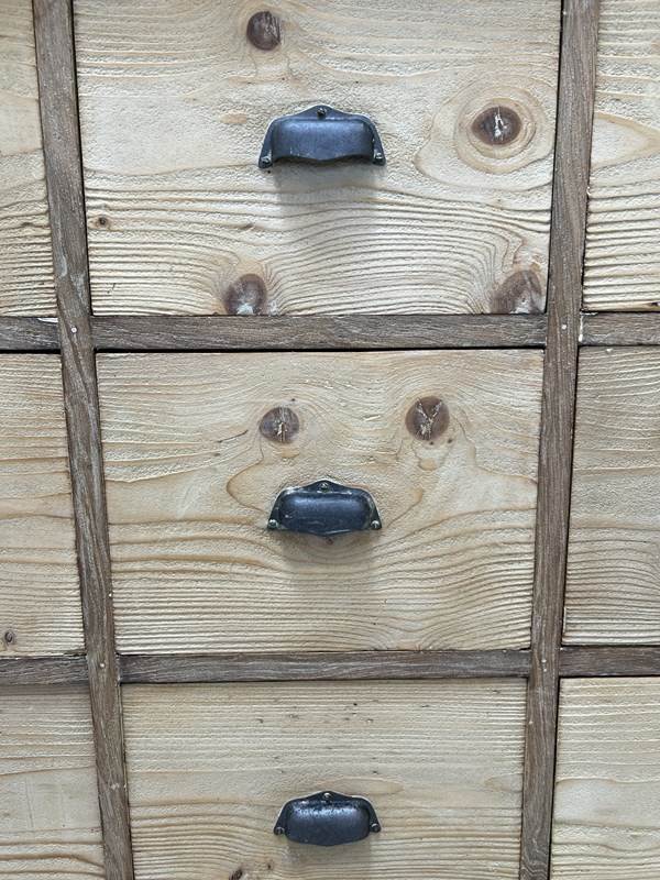 A fabulous set of drawers. Made originally for a pharmacy, for storing medications and products, this solid pine sideboard is a wonderful storage unit for really anything. The drawers are the correct size to store wine glasses and dining plates so is ideal for use as a freestanding kitchen unit. Also ideal to store candles and table linen in a dining space, clothes in a bedroom, shoes and hats in a hallway. I literally have a sideboard like this in every room in our home. With a small footprint they are ideal for adding a wow piece, ideal for massive storage and the ideal spot to create a focal point by dressing with your favorite artwork or object d'art or tv! The wood has been treated so that the grain is raised and textured. This softens with use, age and waxing. I love this detail about these drawers, is that these were always designed to be painted, so the carpenter made the piece from wood he had available, and you can see on this one, that the carcass and drawer fronts are the pitch pine and the internal structure from a darker, daker wood. I love to see these characteristics exposed. A fabulous set of drawers, rustic to touch and hugely practical and always a statement.