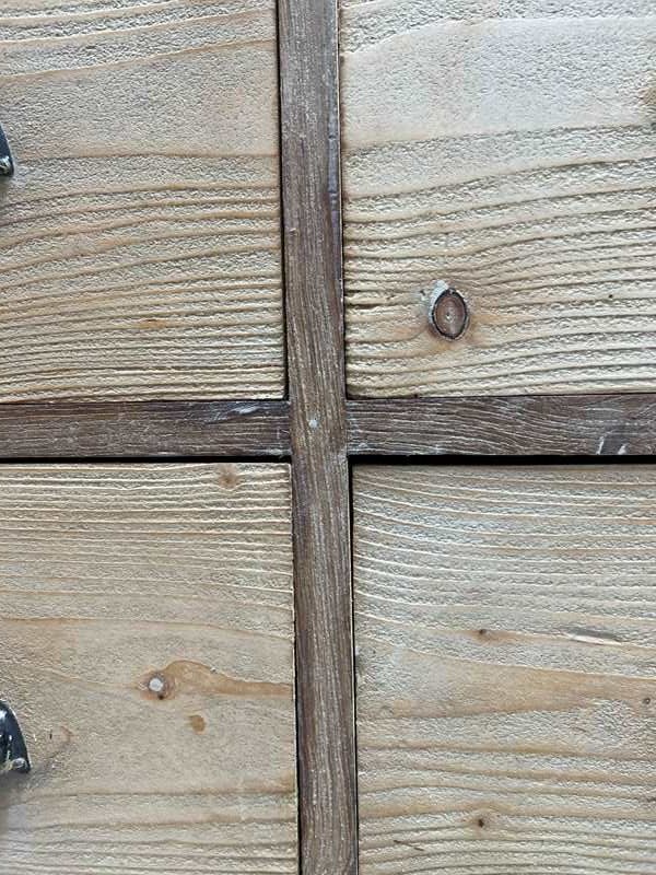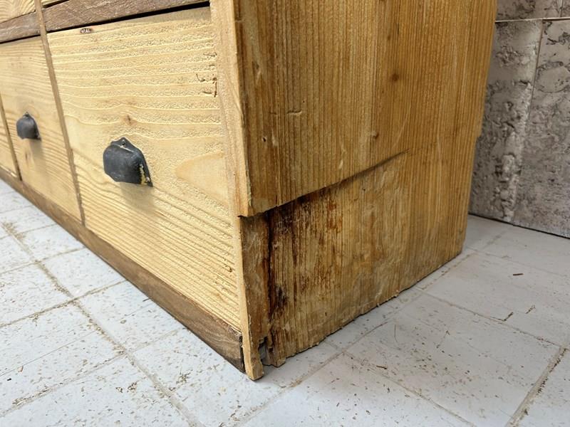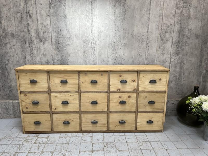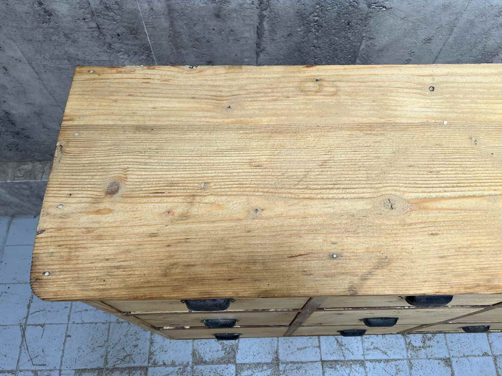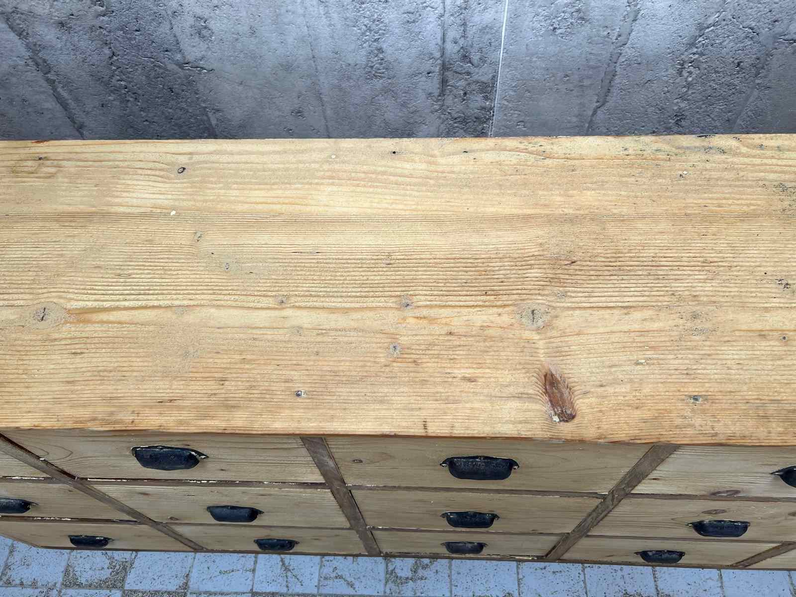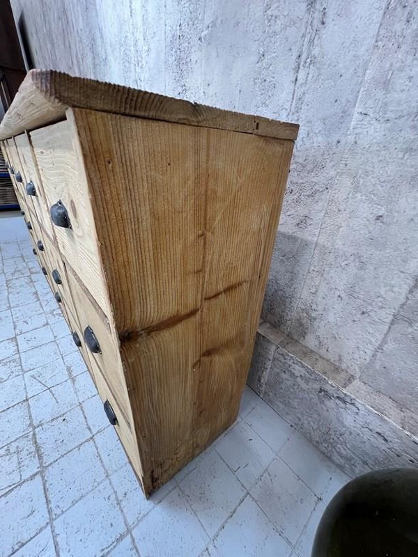 A fabulous set of drawers. Made originally for a pharmacy, for storing medications and products, this solid pine sideboard is a wonderful storage unit for really anything. The drawers are the correct size to store wine glasses and dining plates so is ideal for use as a freestanding kitchen unit. Also ideal to store candles and table linen in a dining space, clothes in a bedroom, shoes and hats in a hallway. I literally have a sideboard like this in every room in our home. With a small footprint they are ideal for adding a wow piece, ideal for massive storage and the ideal spot to create a focal point by dressing with your favorite artwork or object d'art or tv! The wood has been treated so that the grain is raised and textured. This softens with use, age and waxing. I love this detail about these drawers, is that these were always designed to be painted, so the carpenter made the piece from wood he had available, and you can see on this one, that the carcass and drawer fronts are the pitch pine and the internal structure from a darker, daker wood. I love to see these characteristics exposed. A fabulous set of drawers, rustic to touch and hugely practical and always a statement.