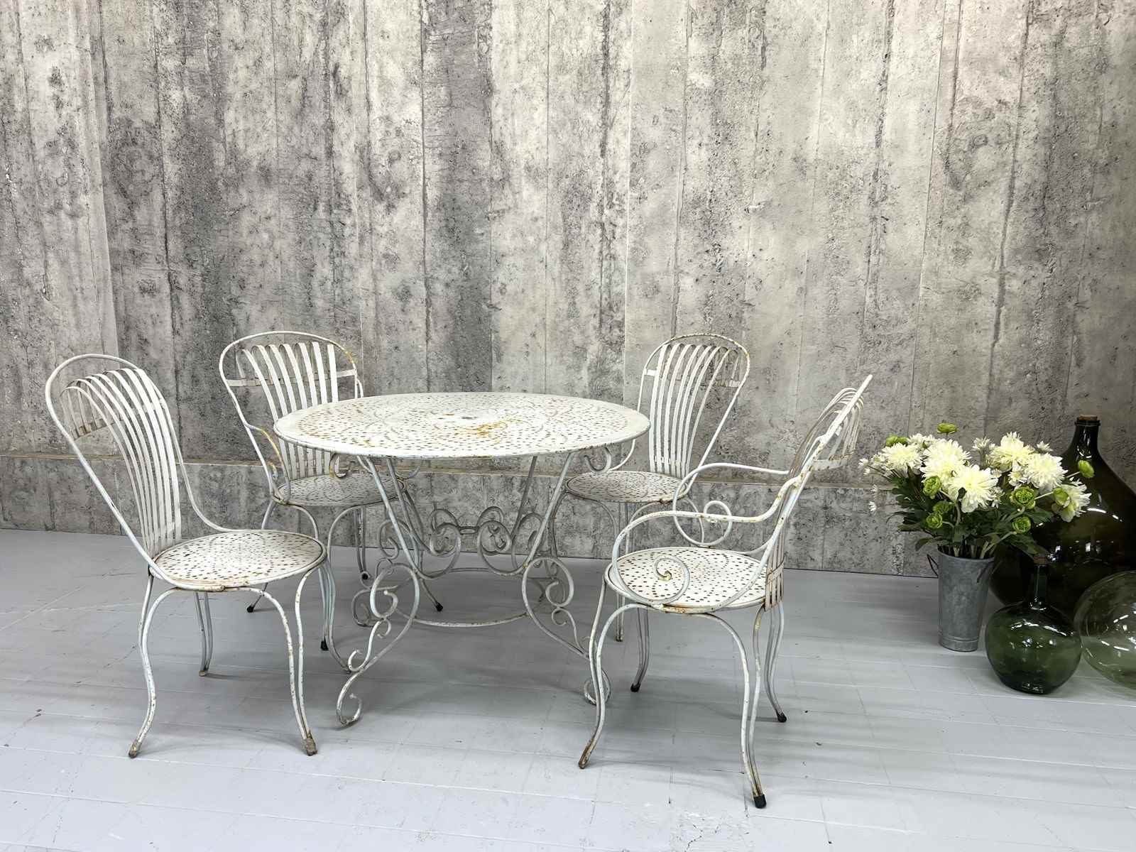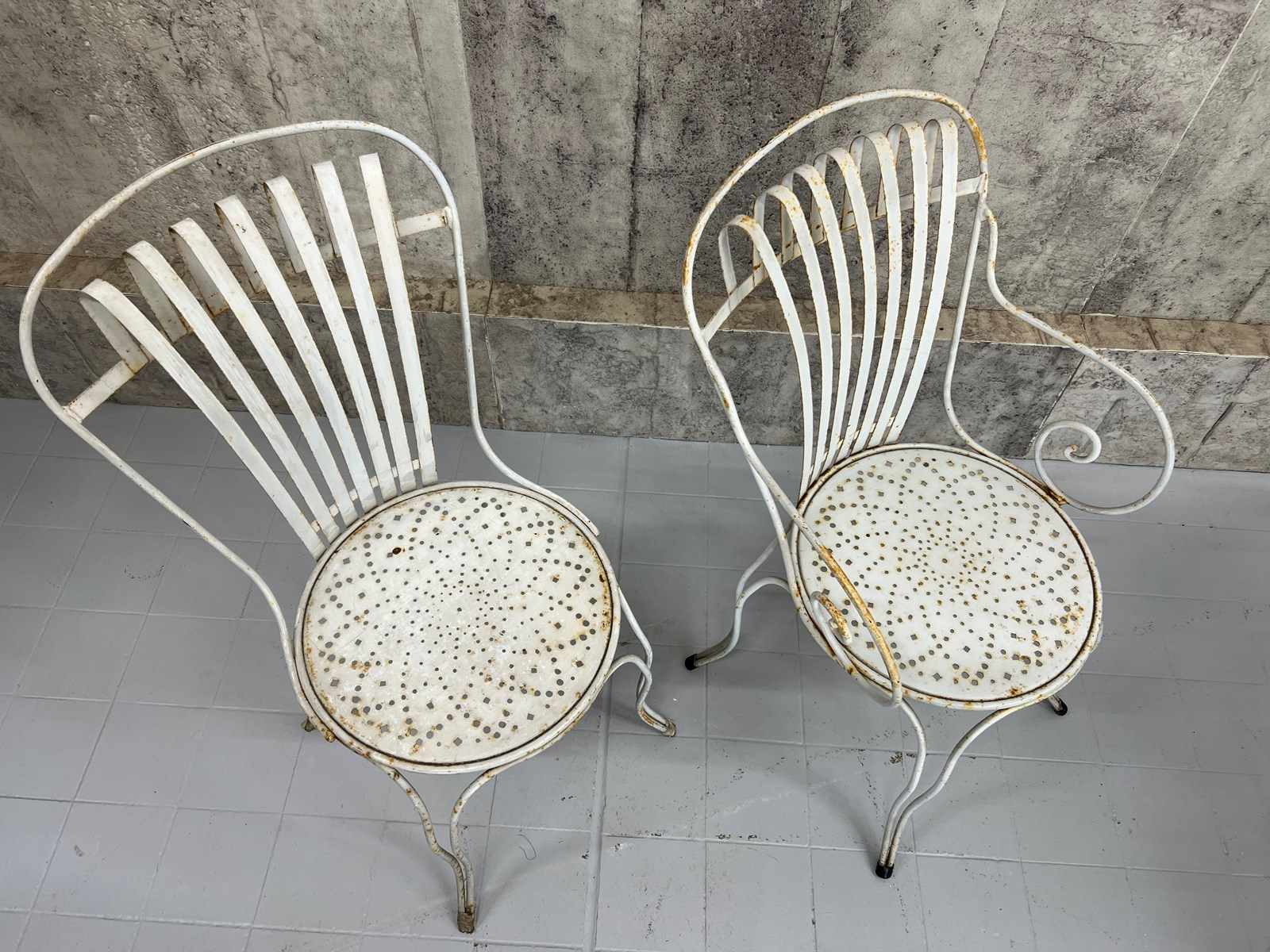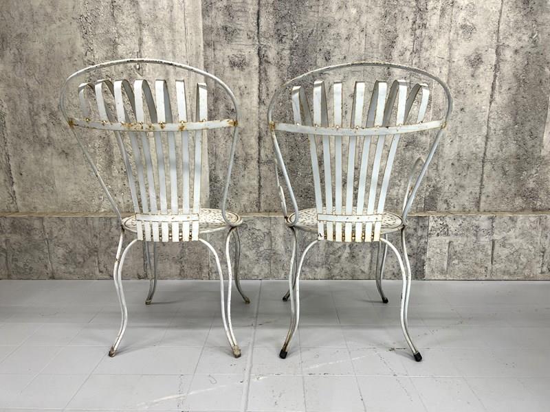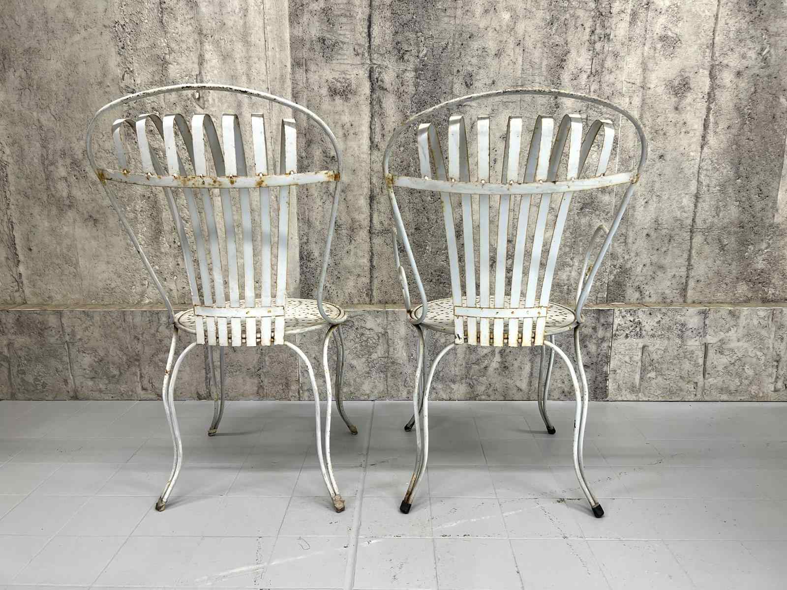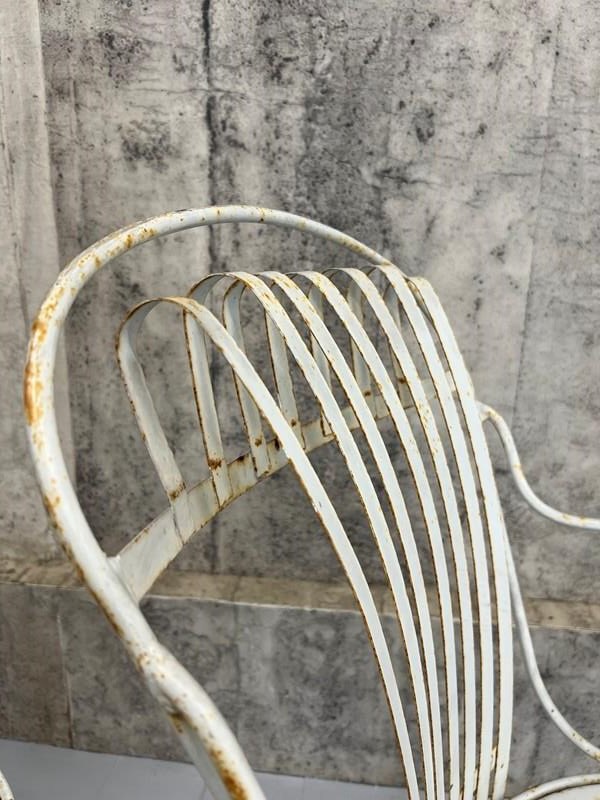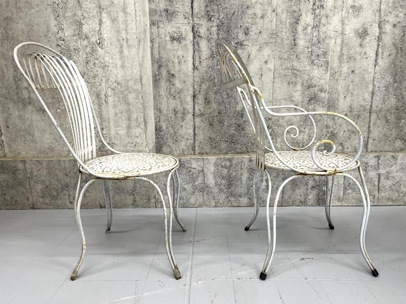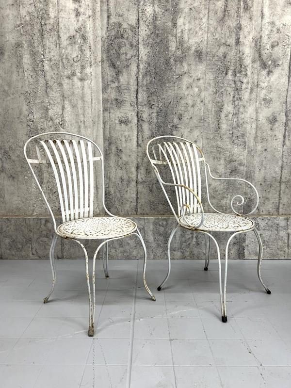 A rare and fabulous set of white metal garden chairs with the original chippy paint. There are two carvers and two chairs, with the most wonderful backs that have a slight spring to them, due to the design, which makes the chairs so comfortable. The lines and shapes in the design of the chair is absolutely wonderful. A matching set, ready to use as they are. There are areas of light rust, perfectly weathered, but not through the metal.