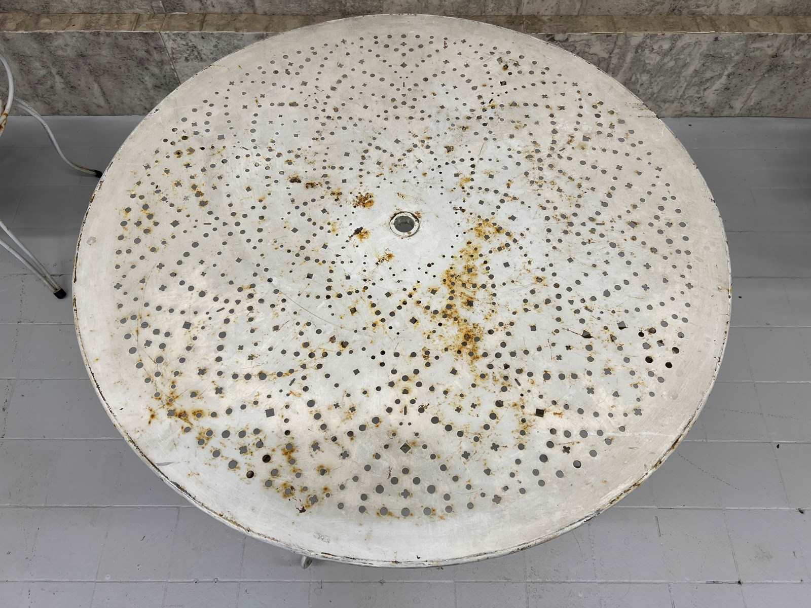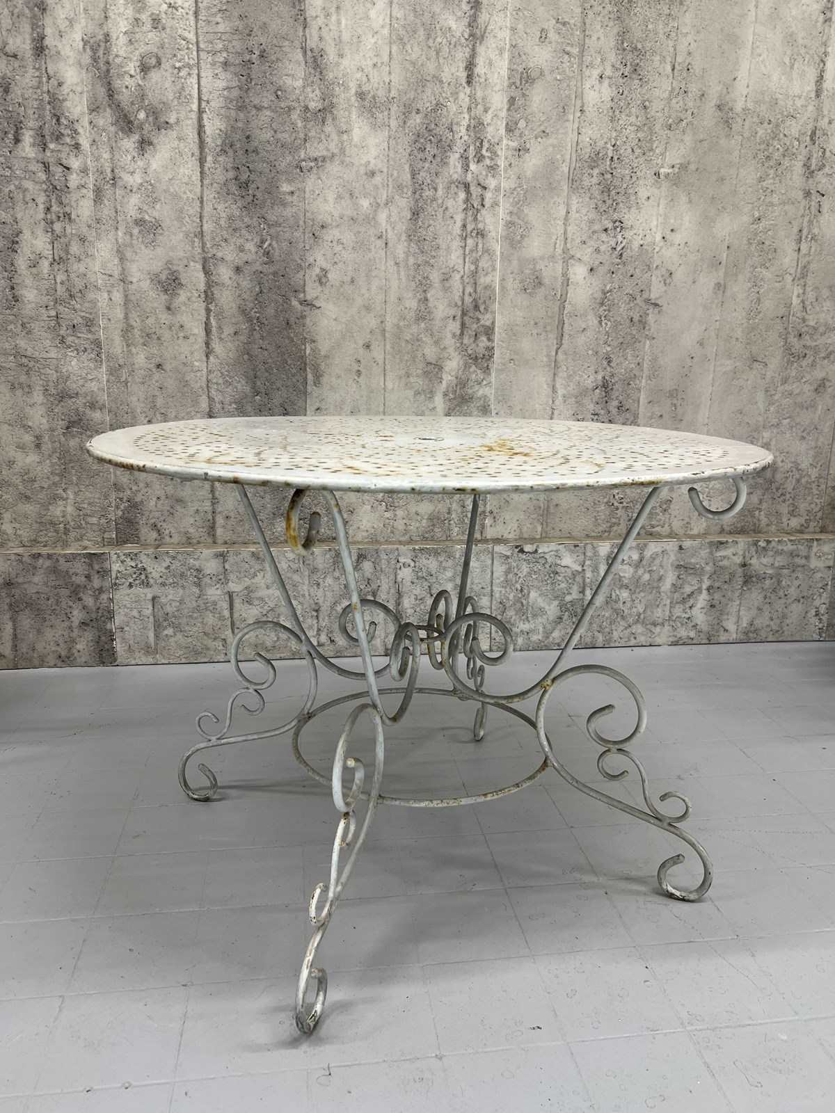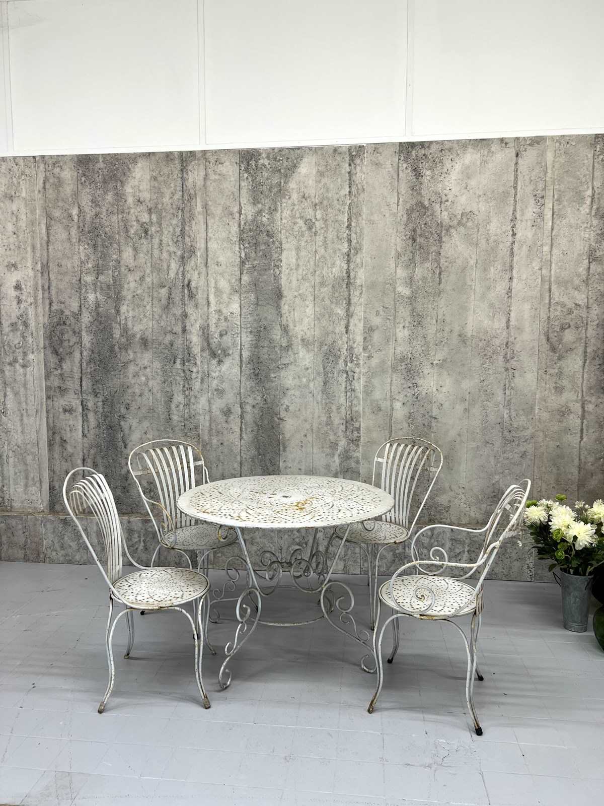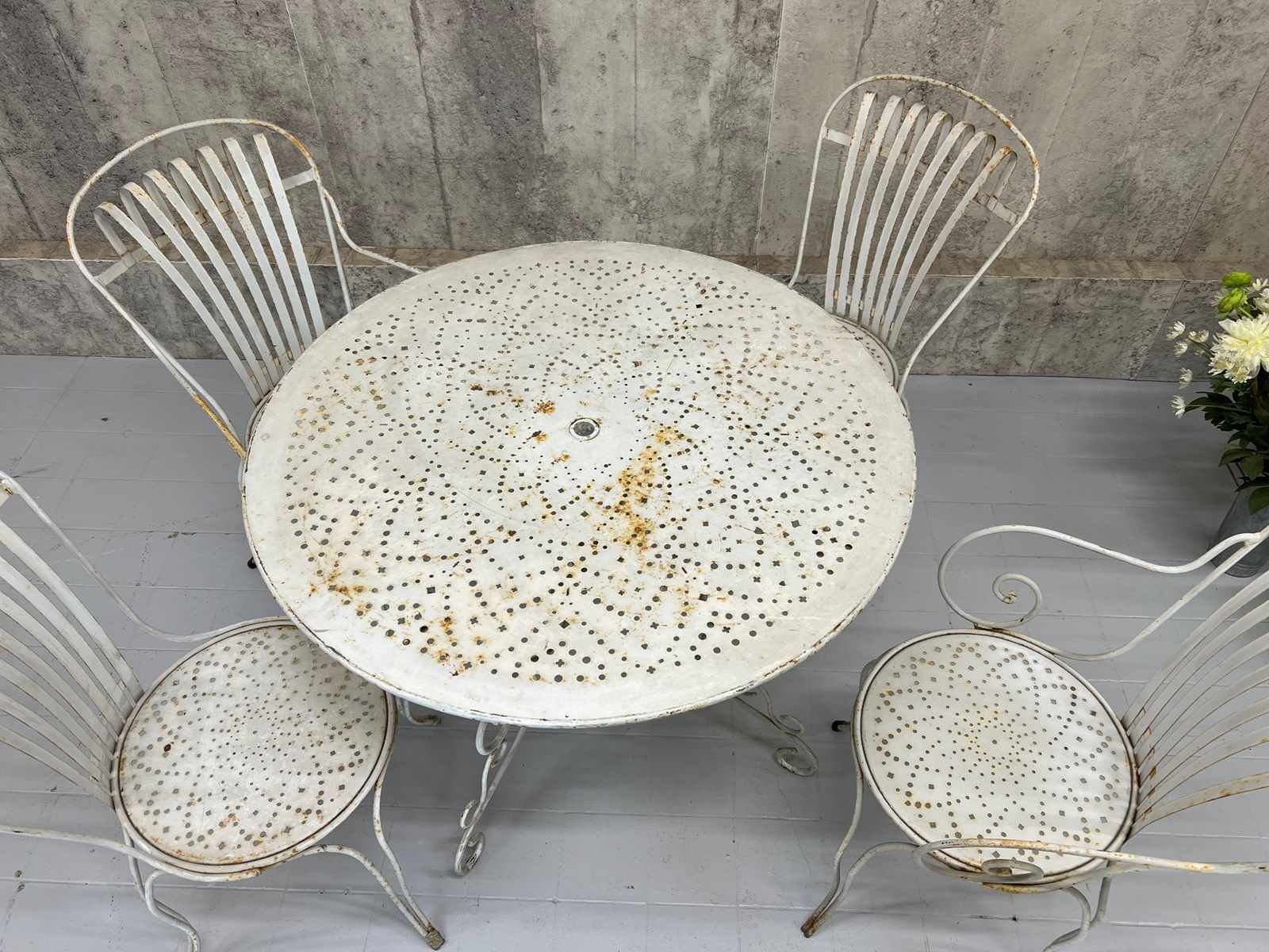 A rare and fabulous set of white metal garden chairs with the original chippy paint. There are two carvers and two chairs, with the most wonderful backs that have a slight spring to them, due to the design, which makes the chairs so comfortable. The lines and shapes in the design of the chair is absolutely wonderful. A matching set, ready to use as they are. There are areas of light rust, perfectly weathered, but not through the metal.