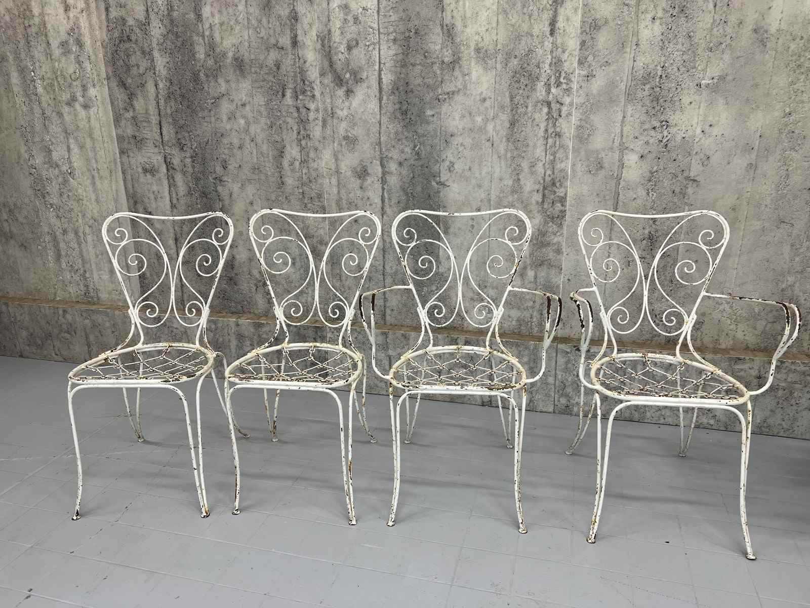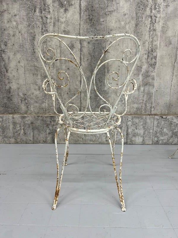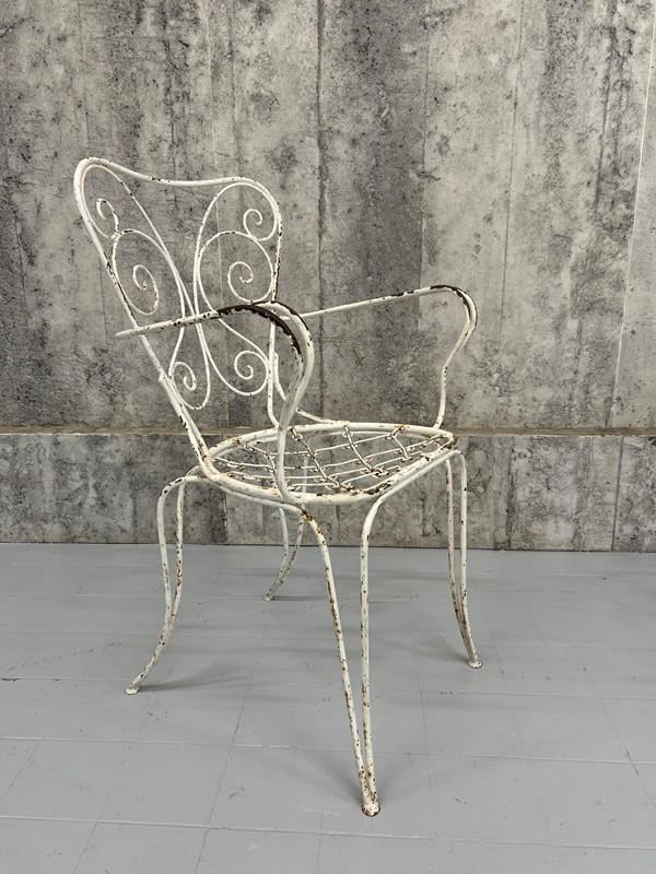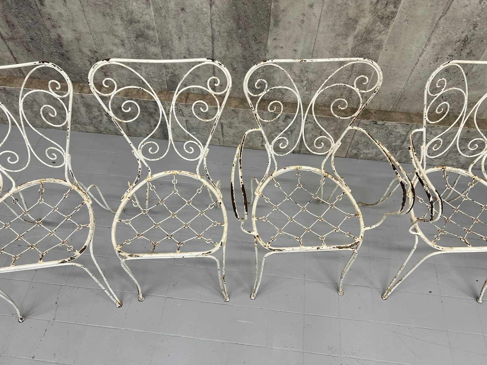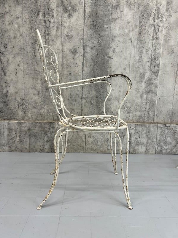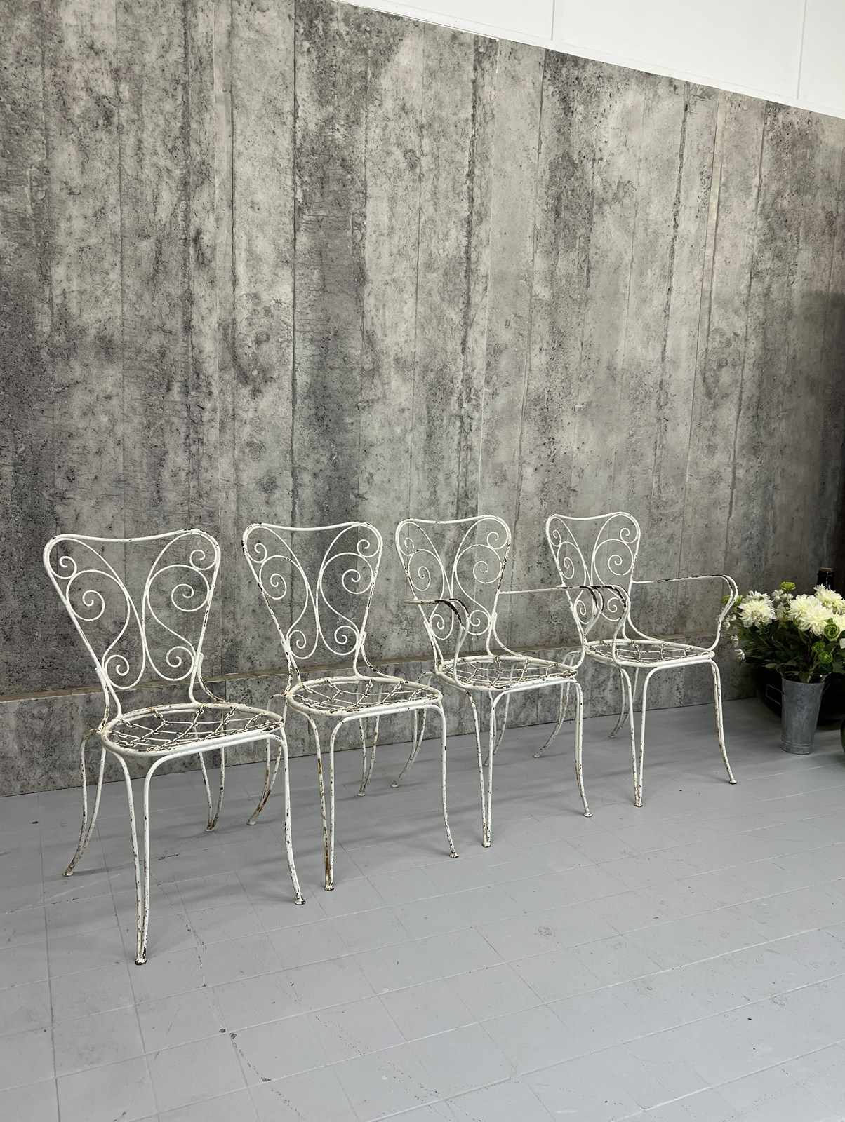 An incredible set of four matching white metal garden chairs dating early to mid 20th century. Two carvers and two chairs In wonderful condition, with the odd loss of paint and rise of rust here and there, as you would expect, all in accordance to the age and wear of the set. Marry with a modern table or a vintage table to suit your style. Ready to use as they are.. they just need a lovely cushion to finish them off.