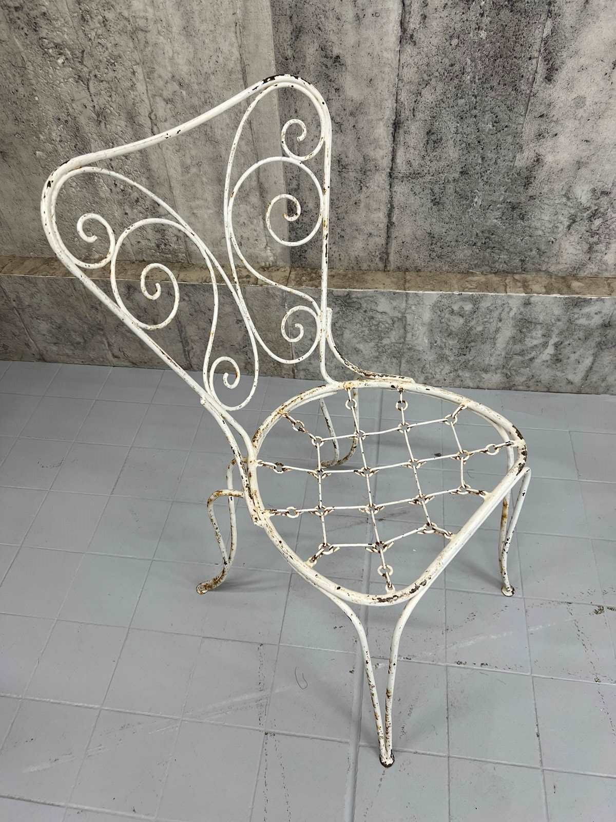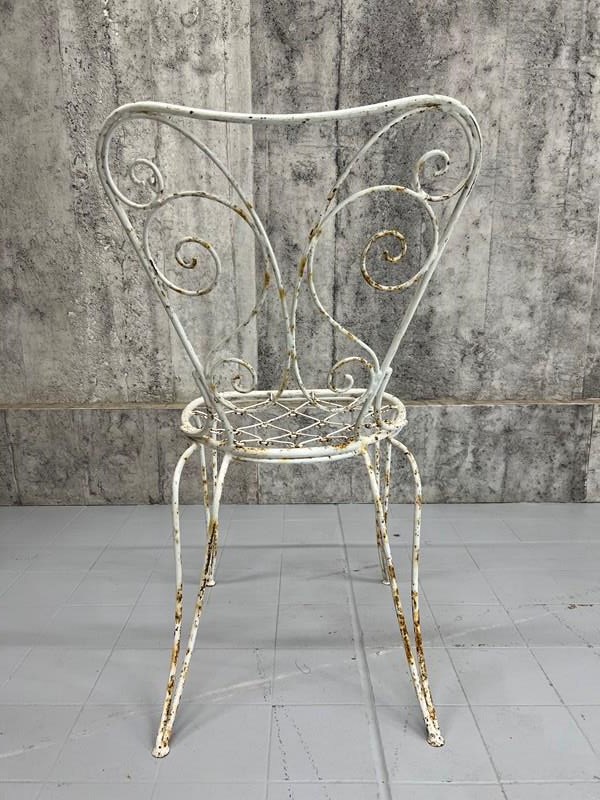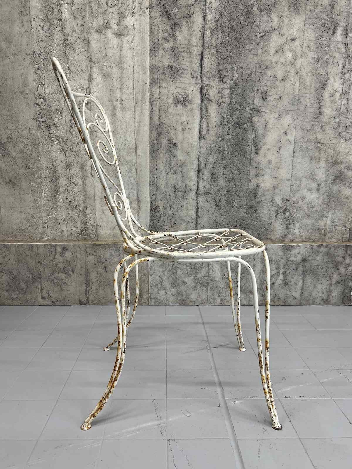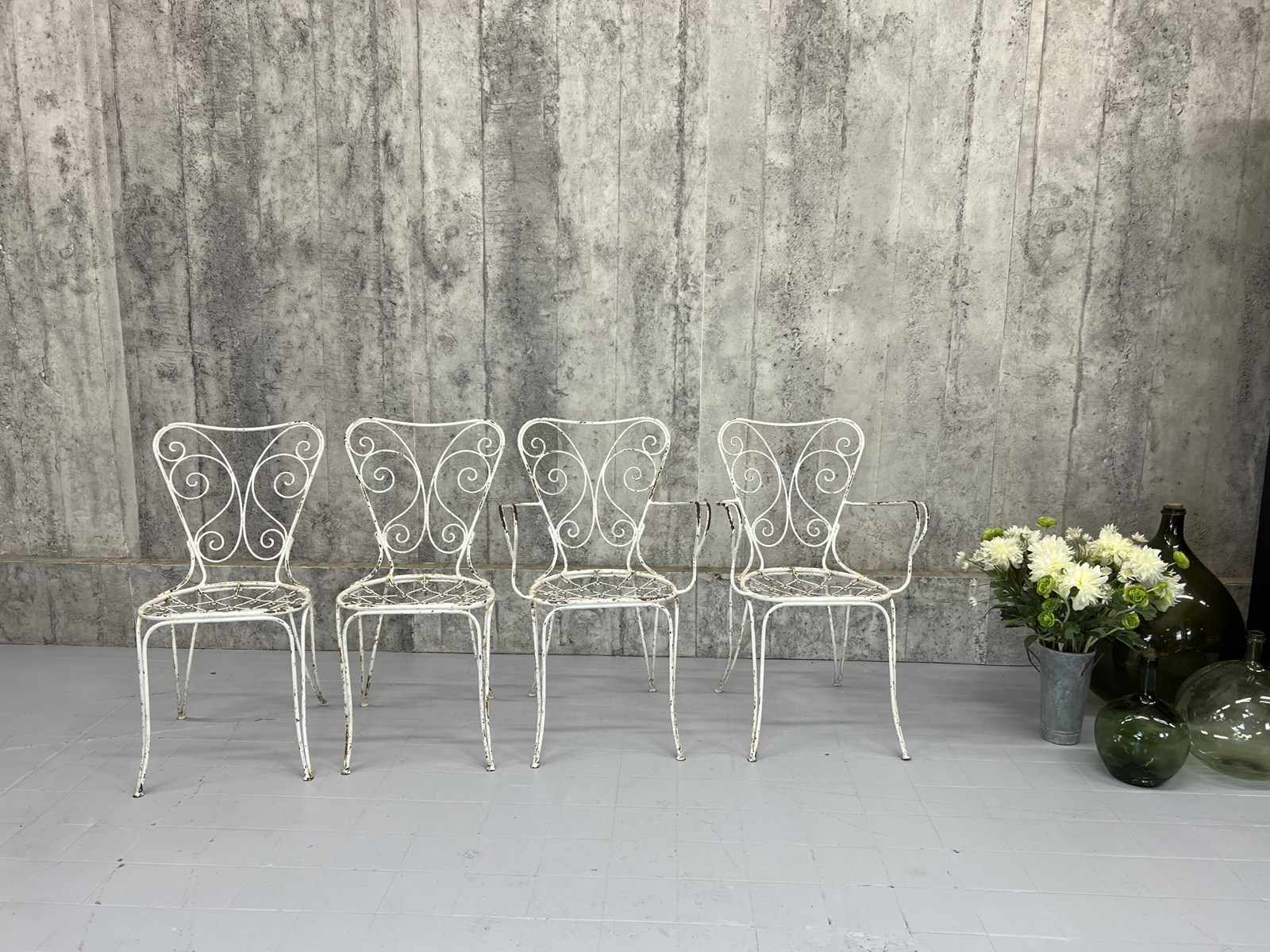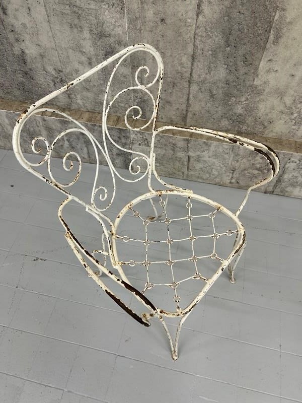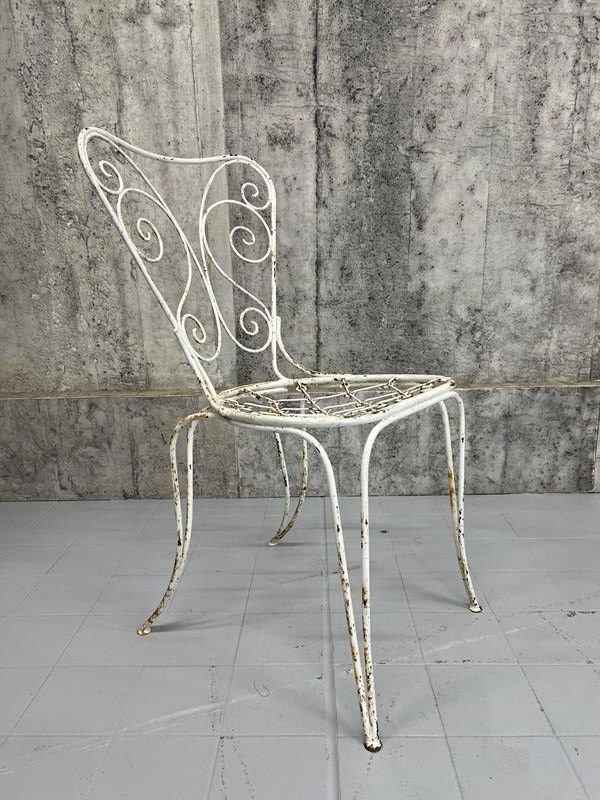 An incredible set of four matching white metal garden chairs dating early to mid 20th century. Two carvers and two chairs In wonderful condition, with the odd loss of paint and rise of rust here and there, as you would expect, all in accordance to the age and wear of the set. Marry with a modern table or a vintage table to suit your style. Ready to use as they are.. they just need a lovely cushion to finish them off.