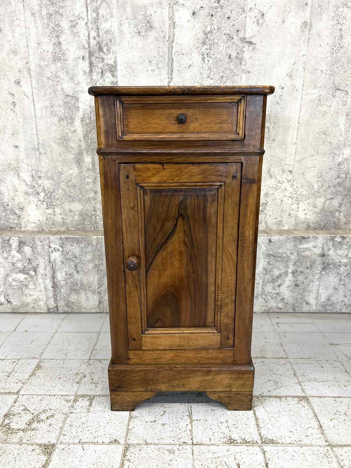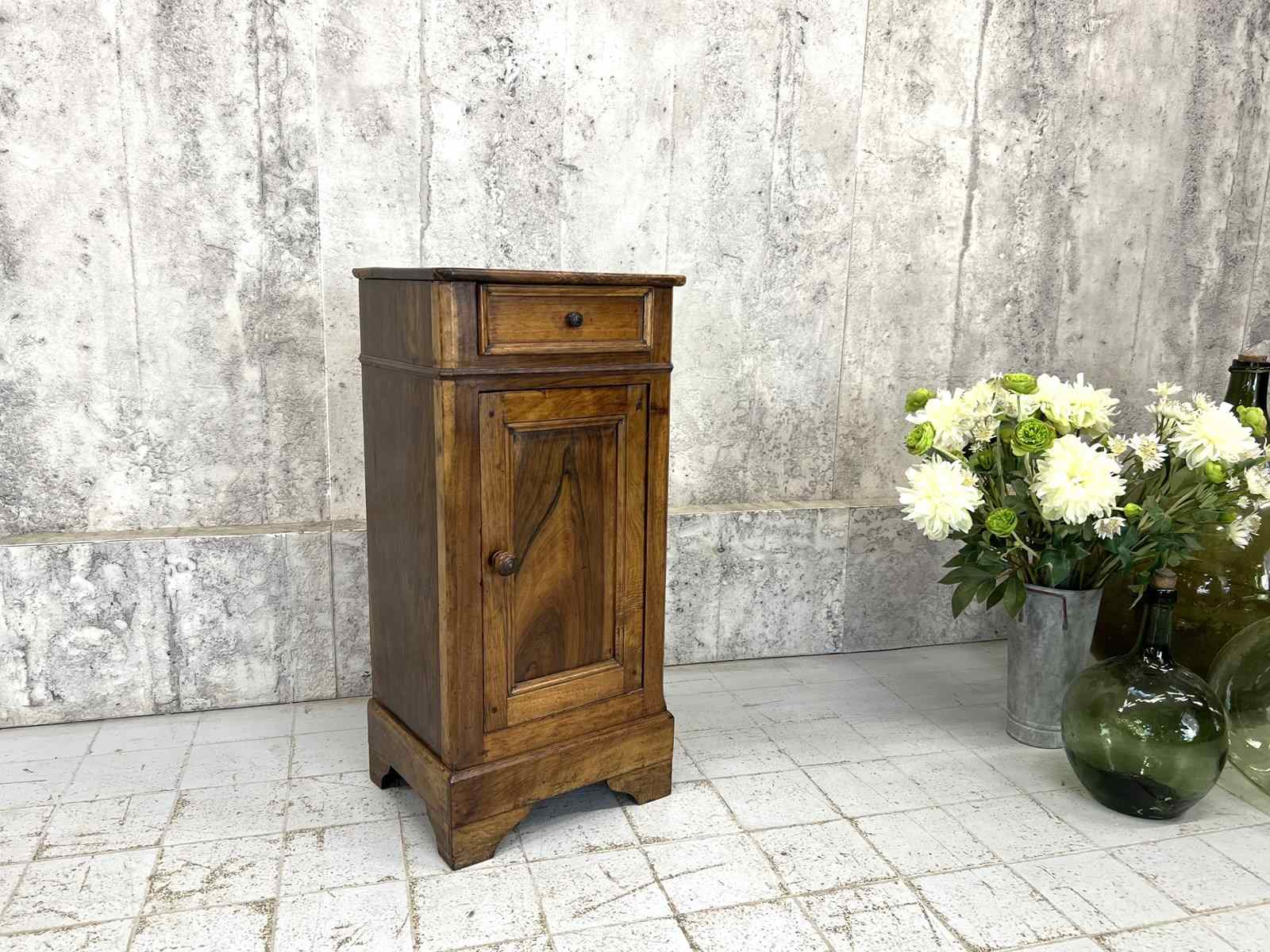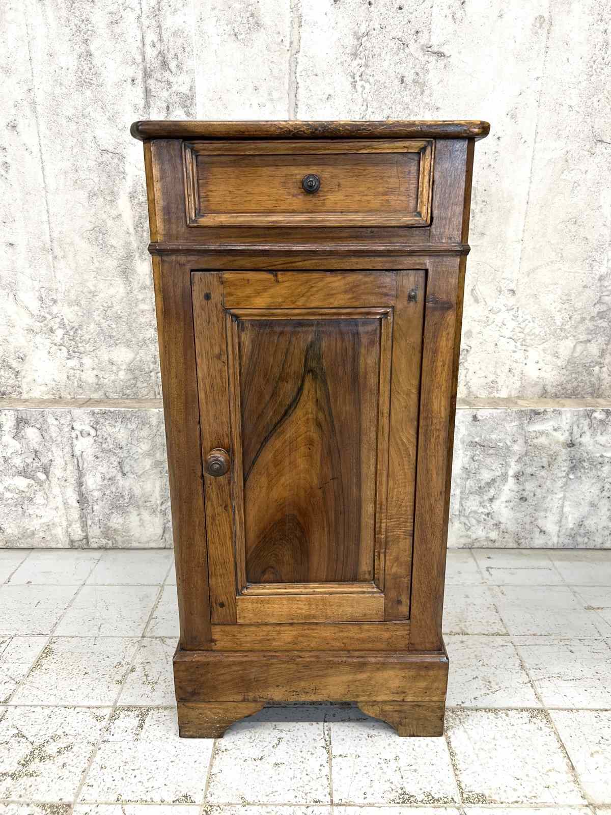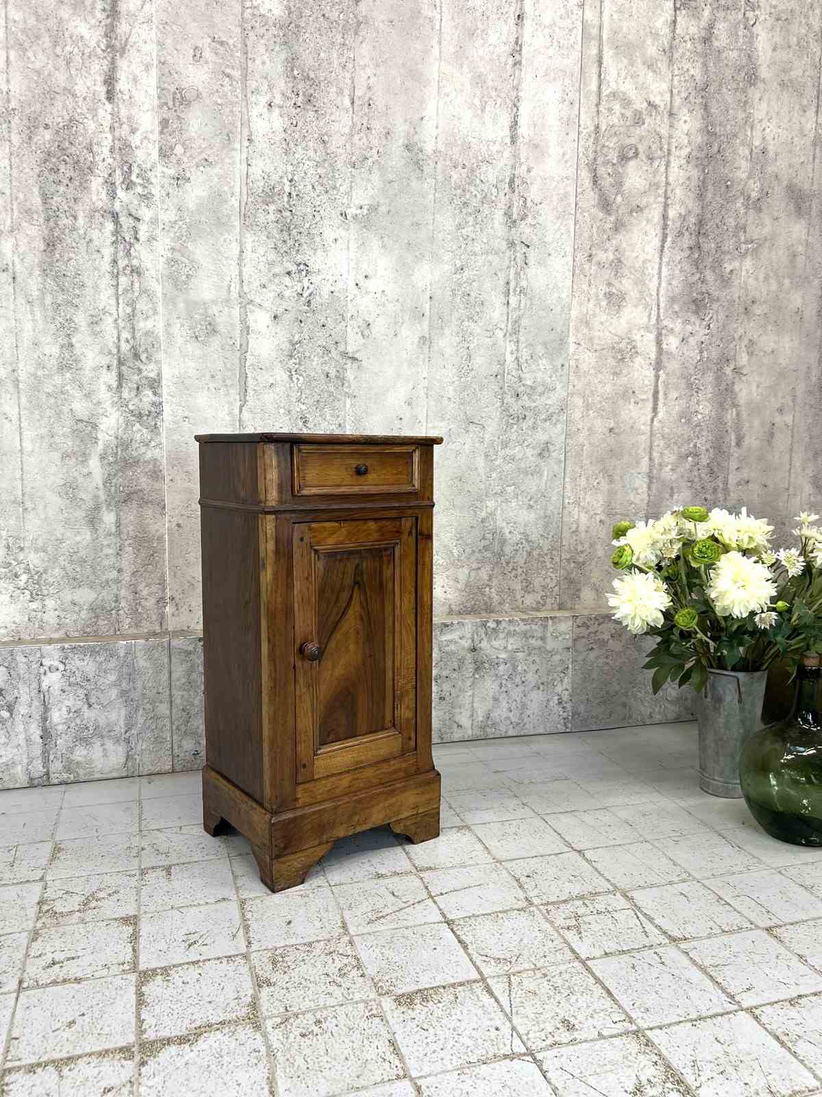 Such a pretty solid wood bedside cabinet with drawer storage and cupboard storage. Marks and bumps commensurate with use and age. The markings to the wood are simply beautiful. Ready to use as it is.