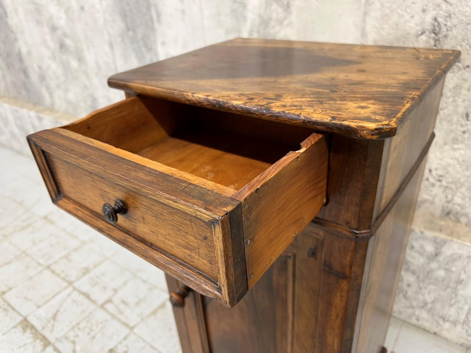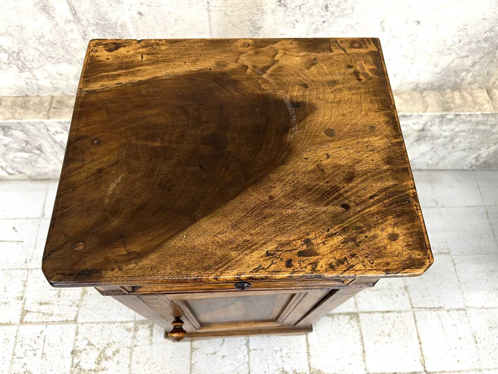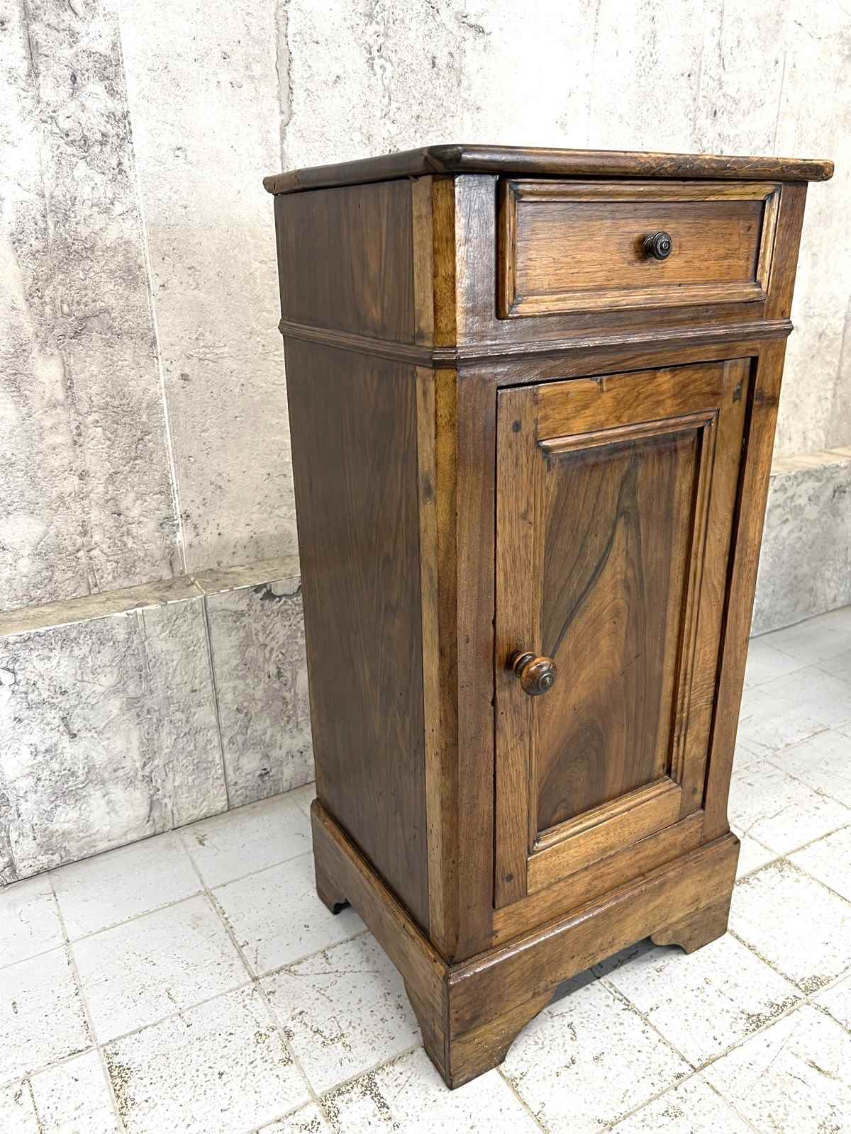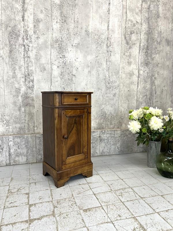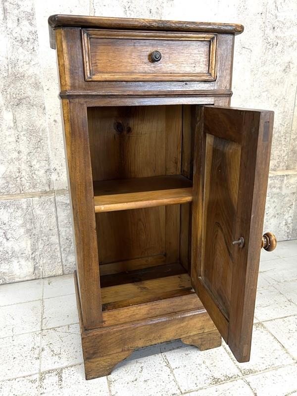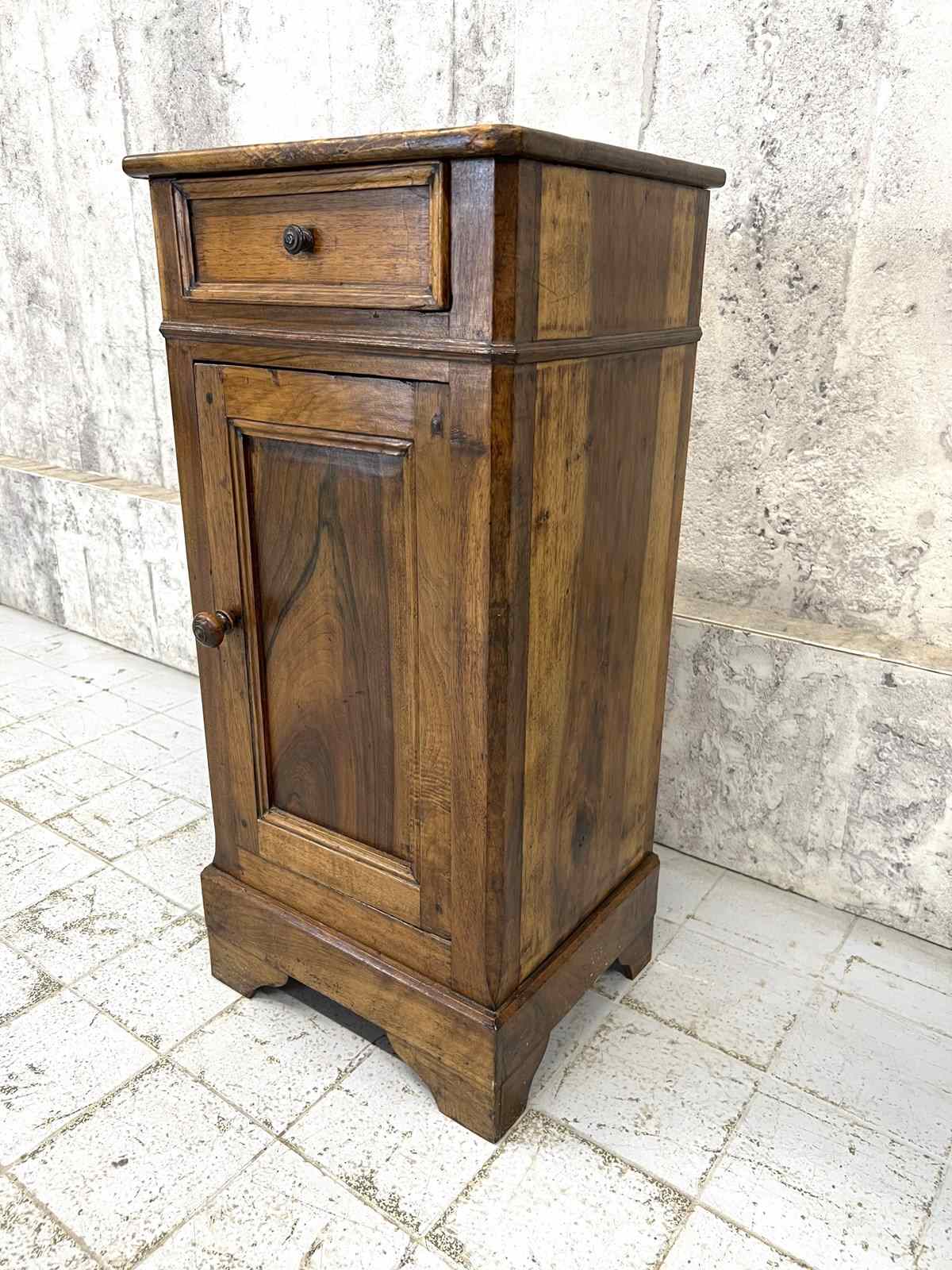Such a pretty solid wood bedside cabinet with drawer storage and cupboard storage. Marks and bumps commensurate with use and age. The markings to the wood are simply beautiful. Ready to use as it is.
