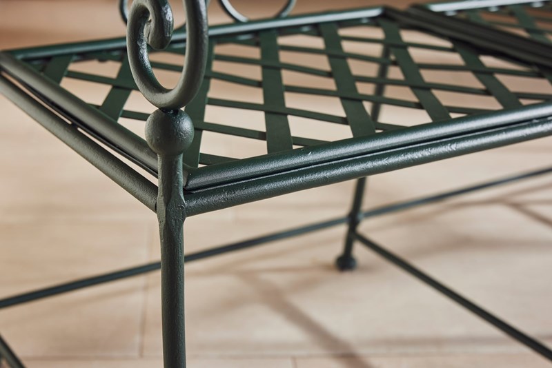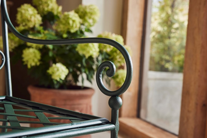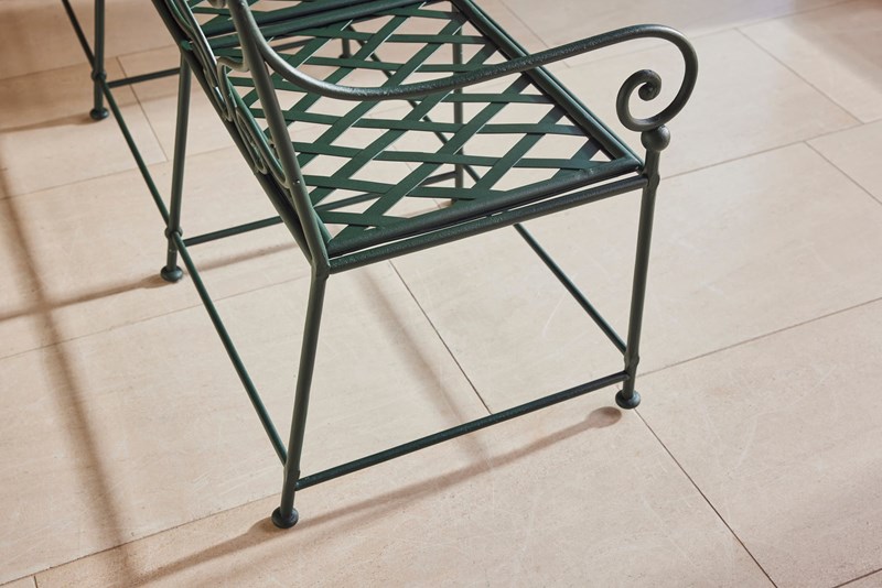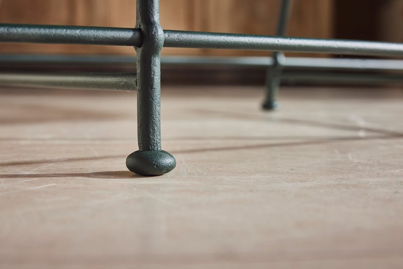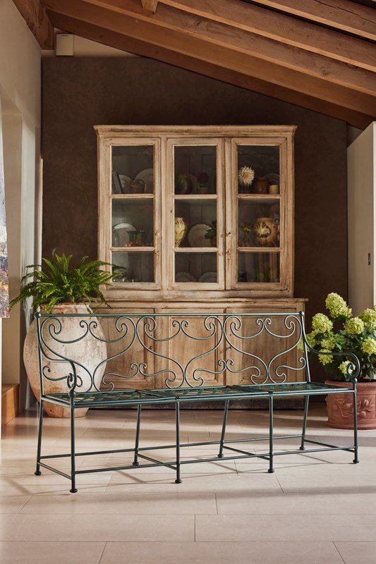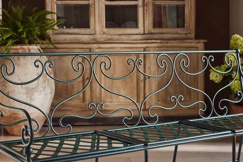 A wonderful 19th-century French garden bench, showcasing exceptional hand-forged wrought iron craftsmanship. Each features an elegant scrolled back, slatted seat, and original lead feet—hallmarks of period garden design.