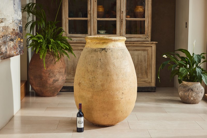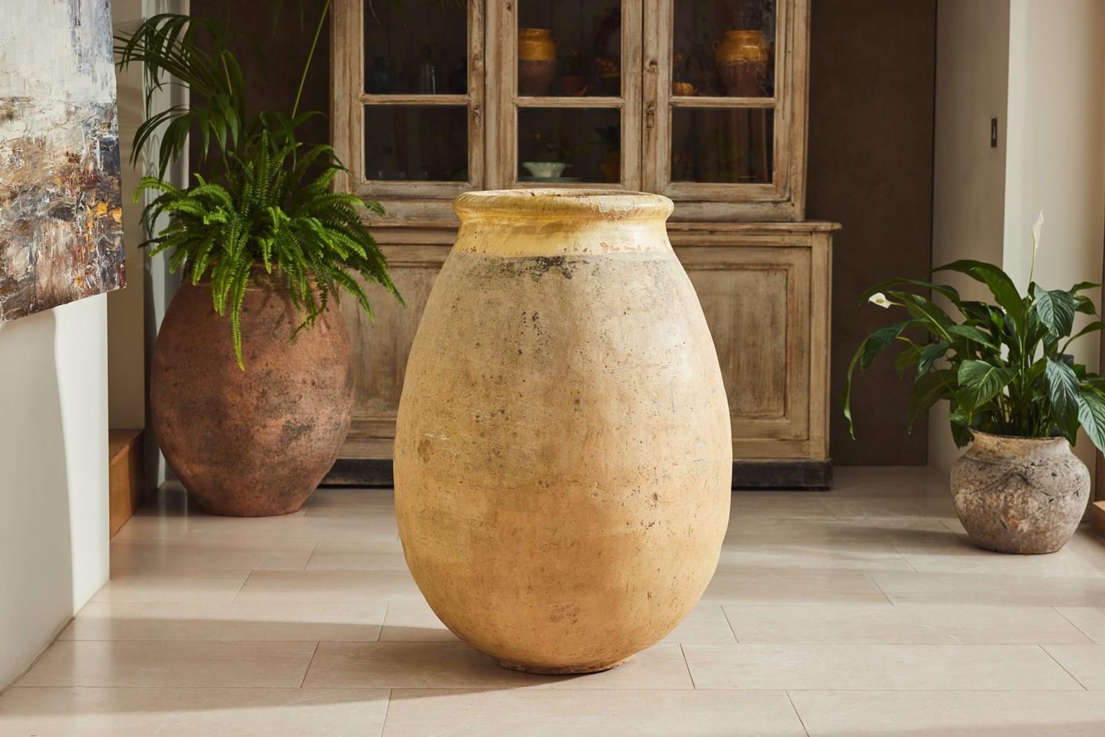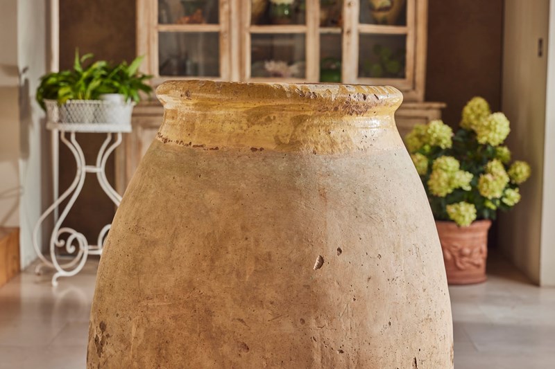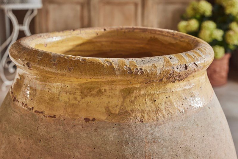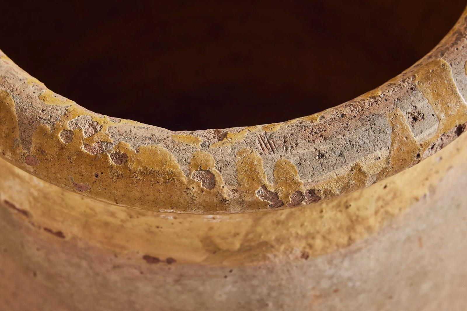 A substantial early-19th century Biot “jarre,” reflecting a pottery tradition dating back to the 16th century and rooted in the village of Biot near Cannes. Handmade from a blend of red and grey clays, it is distinguished by its form and the characteristic yellow glazed rim. Once used to store olives or flour, this jar is in remarkably good condition after two centuries of use, and would make a striking decorative feature in the home or garden.