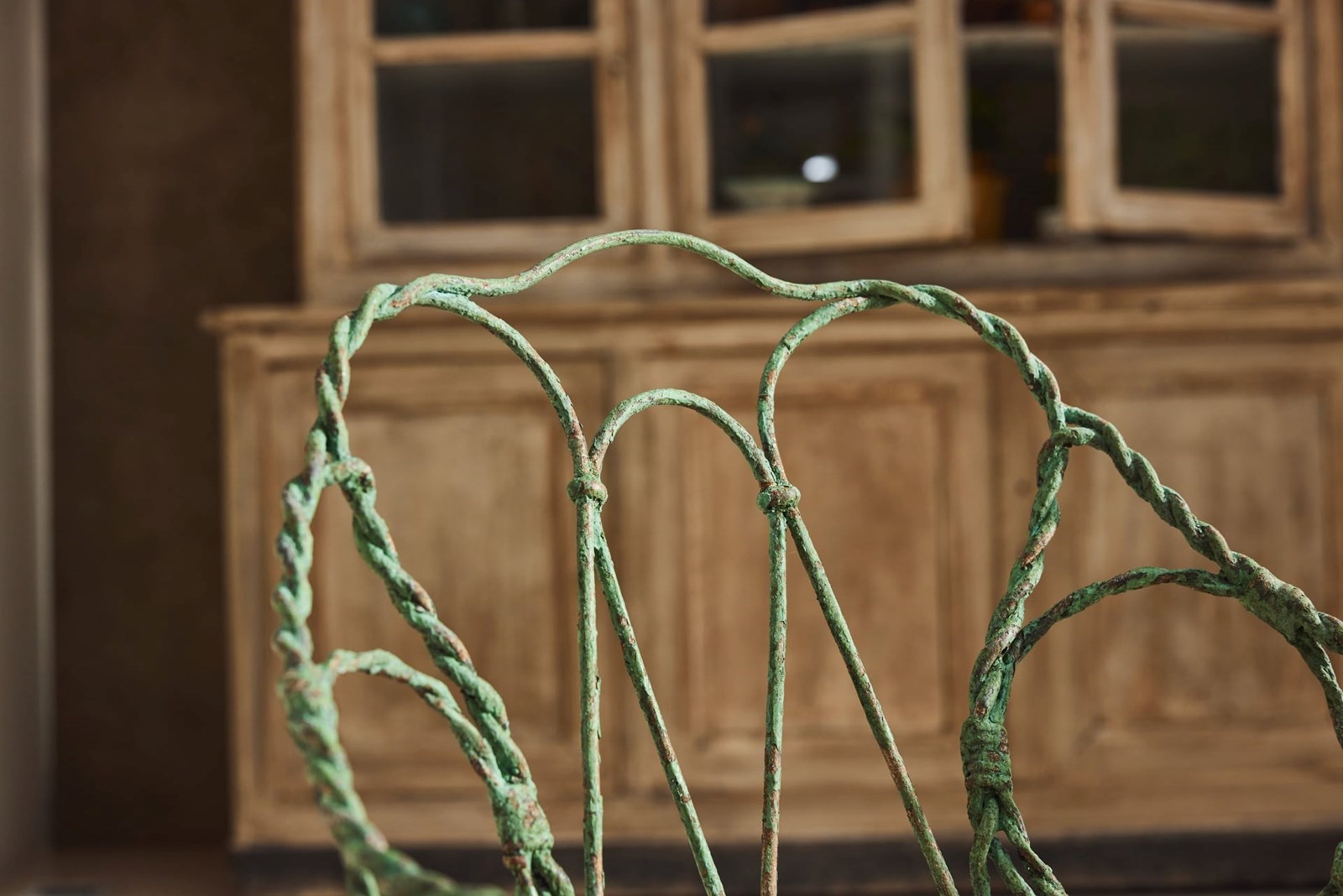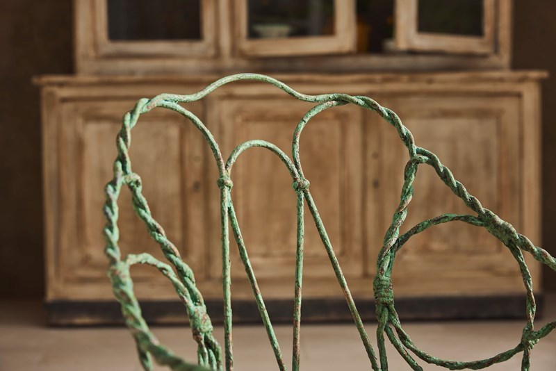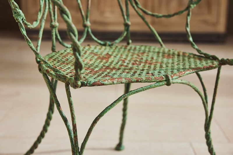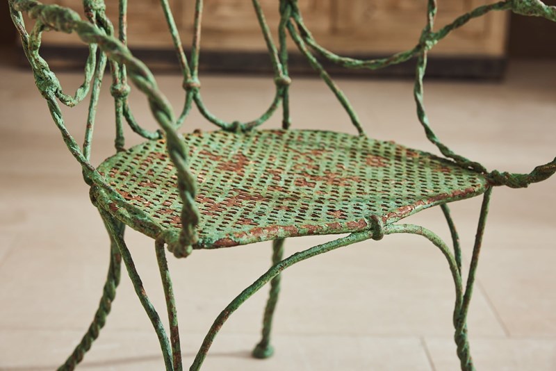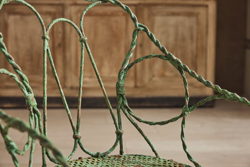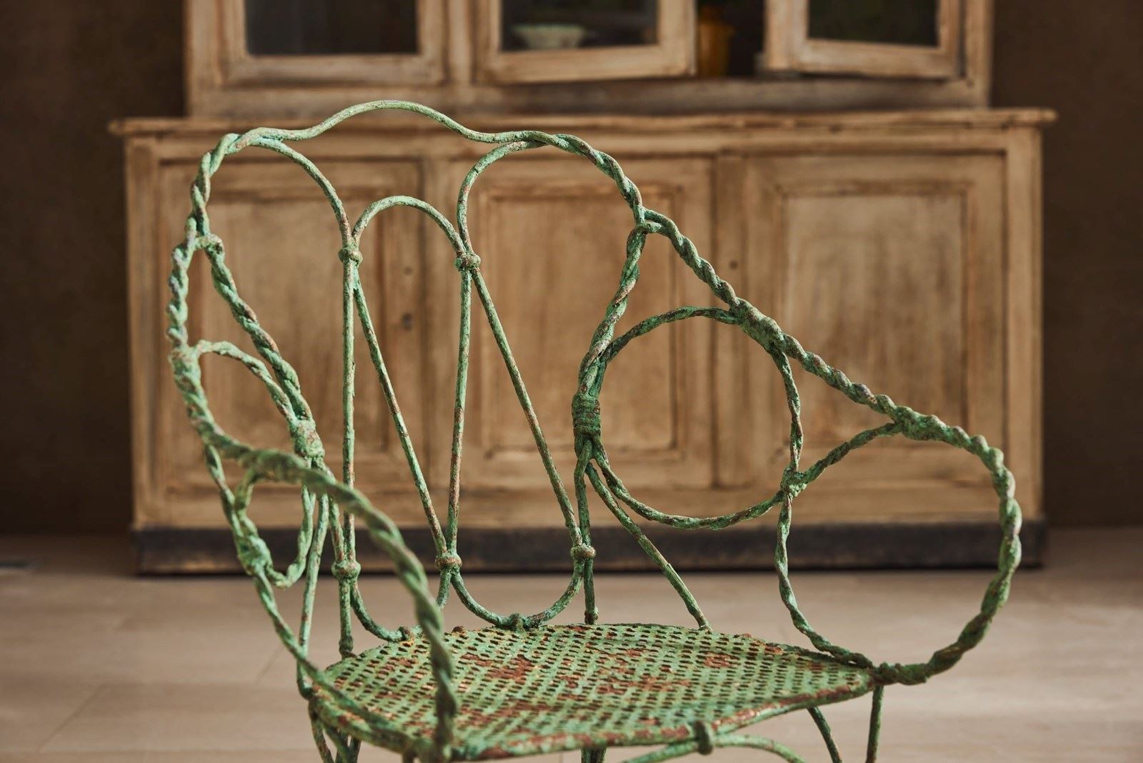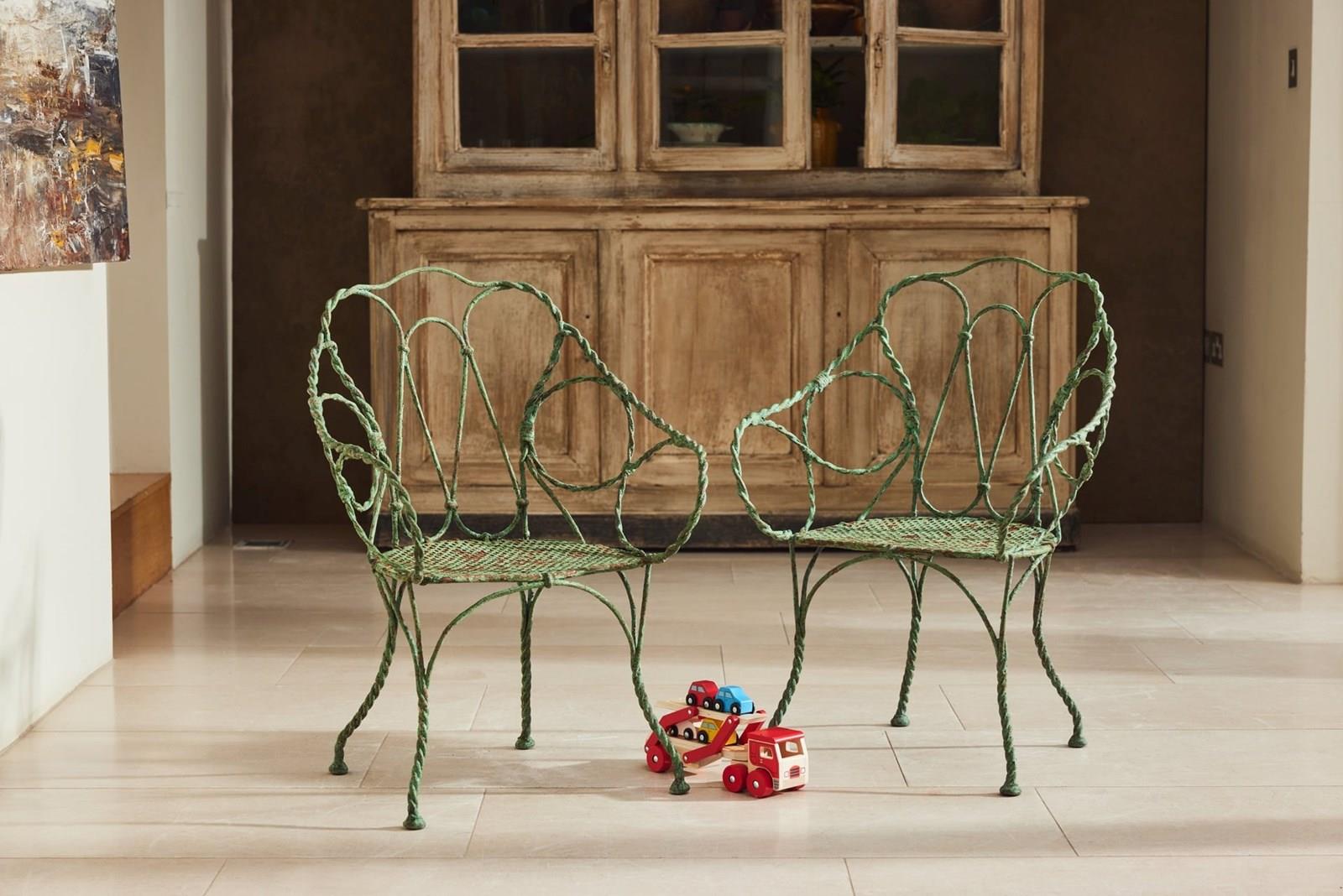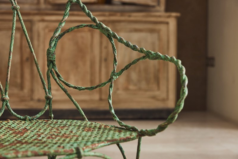 Striking pair of wrought iron childrens chairs with frames designed to resemble twisted rope, complemented by mesh iron seats. The original green paint has aged well and presents with an attractive, consistent surface.