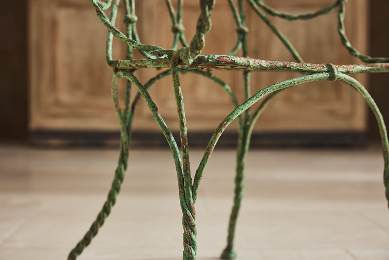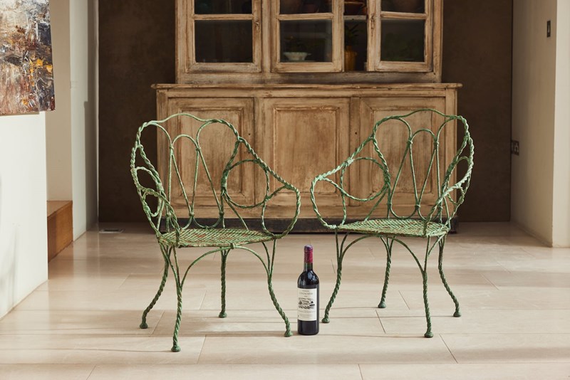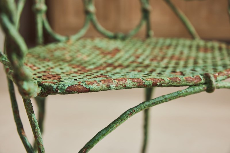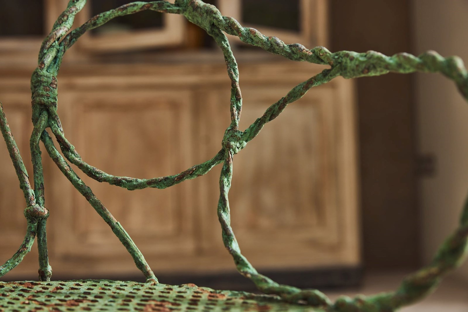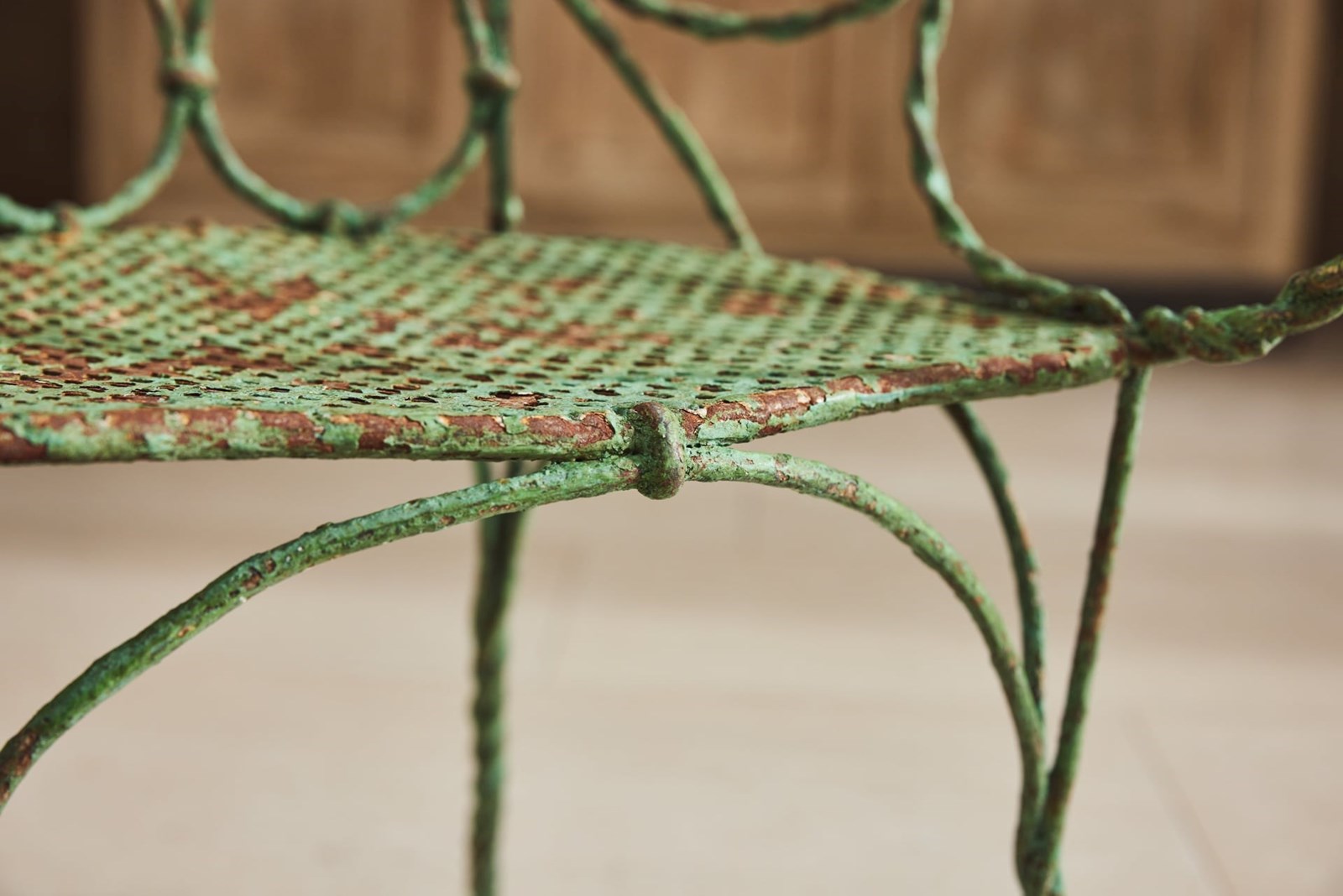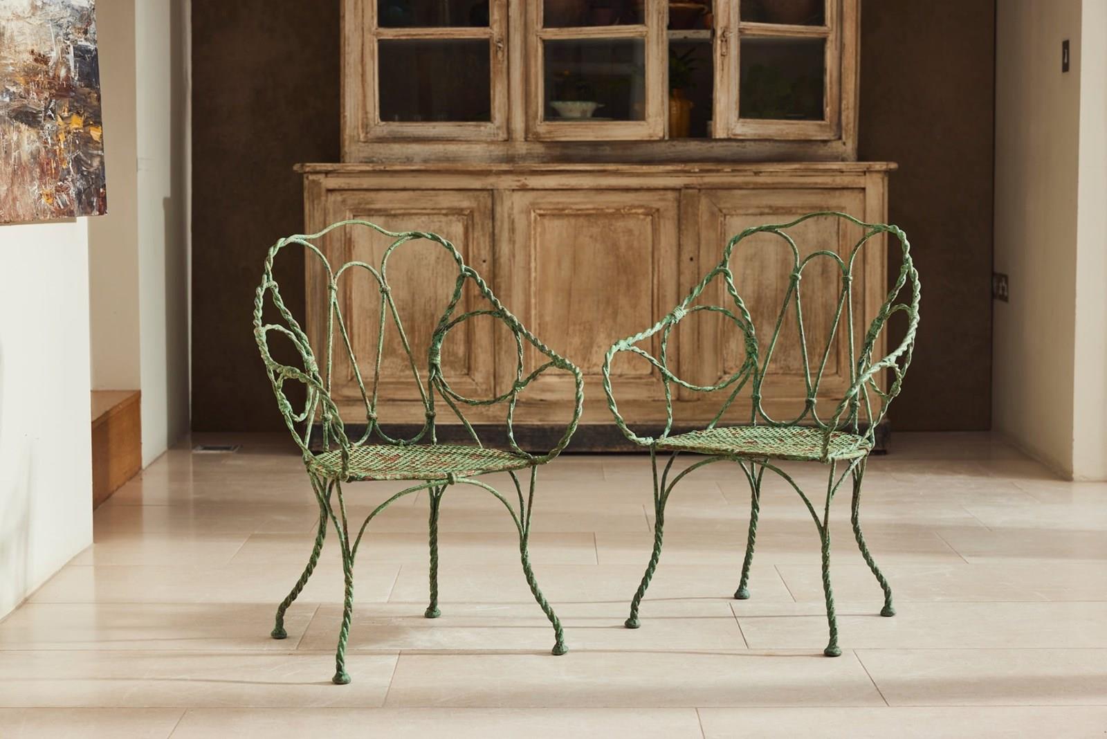 Striking pair of wrought iron childrens chairs with frames designed to resemble twisted rope, complemented by mesh iron seats. The original green paint has aged well and presents with an attractive, consistent surface.