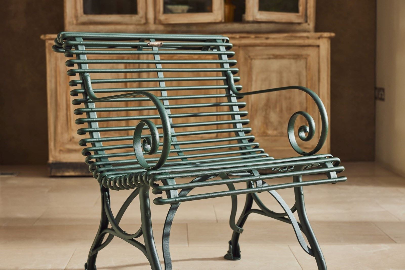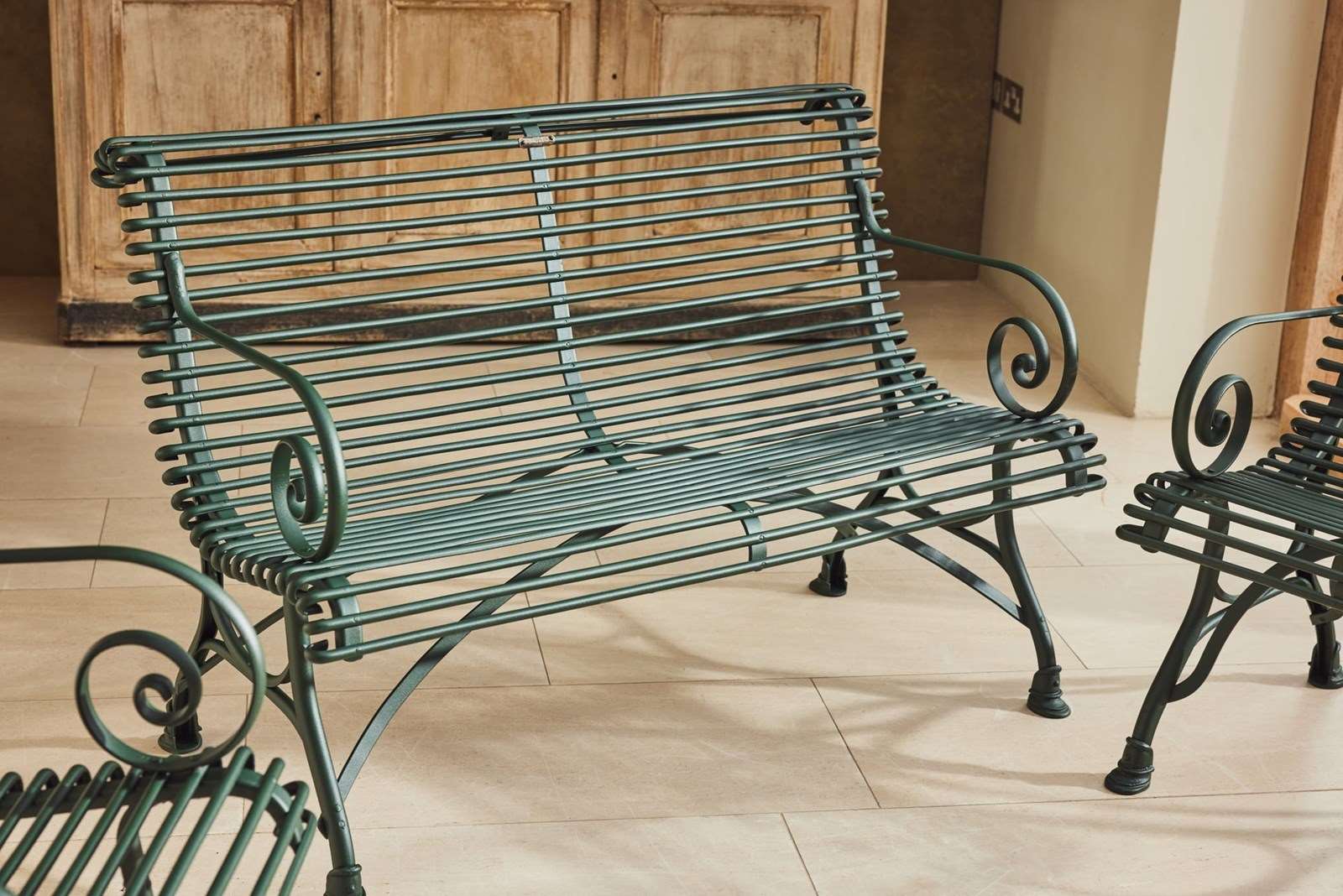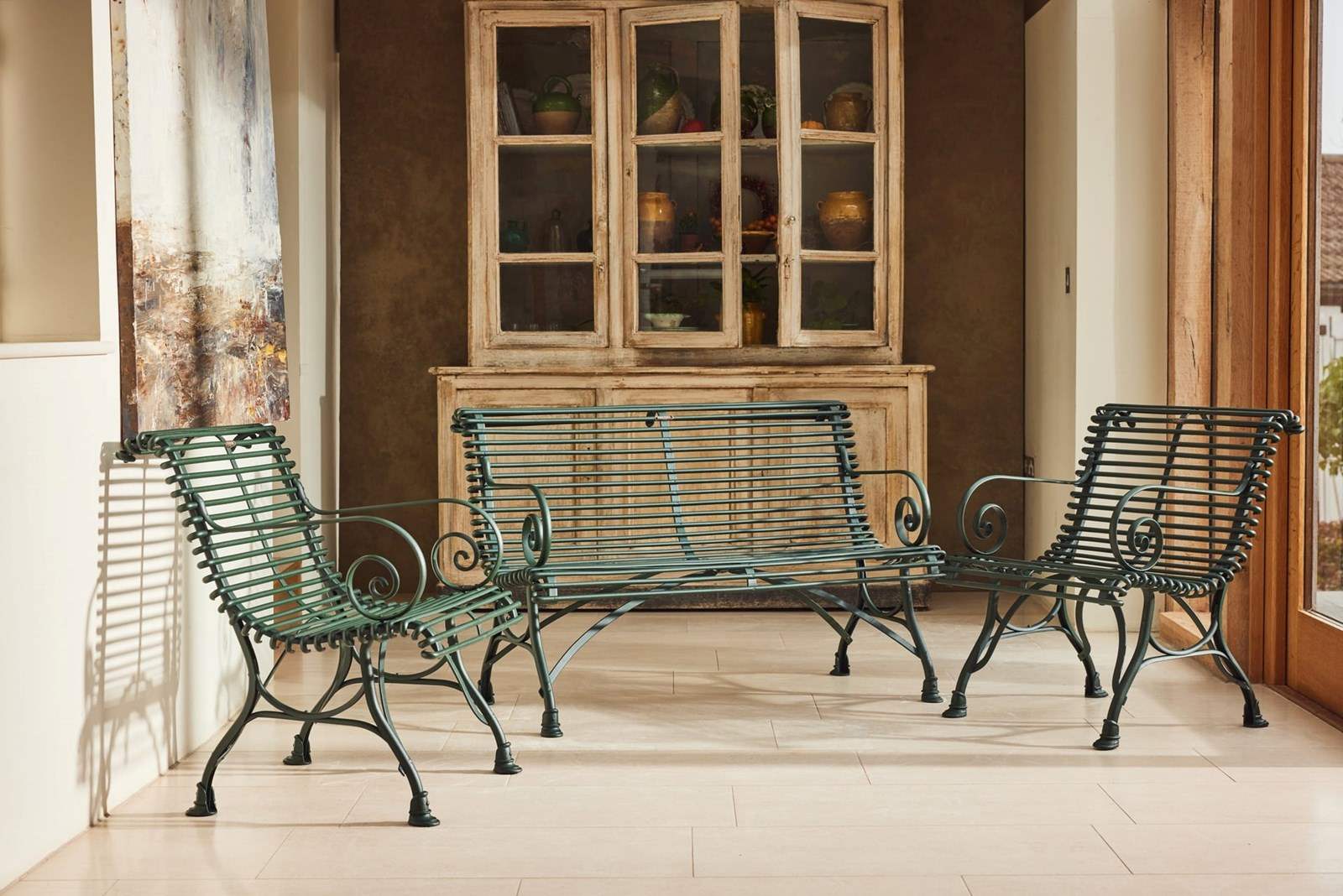 A lovely original Arras Garden Set consisting of a two seater bench and two armchairs. Manufactured in Northern France in and around 1910 it features the cast iron hoof feet associated with the foundries later designs. In very good original condition having been fully restored and powder coated this substantial set would look great in either a modern or traditional garden, on the patio or in the garden room.