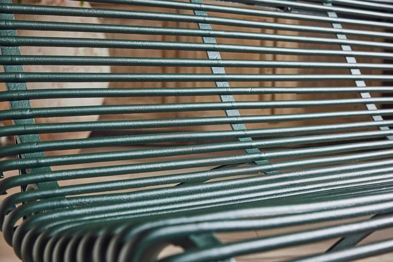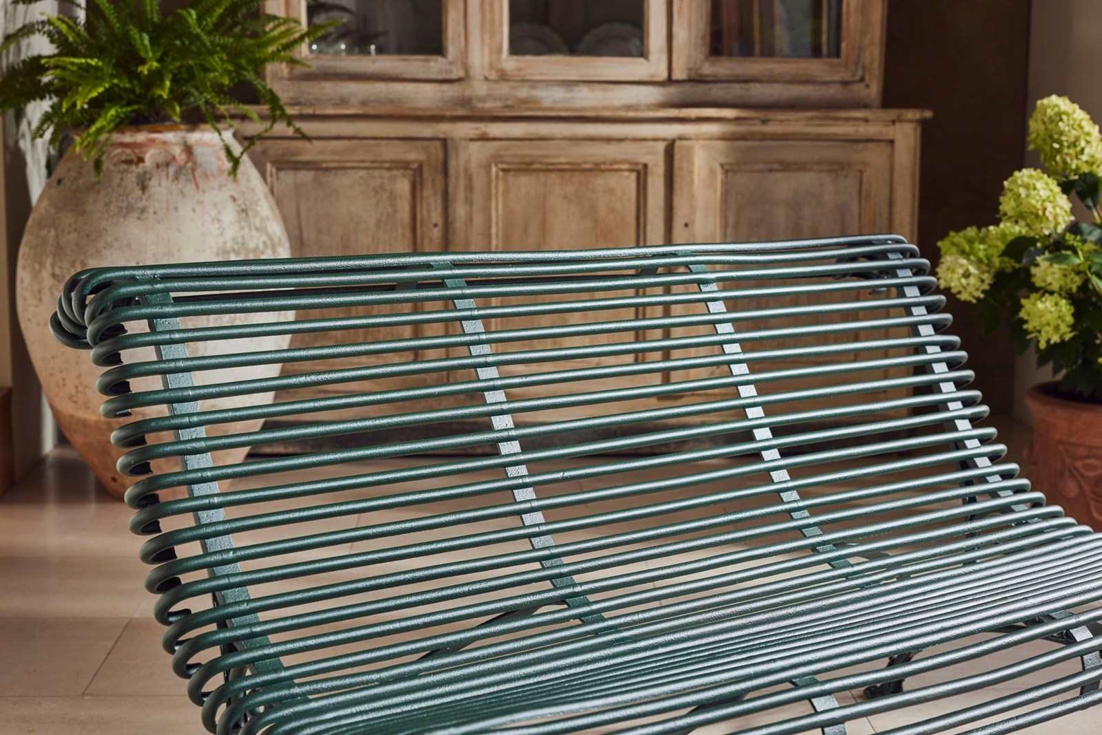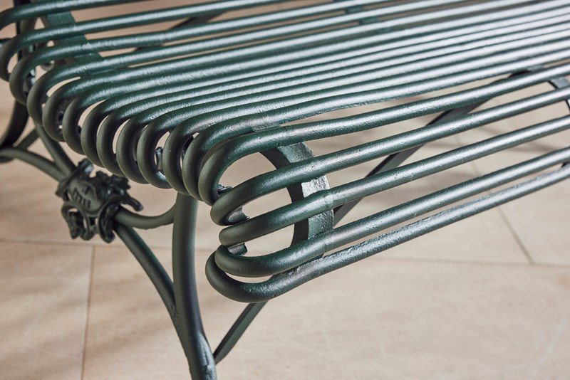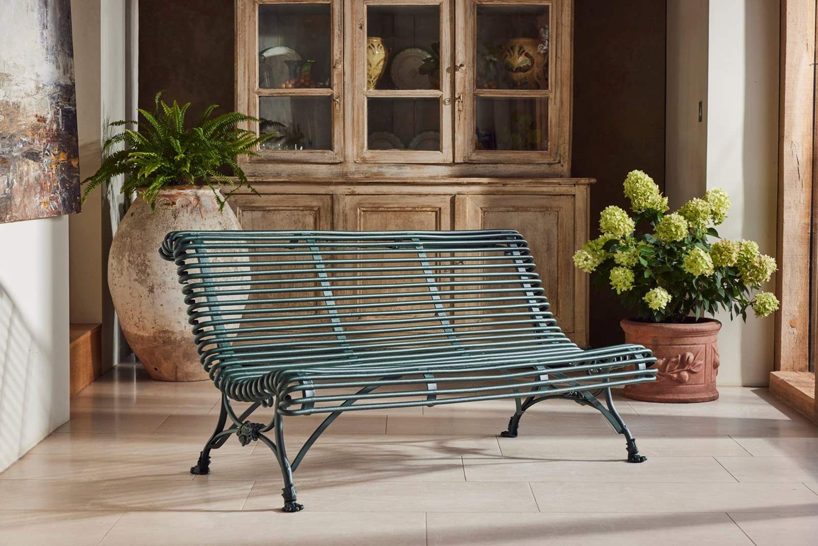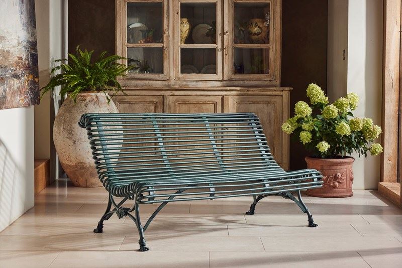 This original 19th-century three-seat Arras bench is in excellent condition, having been fully restored. Its design was included in Grassin Baledan’s 1864 catalogue. Crafted from hand-forged half-round hollow wrought iron (riveted well before the advent of welding), it features elegant lion’s claw feet. This timeless piece integrates beautifully into a garden room, patio, or garden setting.