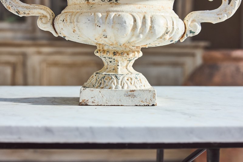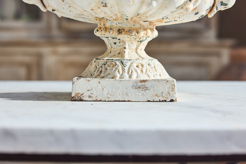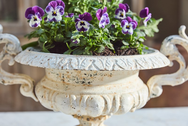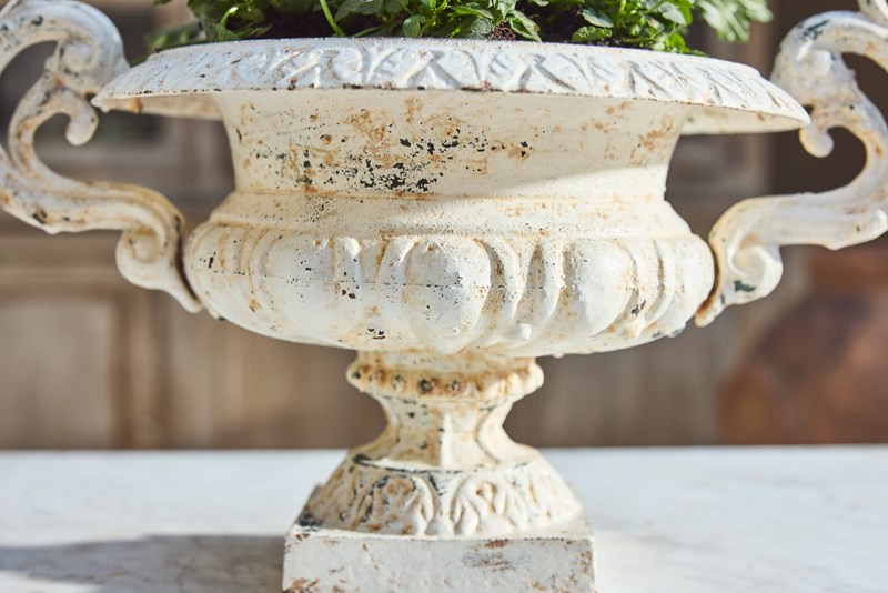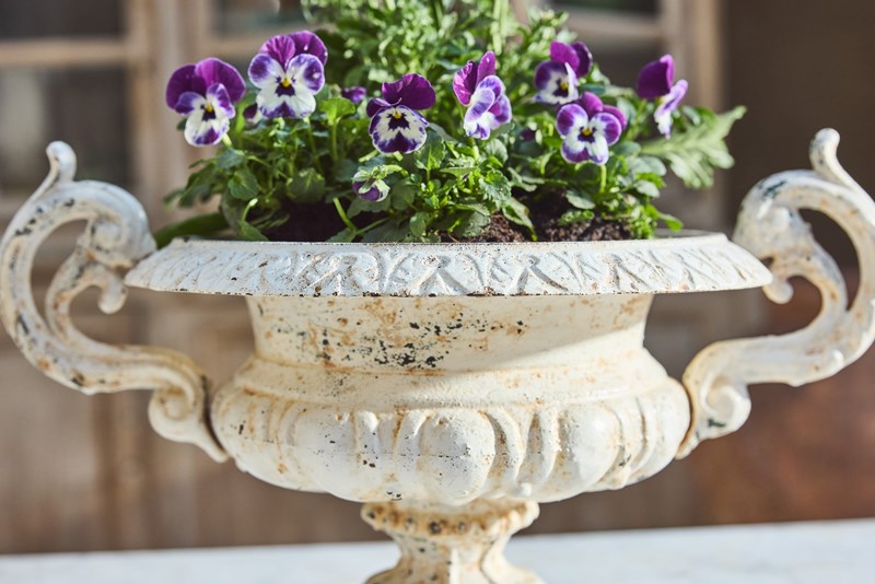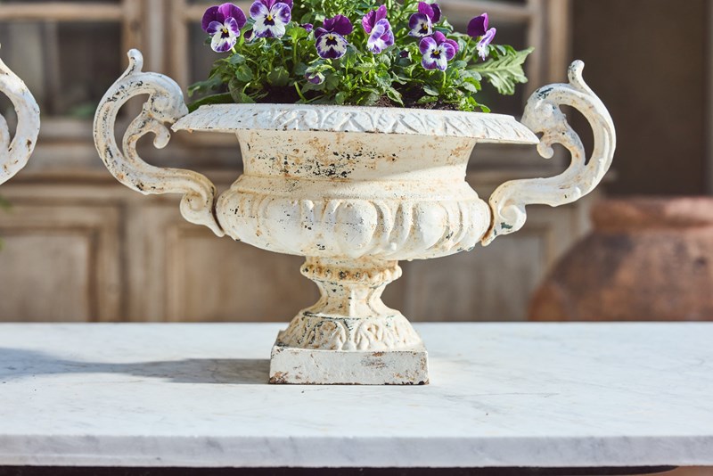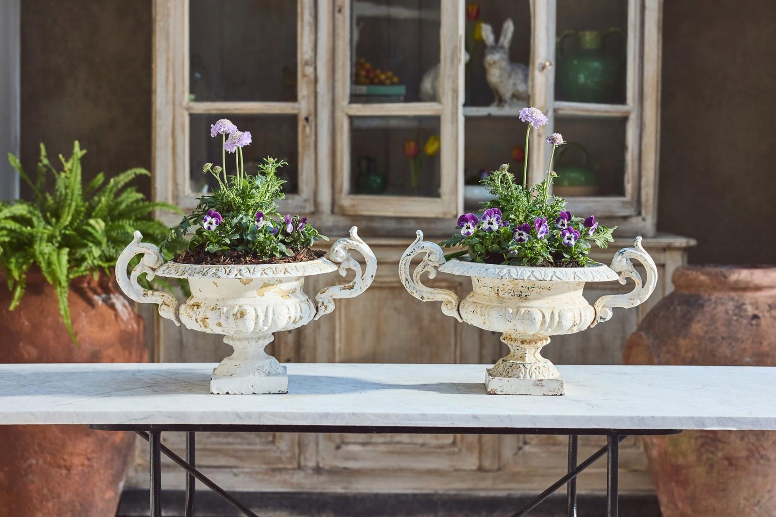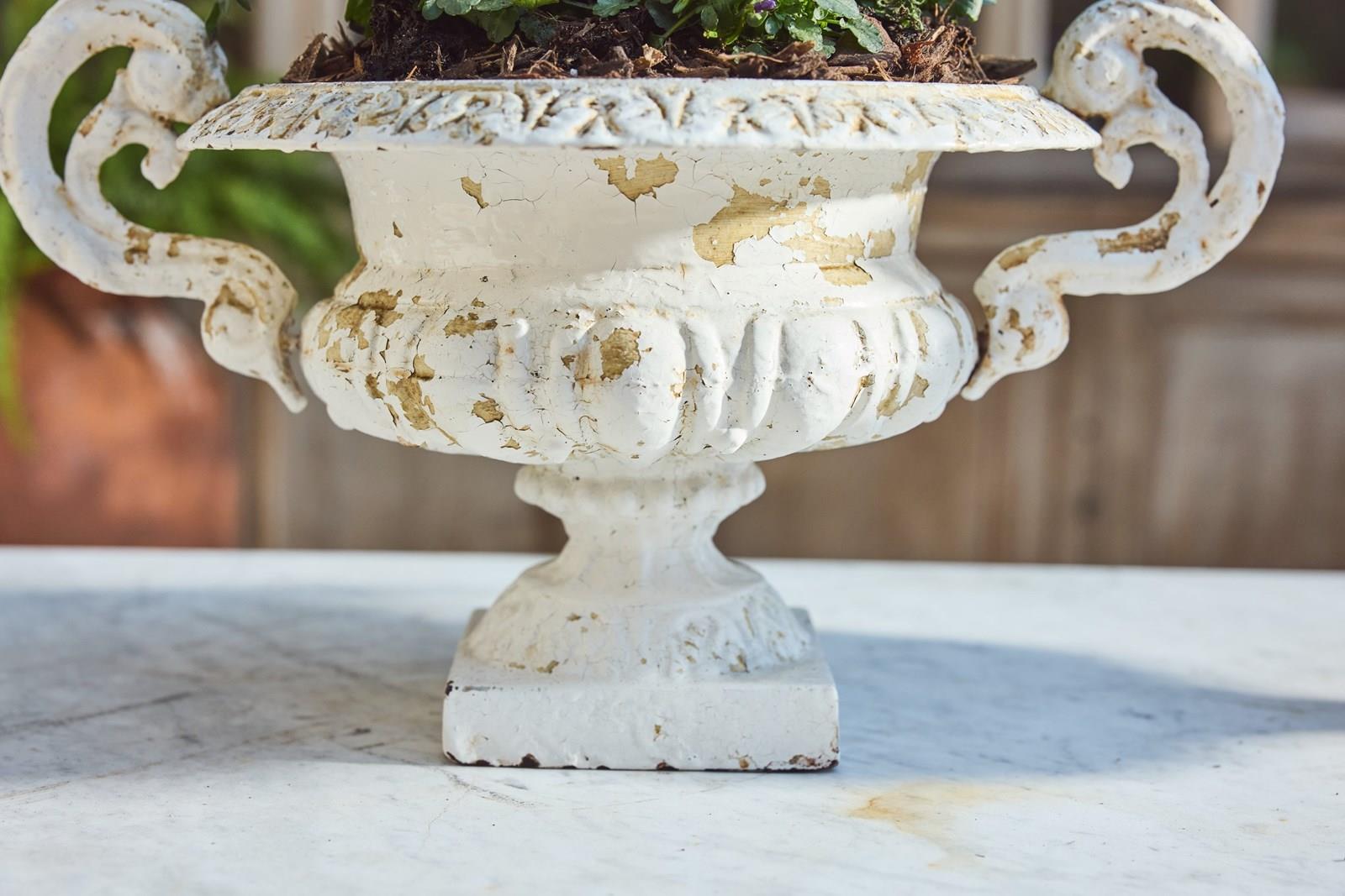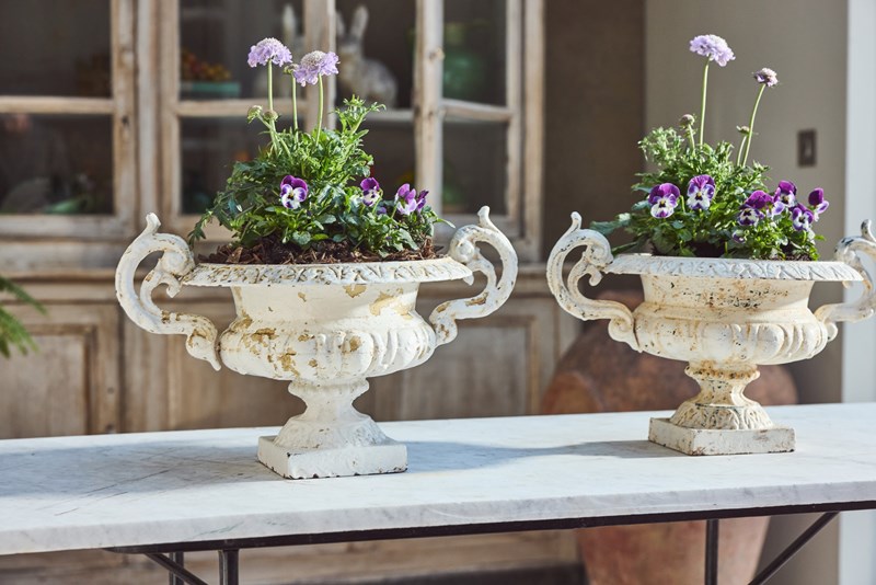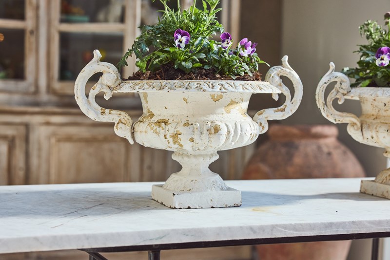 A charming small pair of French cast iron urns dating from the 1930s, featuring decorative dolphin-form handles and retaining their original paint finish, which has developed an attractive aged patina.