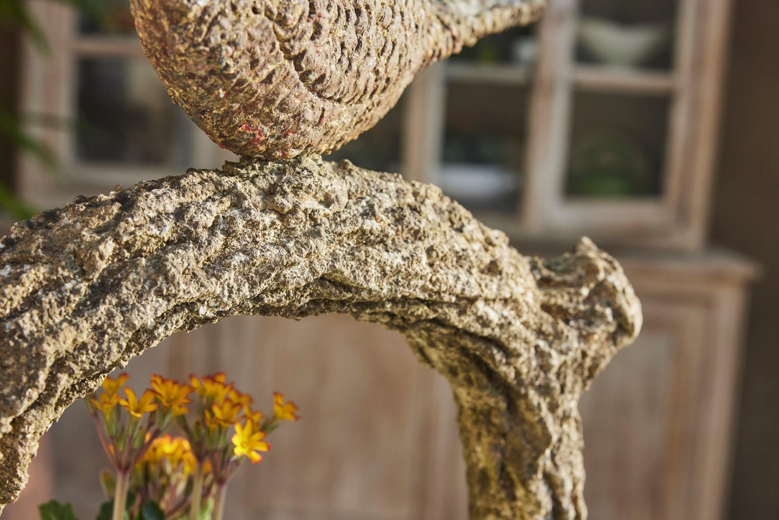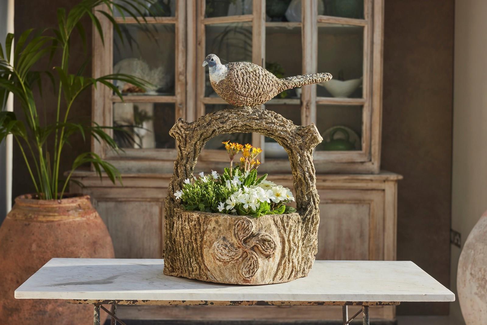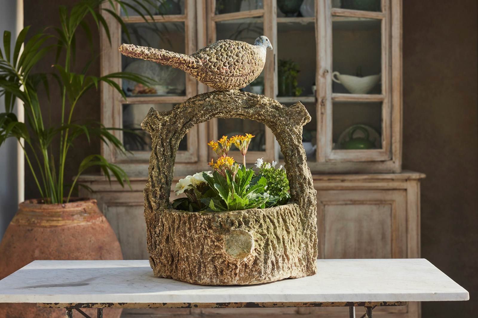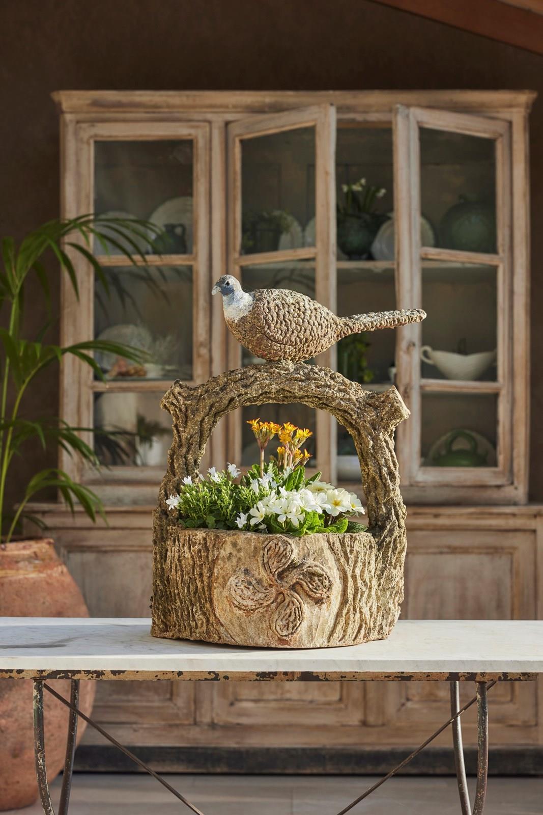This one-of-a-kind artisan-made faux bois (fake wood) planter is a true statement piece of garden art. Featuring a realistic pheasant perched on the handle, it’s both charming and eye-catching. With a generous planting depth, it allows for stunning seasonal displays, as seen in the photos. Every detail is meticulously crafted, from the motif carved on the front to the realistic wood rings on the handle and rear. A truly special and unique piece.
