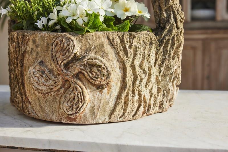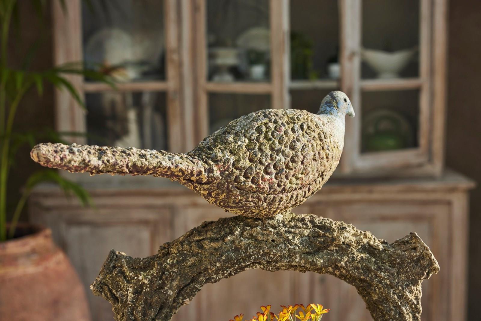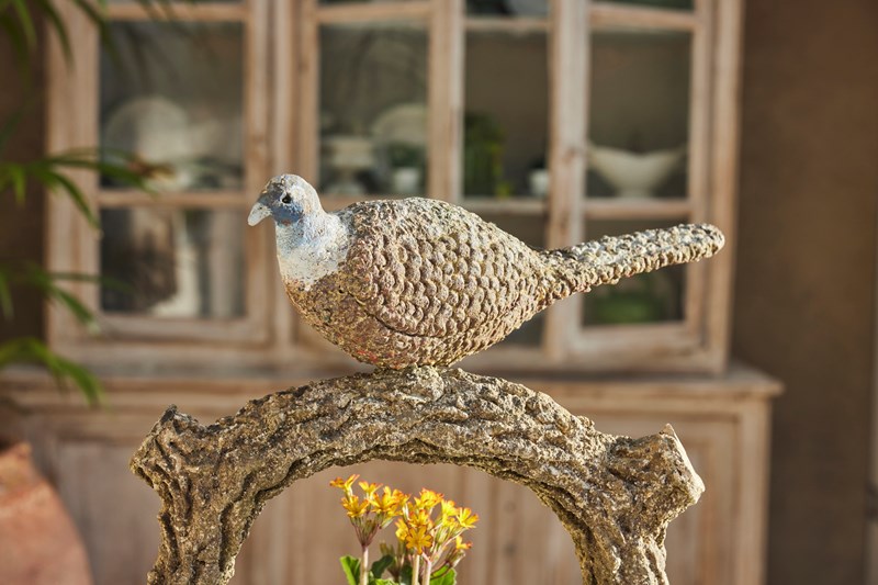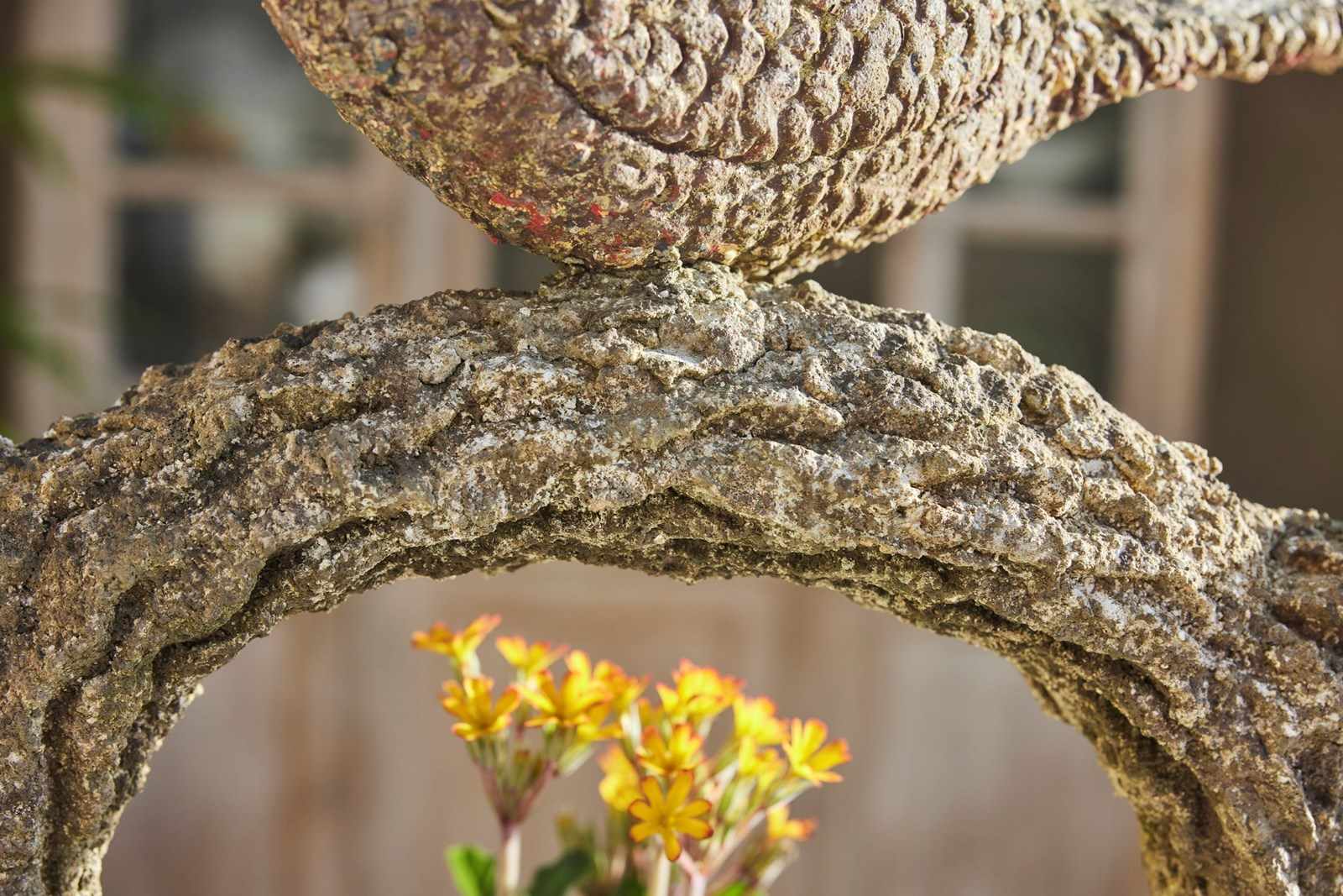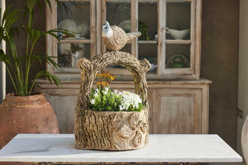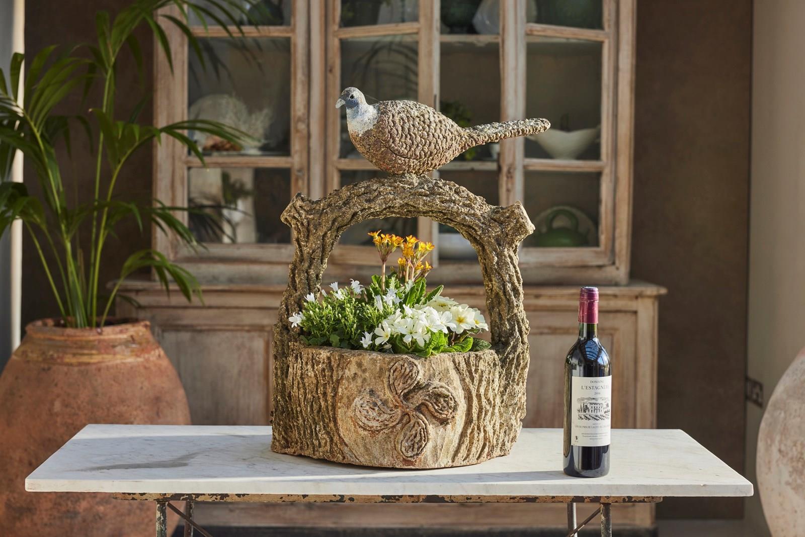This one-of-a-kind artisan-made faux bois (fake wood) planter is a true statement piece of garden art. Featuring a realistic pheasant perched on the handle, it’s both charming and eye-catching. With a generous planting depth, it allows for stunning seasonal displays, as seen in the photos. Every detail is meticulously crafted, from the motif carved on the front to the realistic wood rings on the handle and rear. A truly special and unique piece.