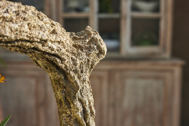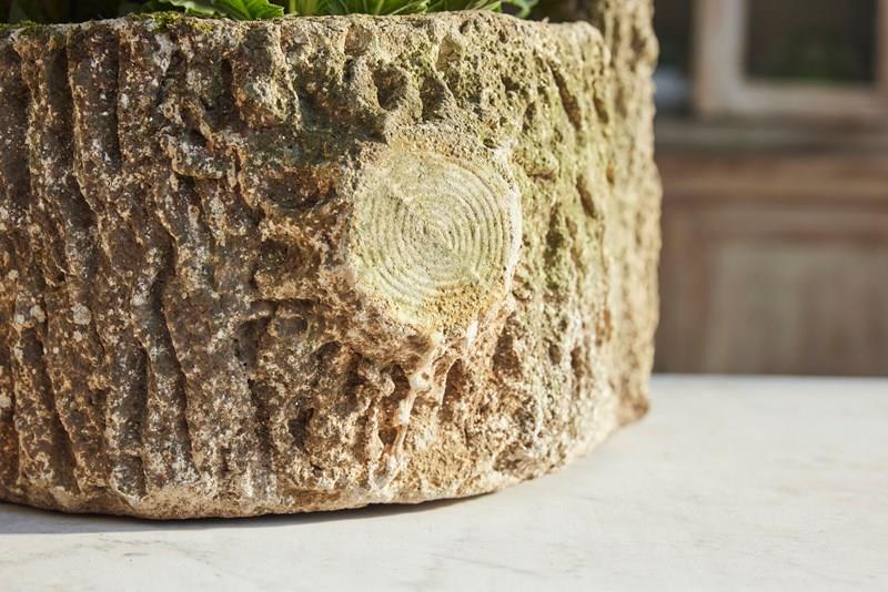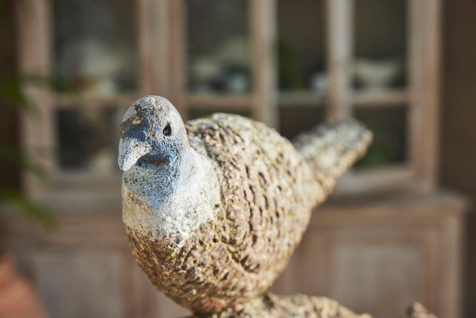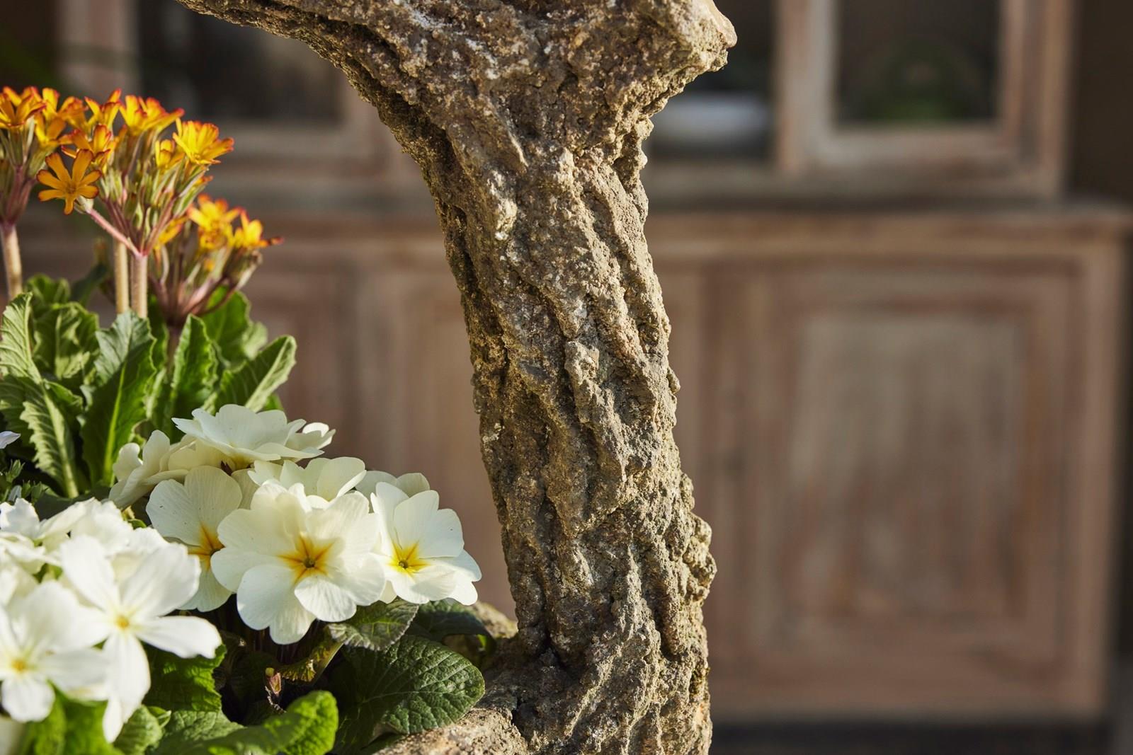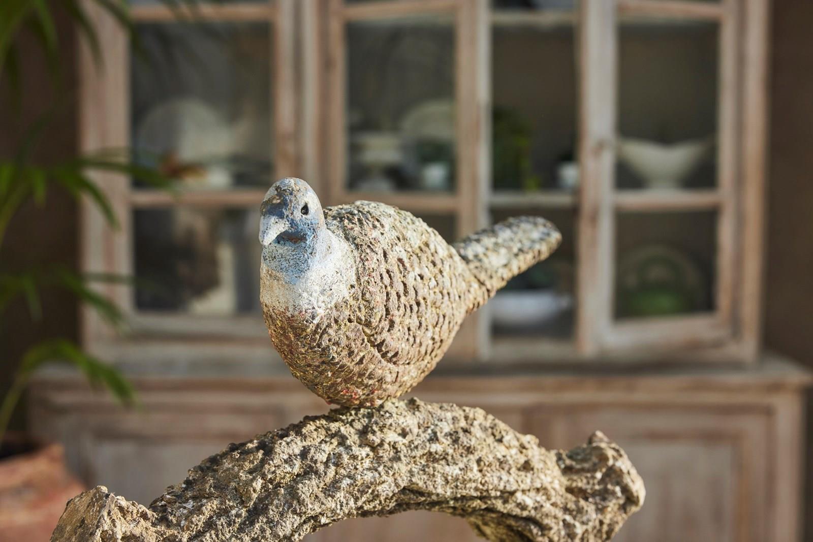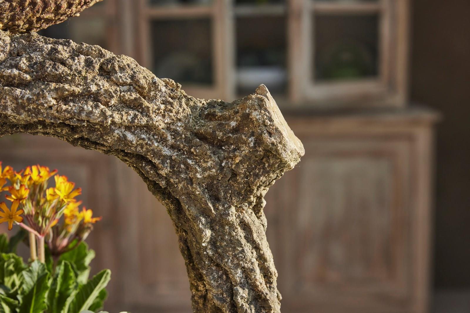 This one-of-a-kind artisan-made faux bois (fake wood) planter is a true statement piece of garden art. Featuring a realistic pheasant perched on the handle, it’s both charming and eye-catching. With a generous planting depth, it allows for stunning seasonal displays, as seen in the photos. Every detail is meticulously crafted, from the motif carved on the front to the realistic wood rings on the handle and rear. A truly special and unique piece.