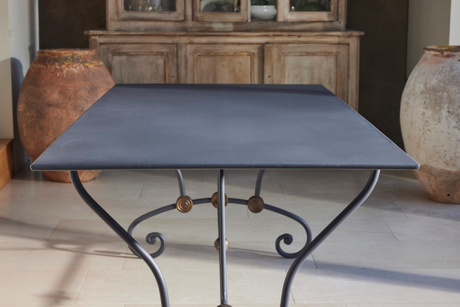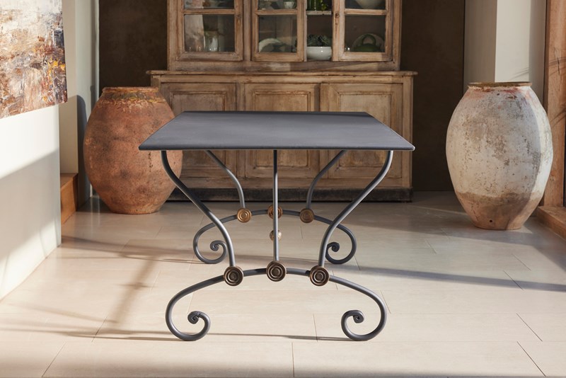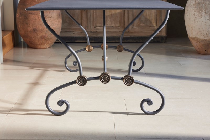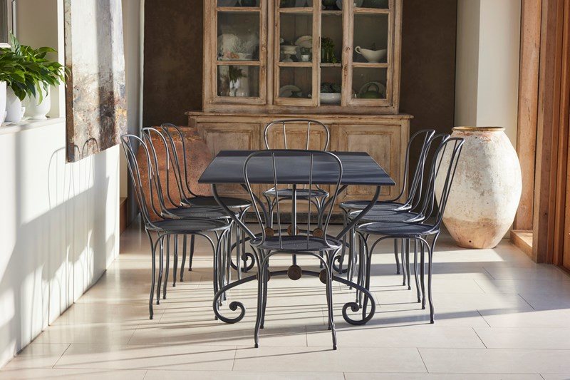 Fully restored by us, it features a wrought iron base, matching chairs, and a metal tabletop—all powder-coated for lasting weather protection. It comfortably seats eight, perfect for stylish outdoor entertaining.