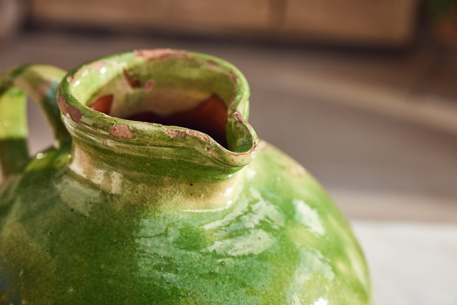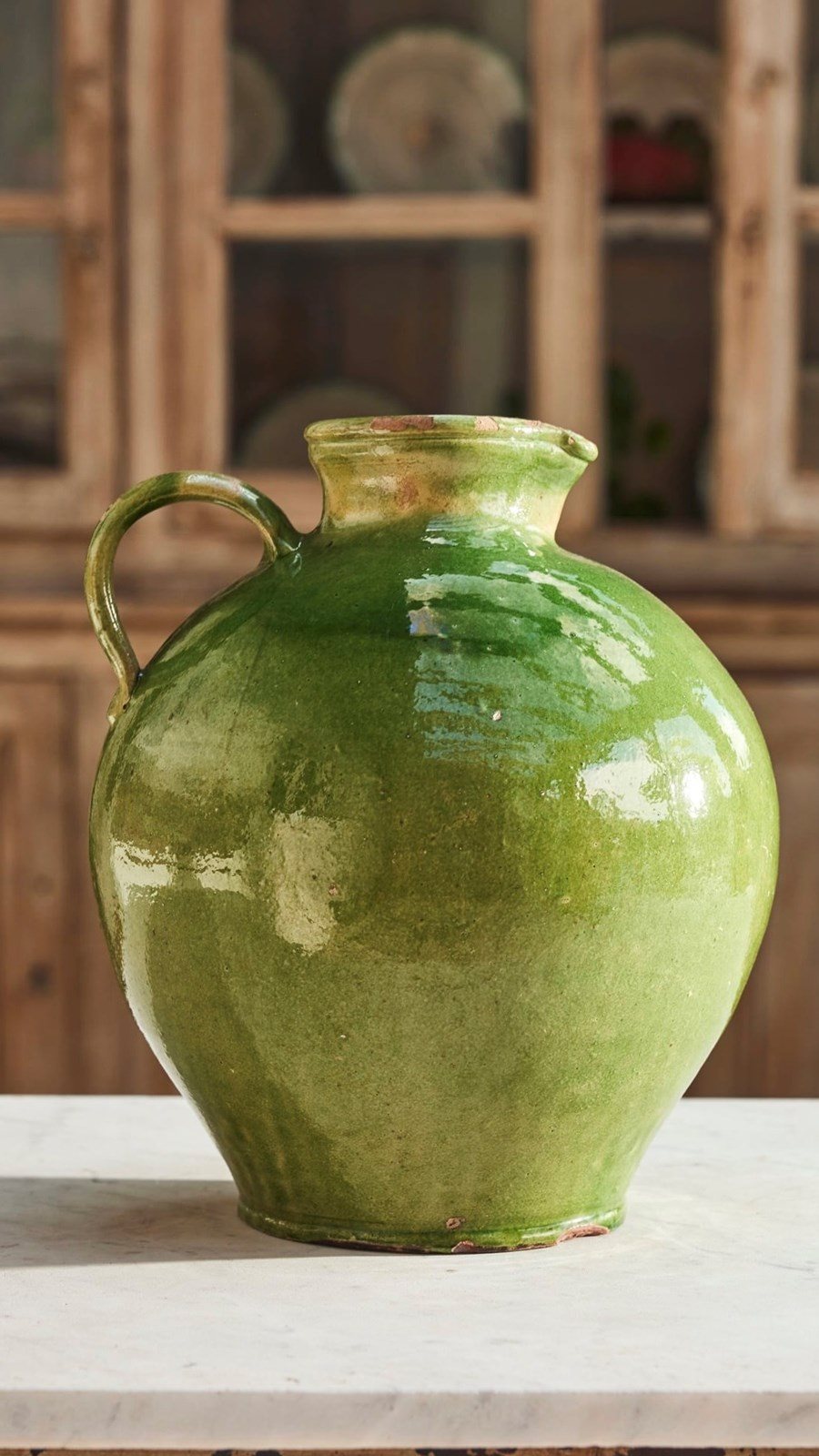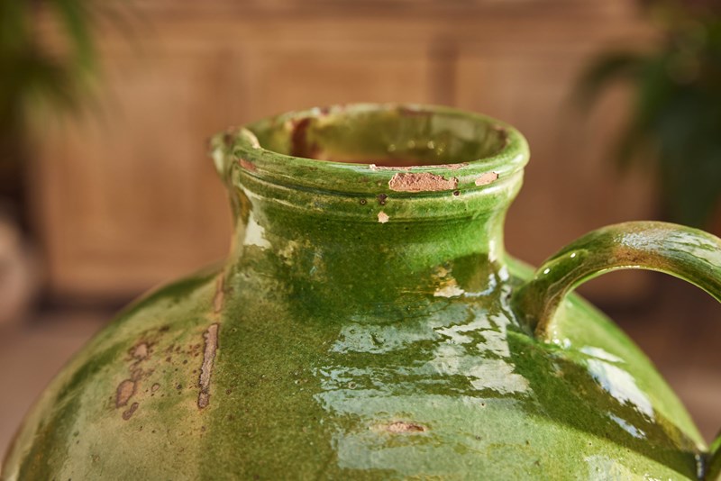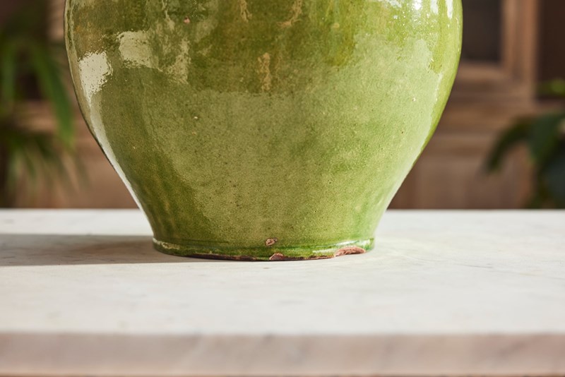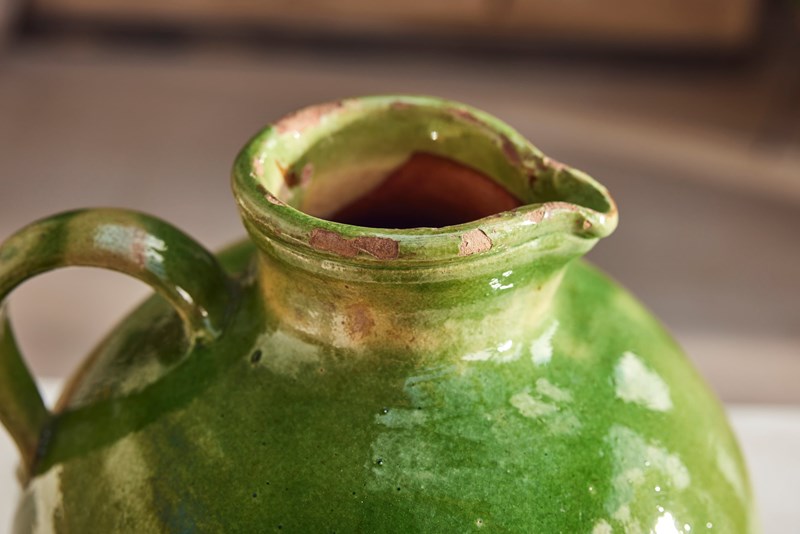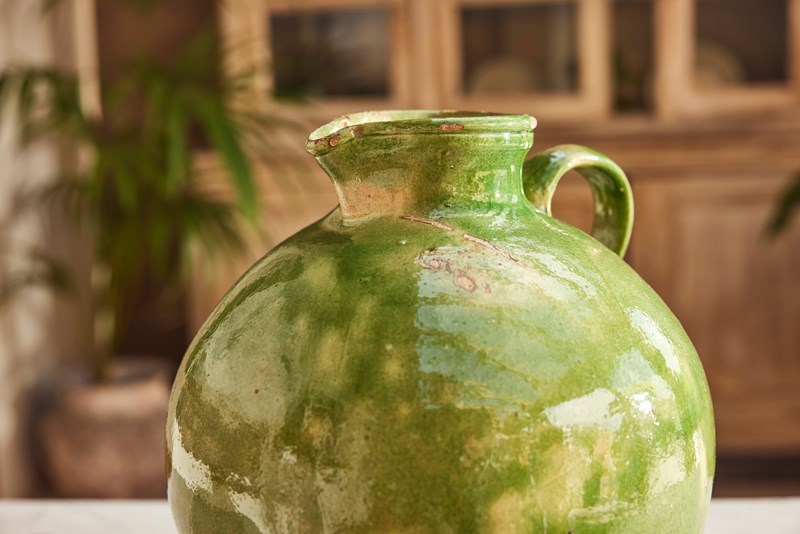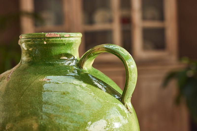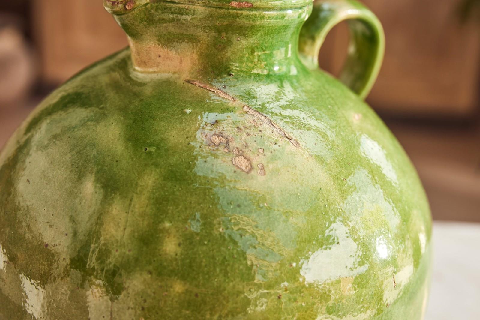 A fine example of early 20th-century Provençal pottery, this water jug features a vivid green glaze that catches the light beautifully—bright and full of character.