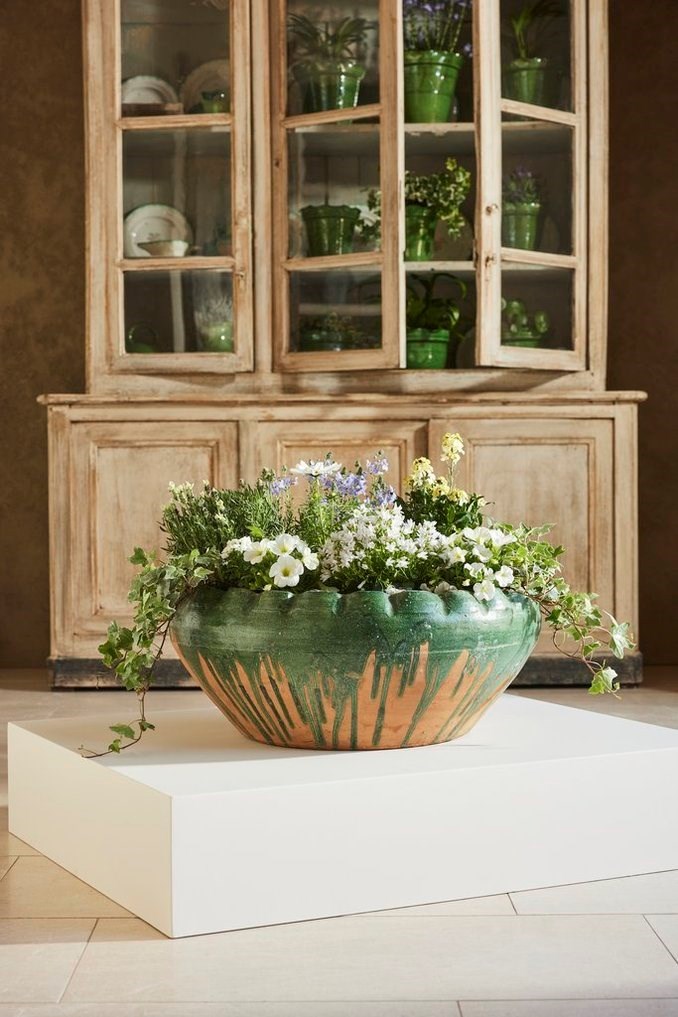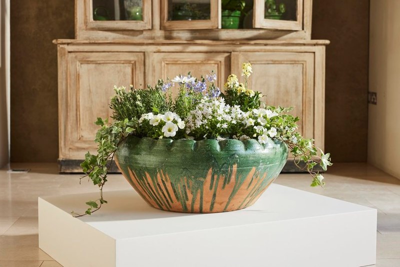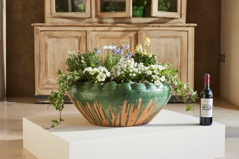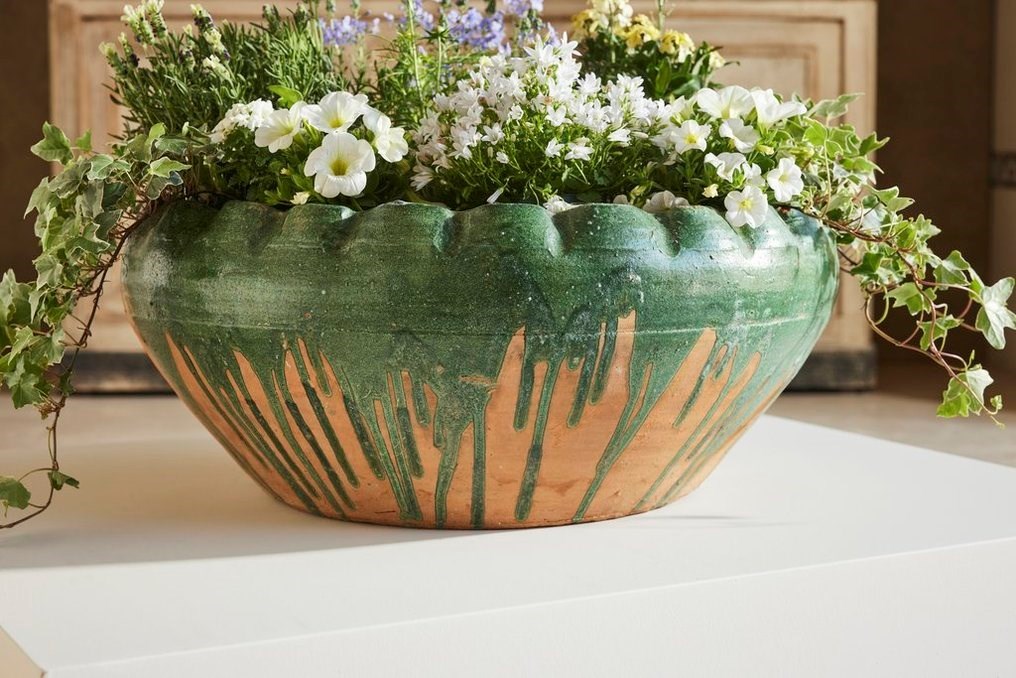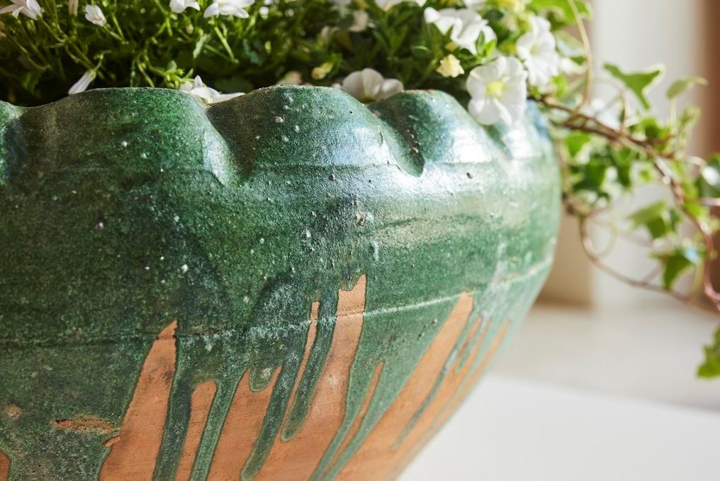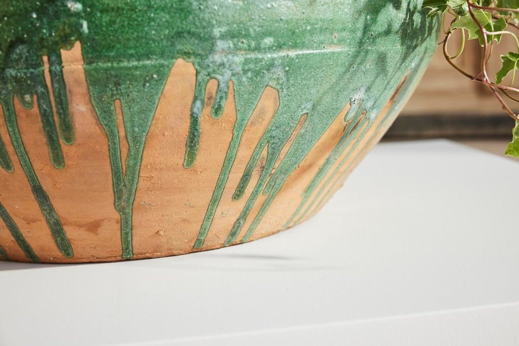 We love this highly decorative Italian terracotta bowl planter. Featuring a charming pie-crust rim and a rich green drip glaze it would add character to any space. The planter is generous in size and would make a perfect centerpiece bringing seasonal planting to life throughout the year.
