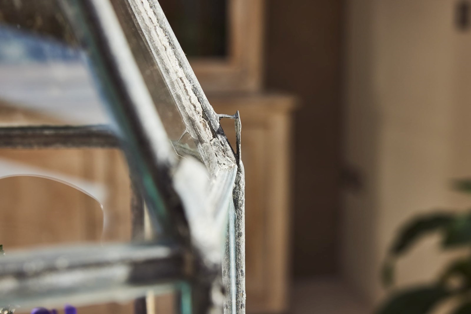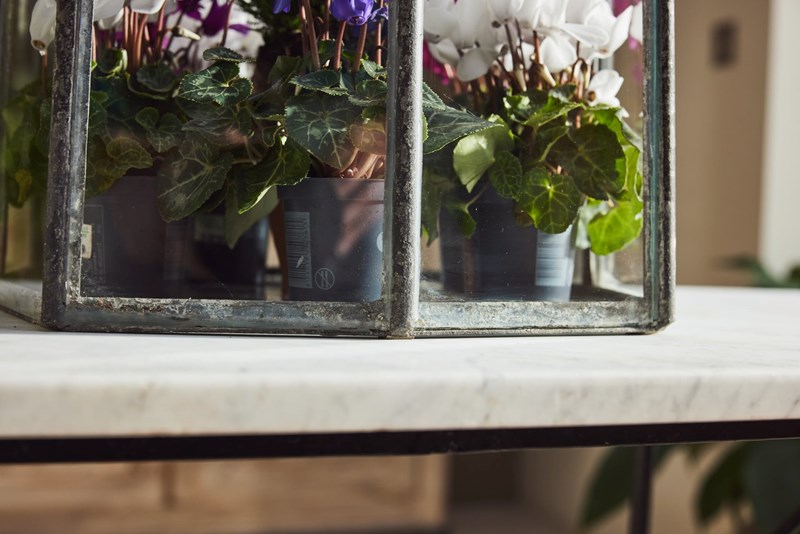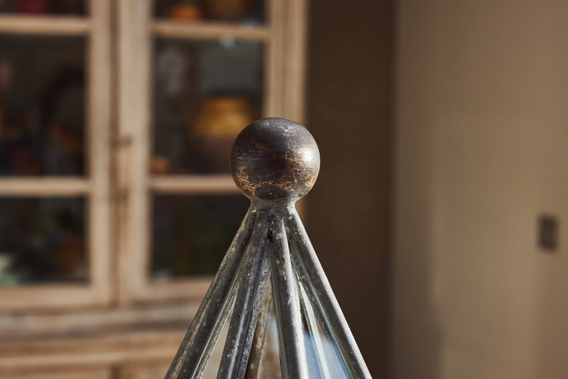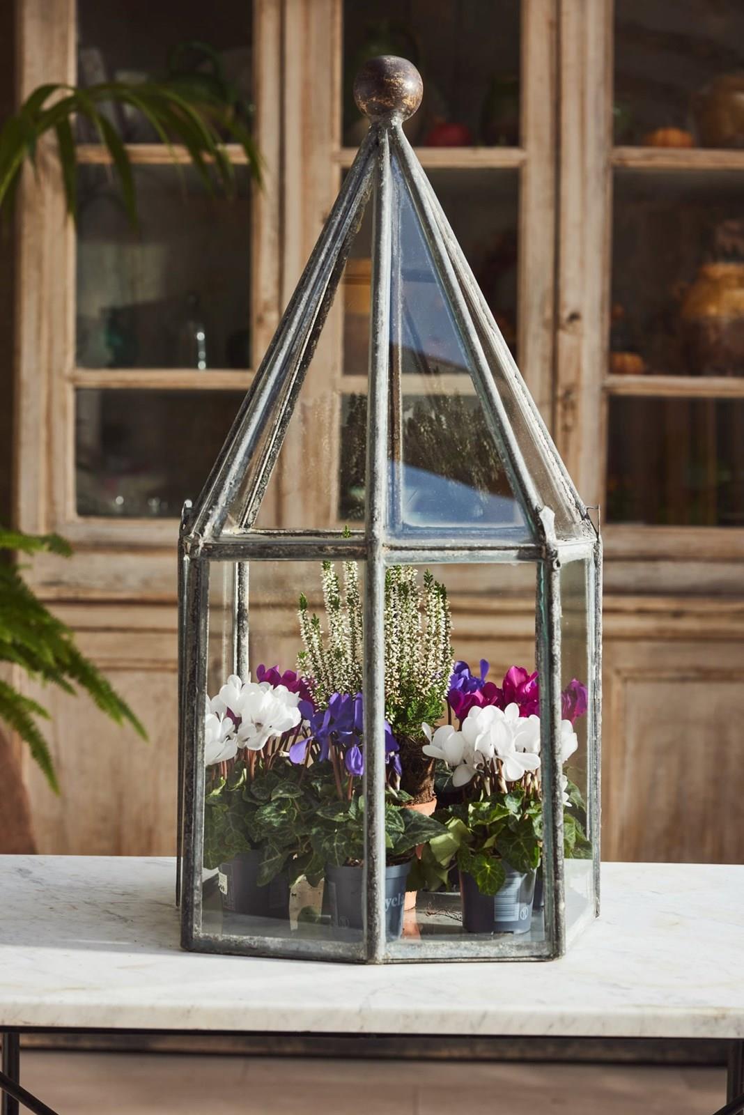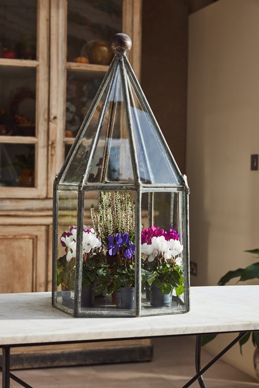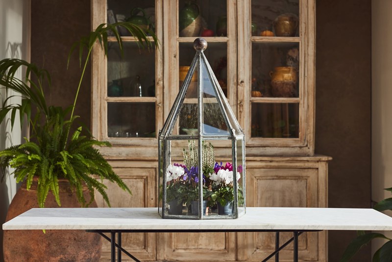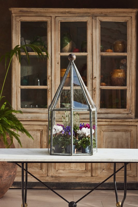 Six-sided mid-century terrarium in excellent condition, with original glass panels throughout and no cracks. The structure has a church-spire silhouette and is finished with a brass finial. One side is open for easy access, making it practical for planting, seasonal flower displays, or creating a small indoor garden. All original and a particularly characterful piece for year-round use.
