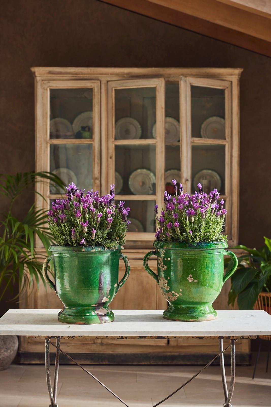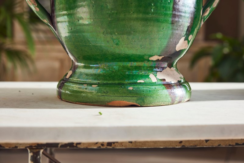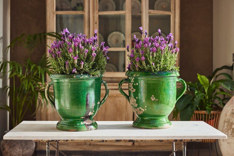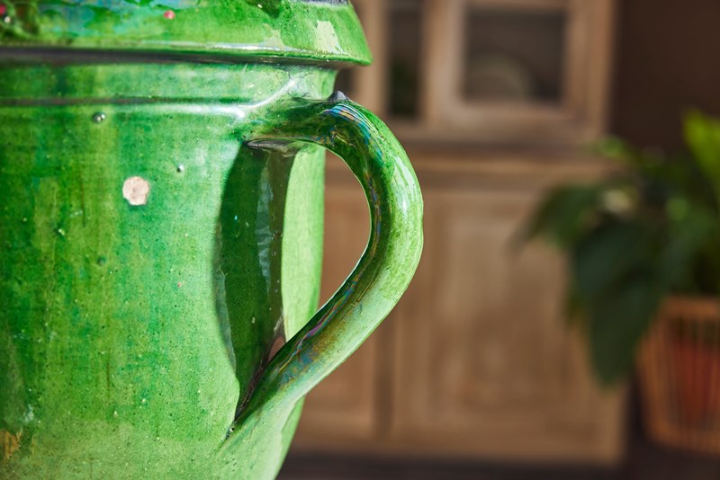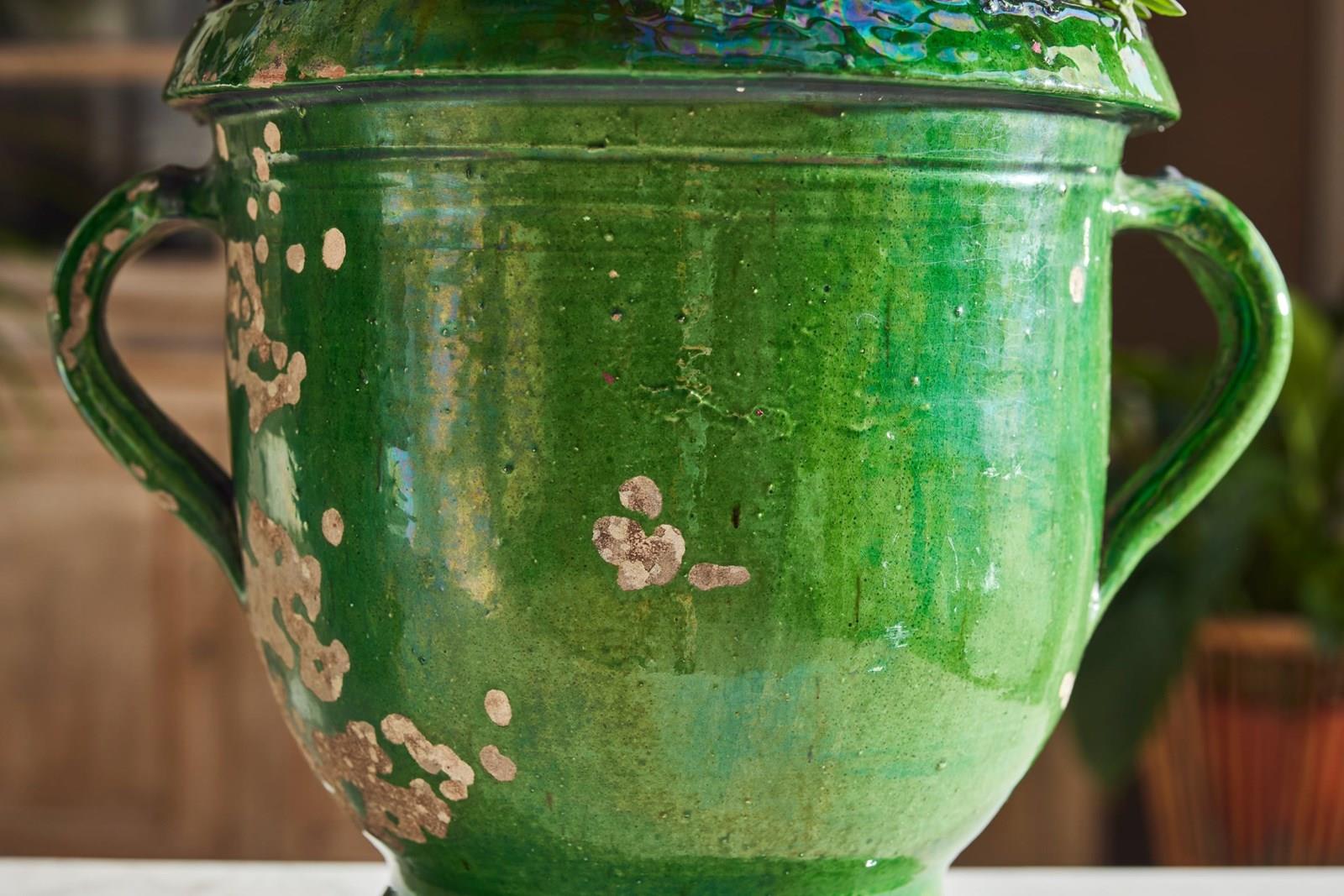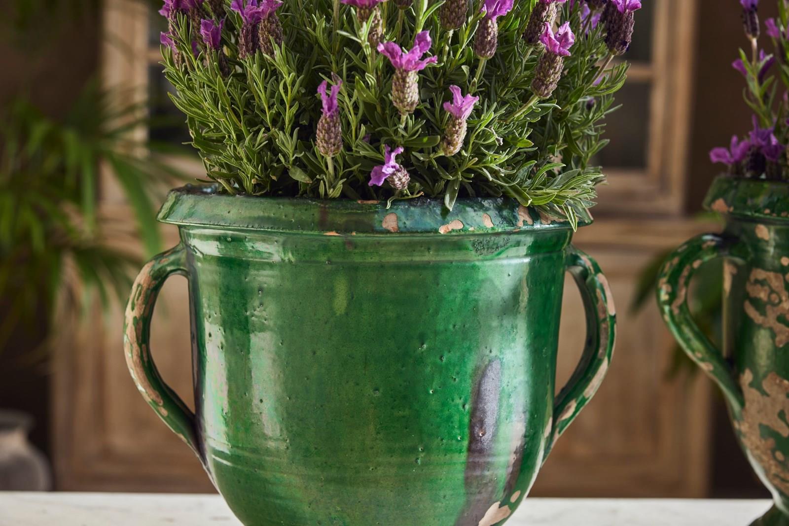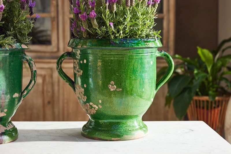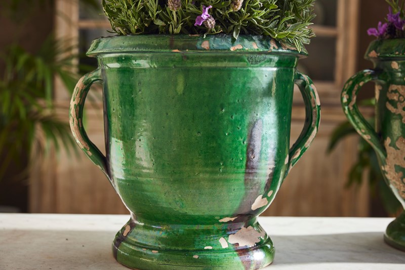 A lovely near pair of green-glazed terracotta urns, handcrafted in the early 20th century in the charming village of Castelnaudary, South of France. With their rich, glossy finish and timeless elegance, these urns are a true celebration of French artisan tradition. Whether brimming with fresh blooms or lush houseplants, they promise to bring a touch of rustic sophistication and old-world charm to any space.