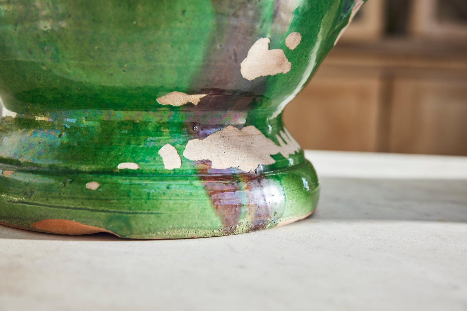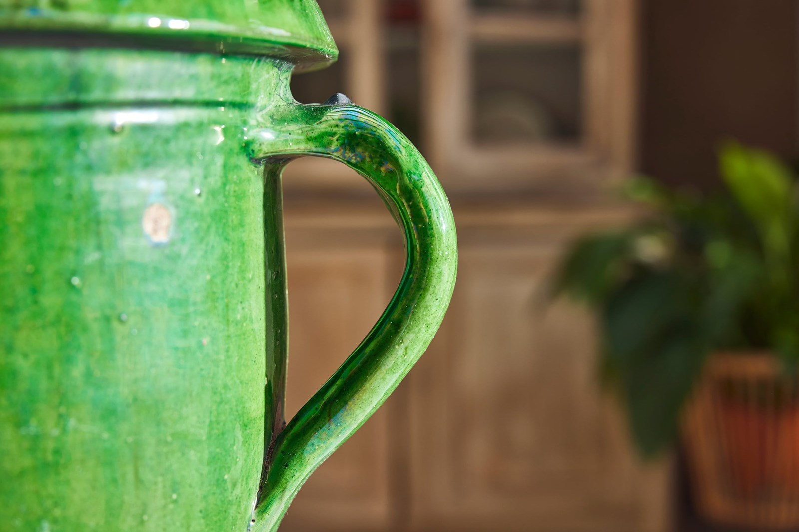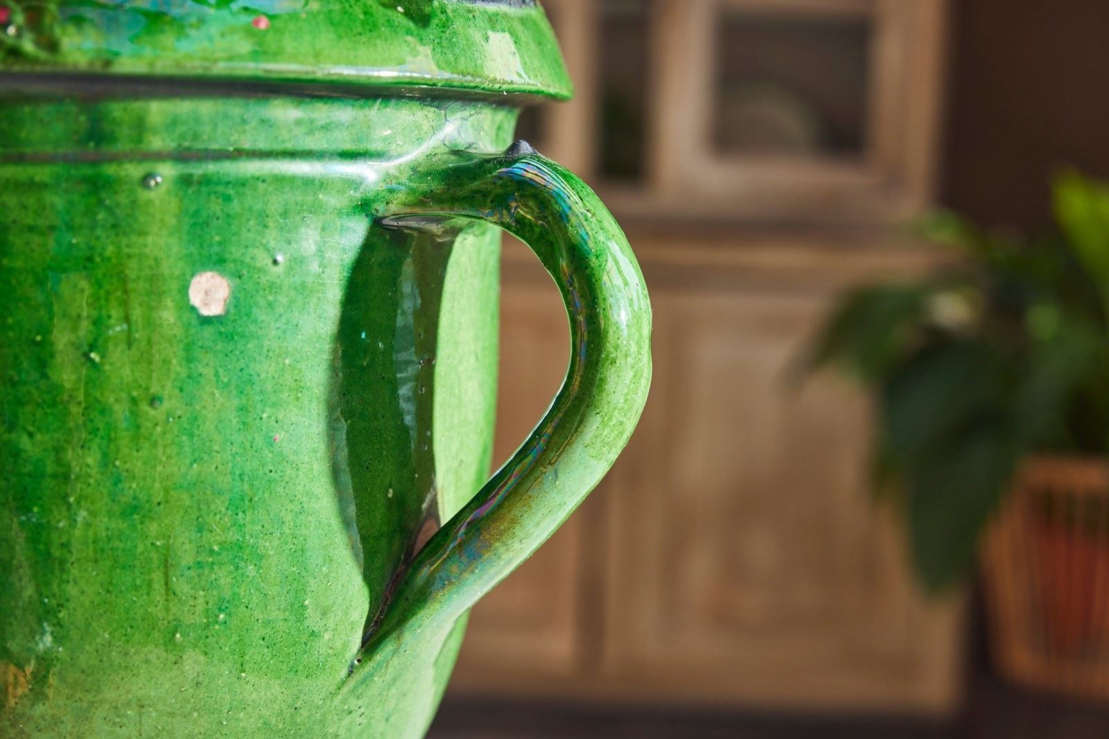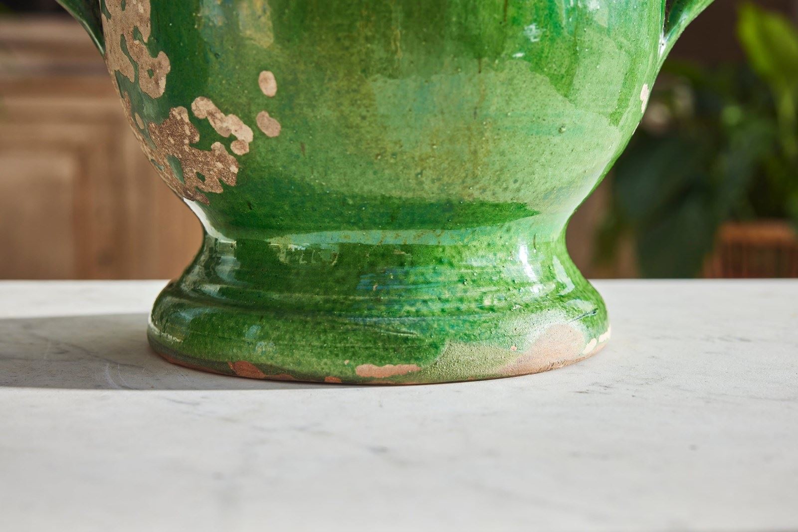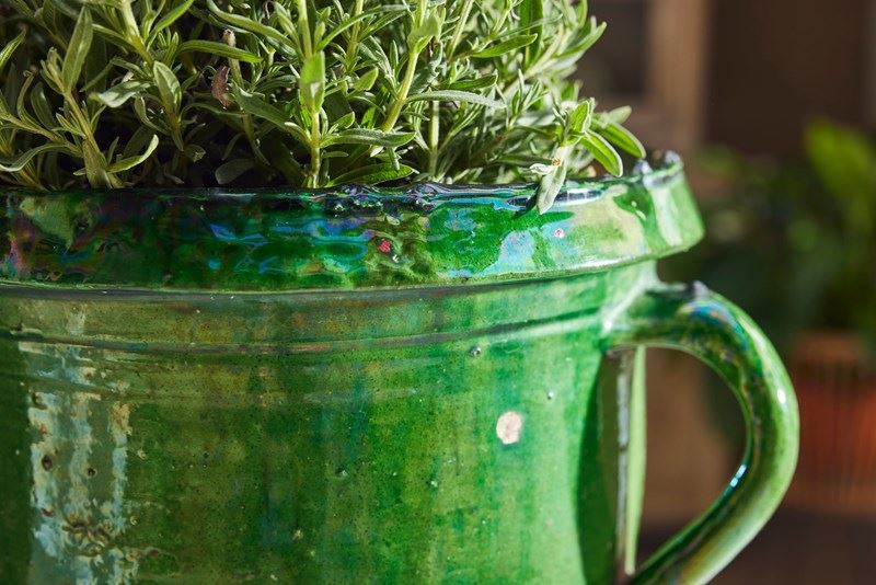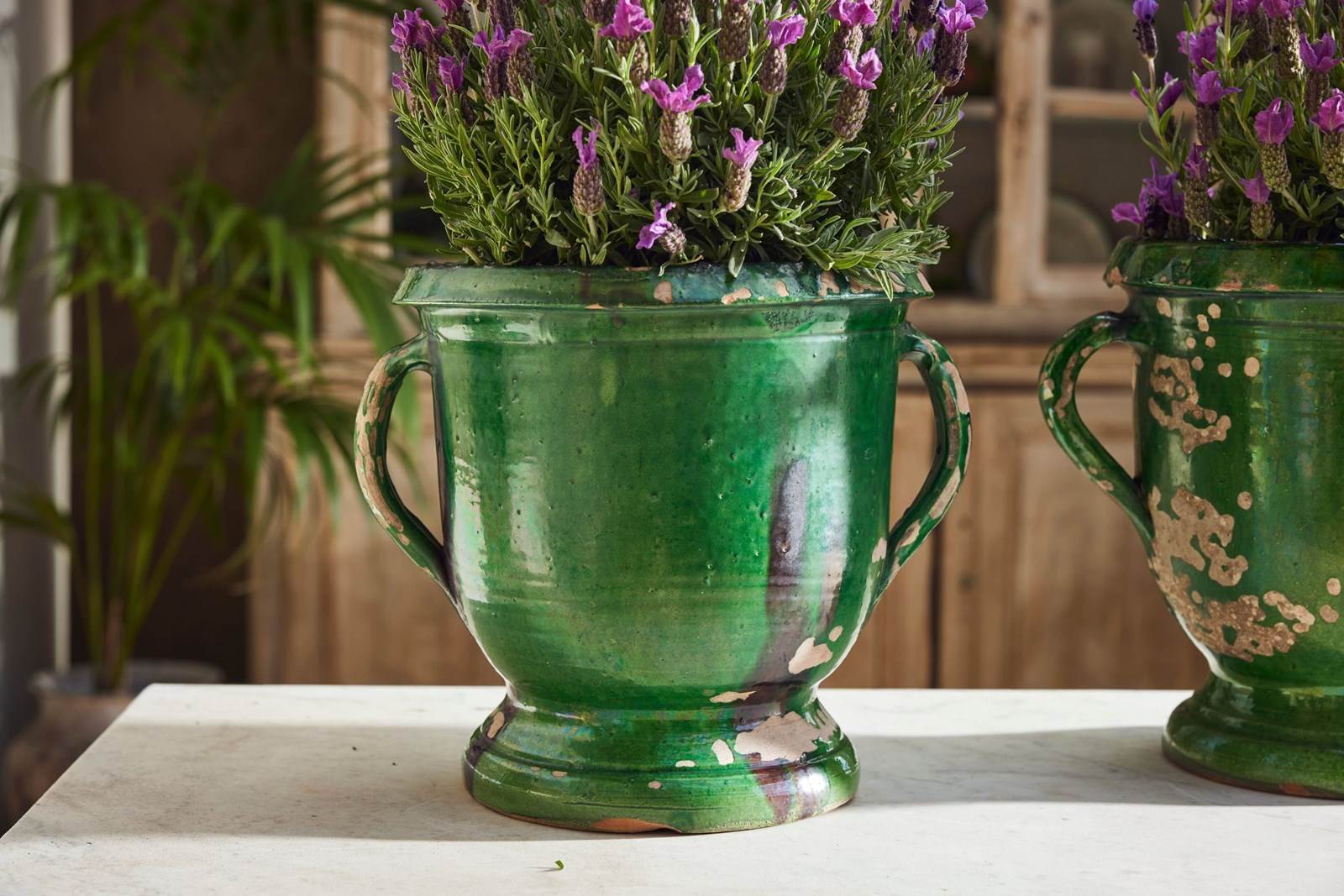 A lovely near pair of green-glazed terracotta urns, handcrafted in the early 20th century in the charming village of Castelnaudary, South of France. With their rich, glossy finish and timeless elegance, these urns are a true celebration of French artisan tradition. Whether brimming with fresh blooms or lush houseplants, they promise to bring a touch of rustic sophistication and old-world charm to any space.