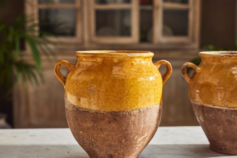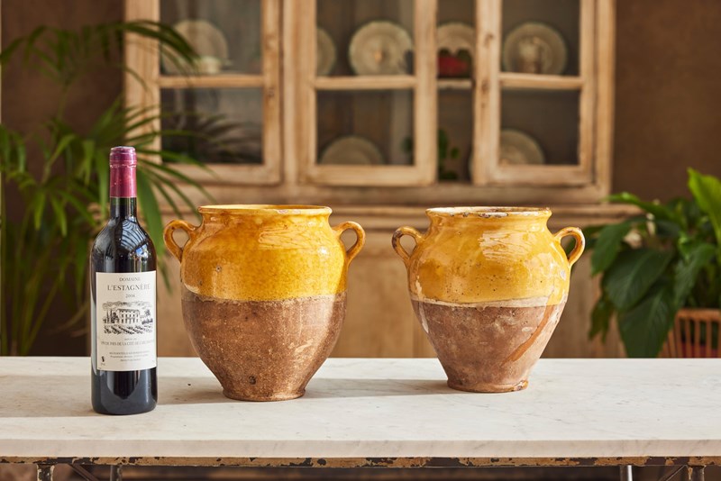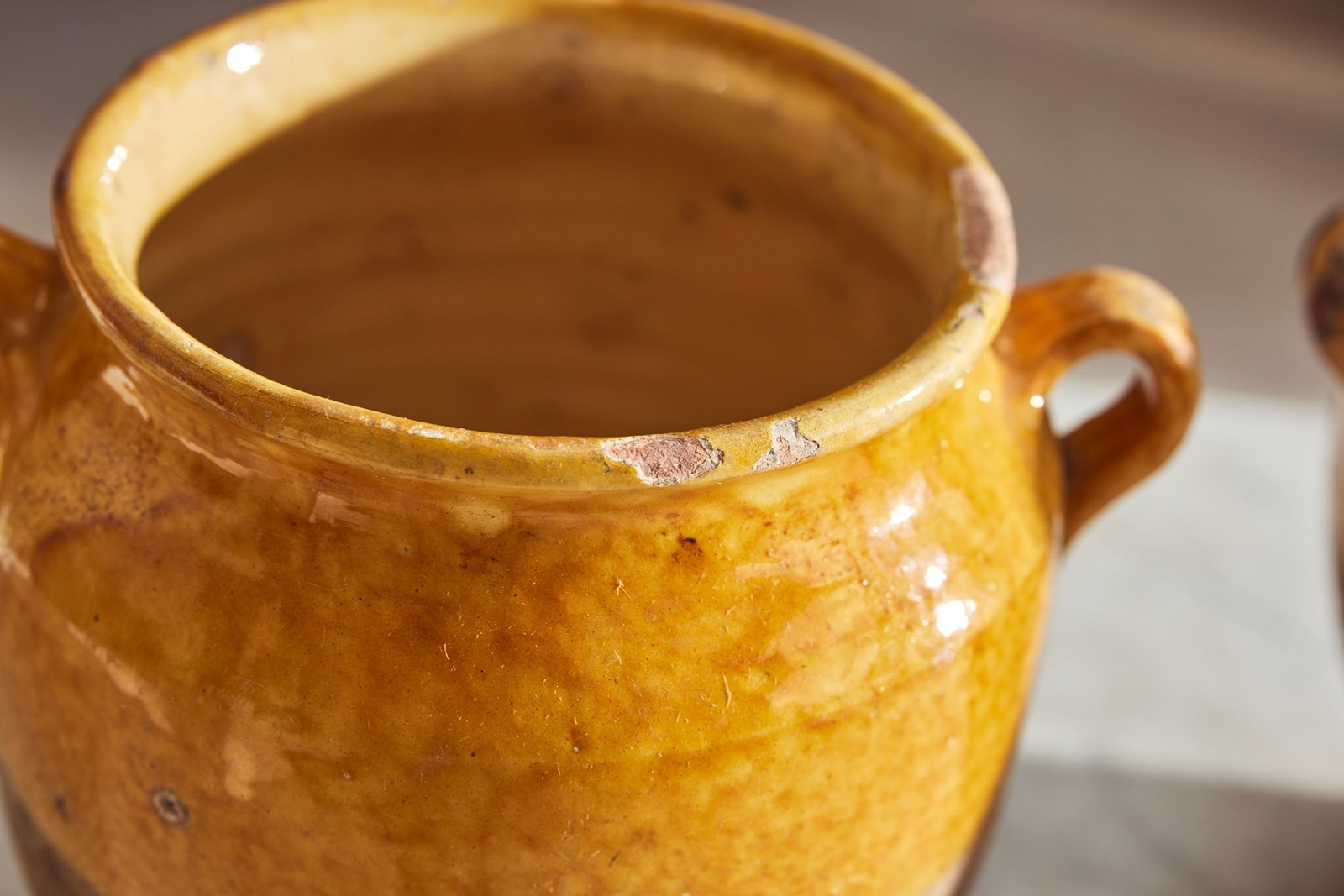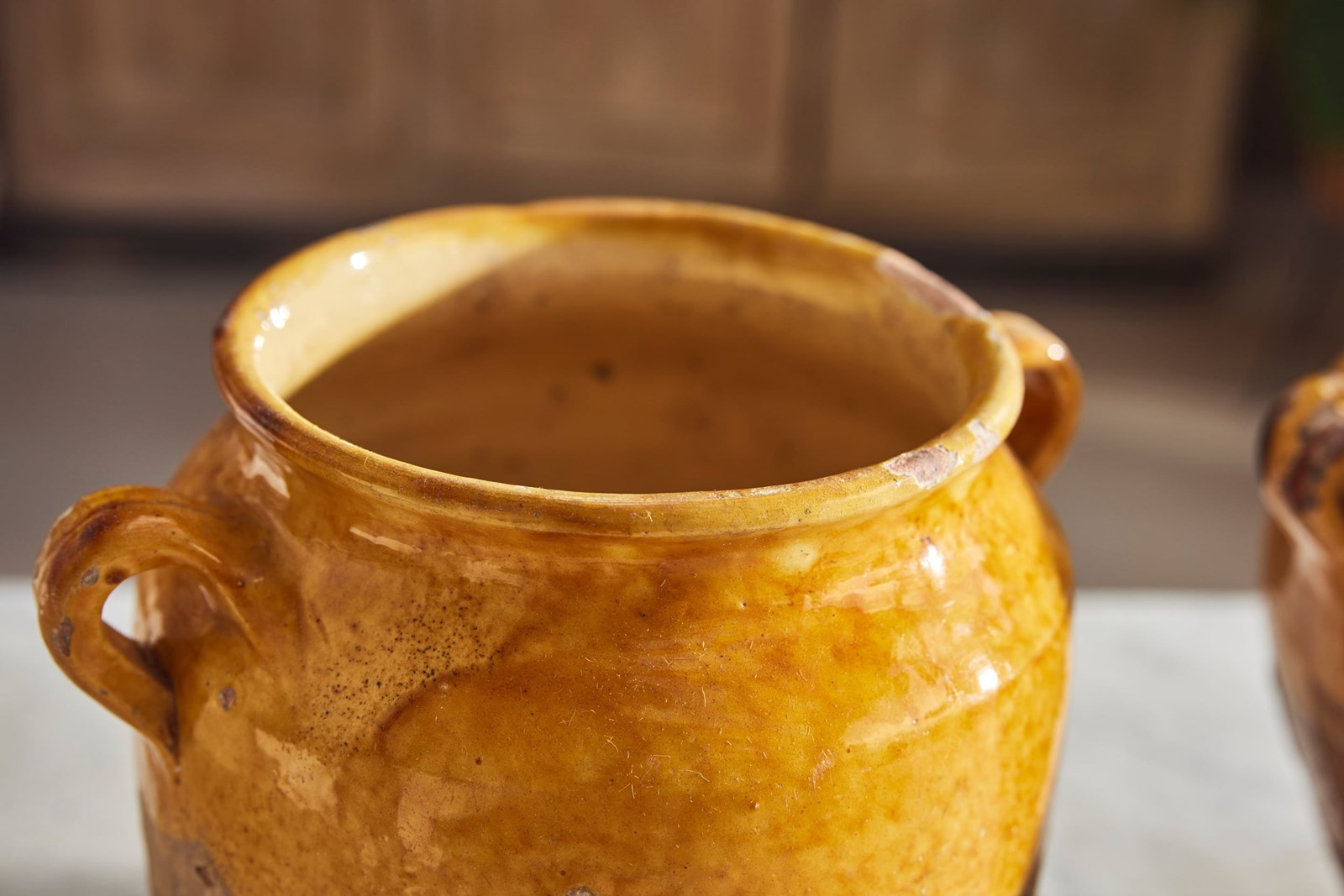 A charming pair of 19th-century French confit pots, distinguished by their rich, deep yellow glaze—more vibrant than the paler tones of later versions. Once used to preserve food these compact pots are now perfect as decorative accents for shelves, consoles, or table tops. Full of rustic character and Provençal charm.