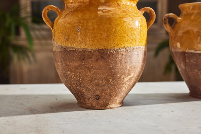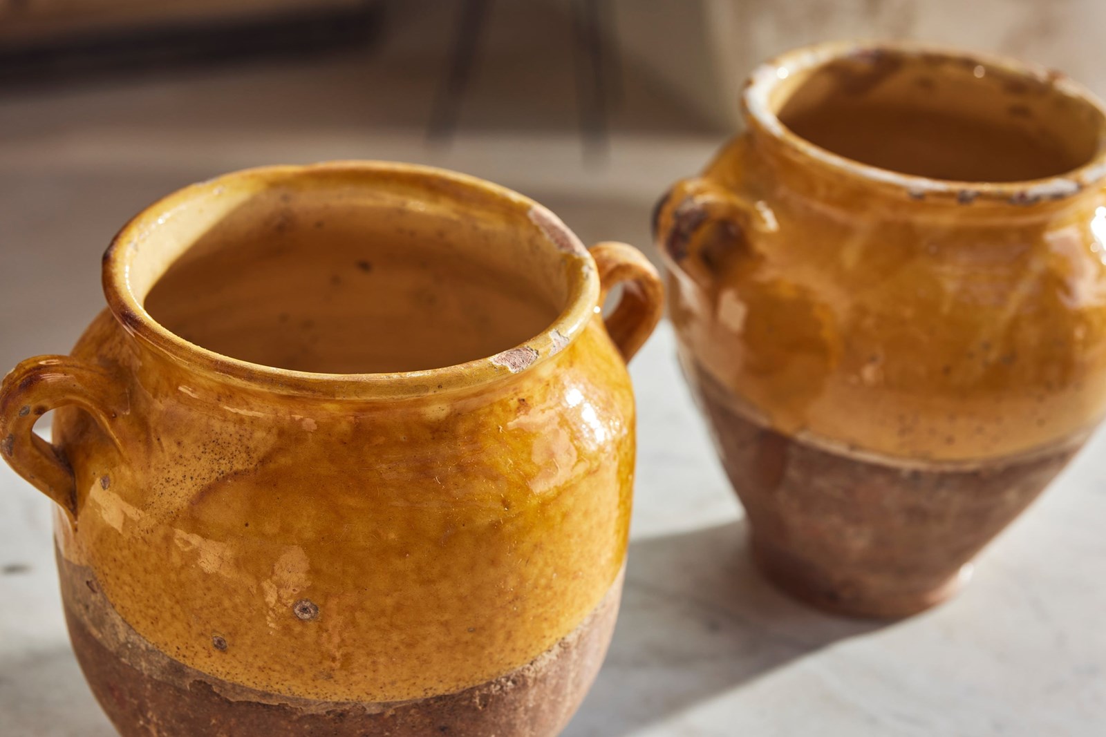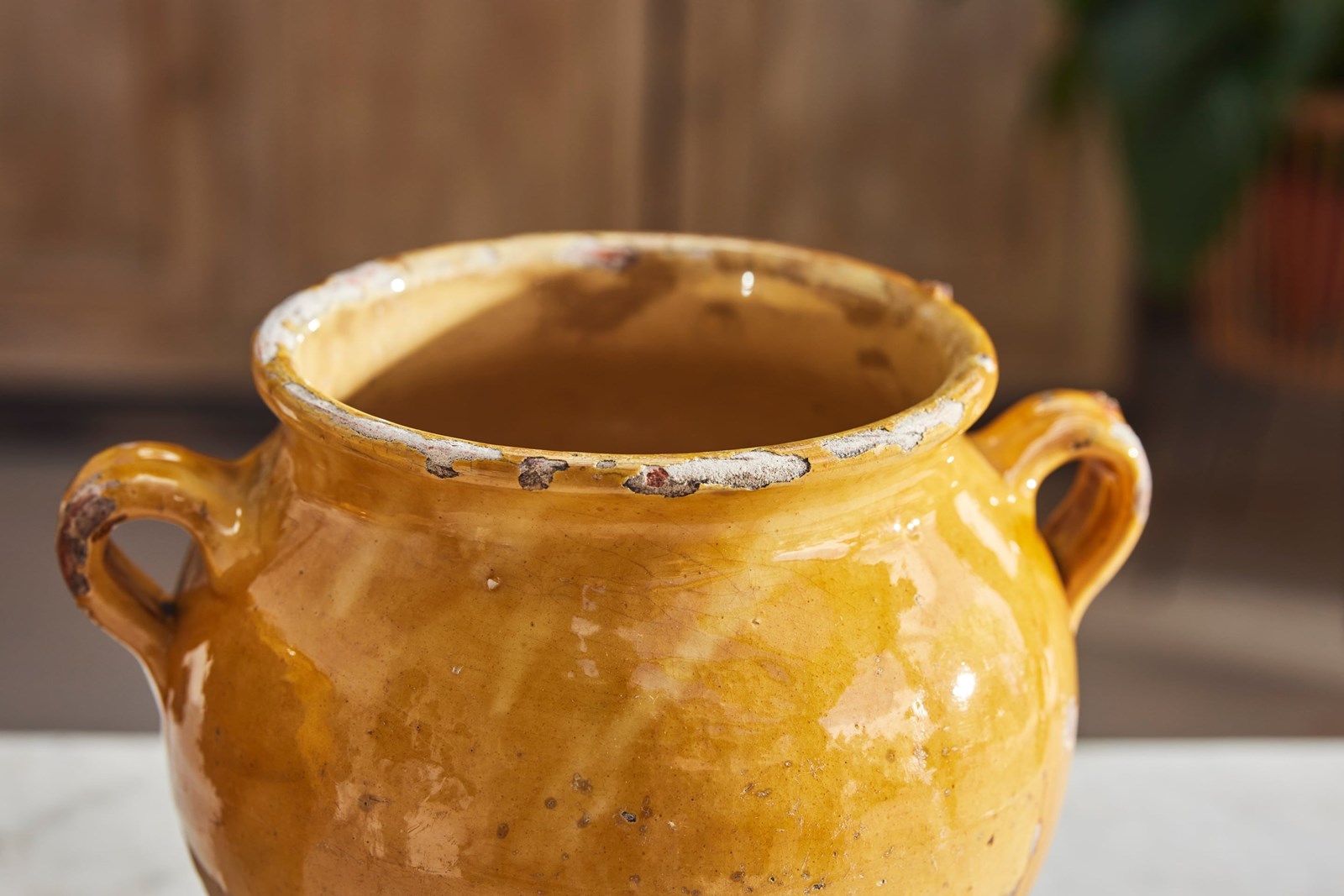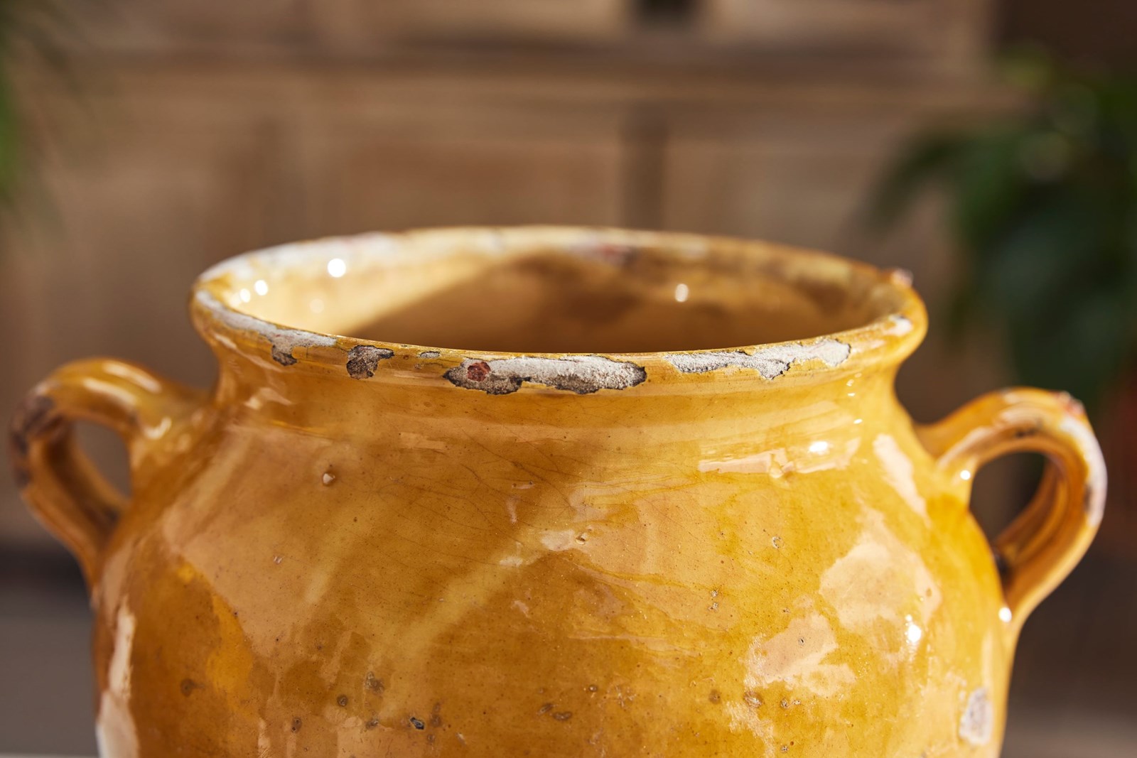 A charming pair of 19th-century French confit pots, distinguished by their rich, deep yellow glaze—more vibrant than the paler tones of later versions. Once used to preserve food these compact pots are now perfect as decorative accents for shelves, consoles, or table tops. Full of rustic character and Provençal charm.