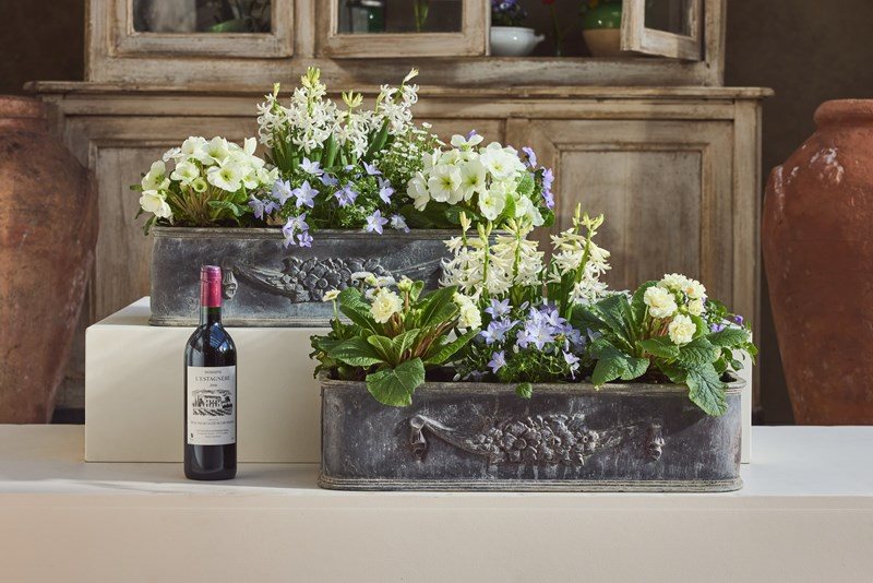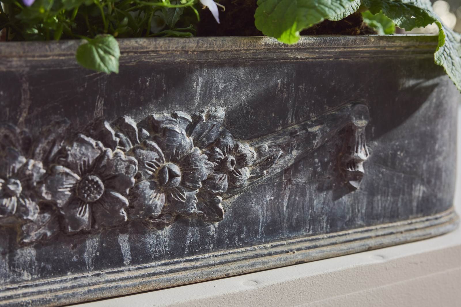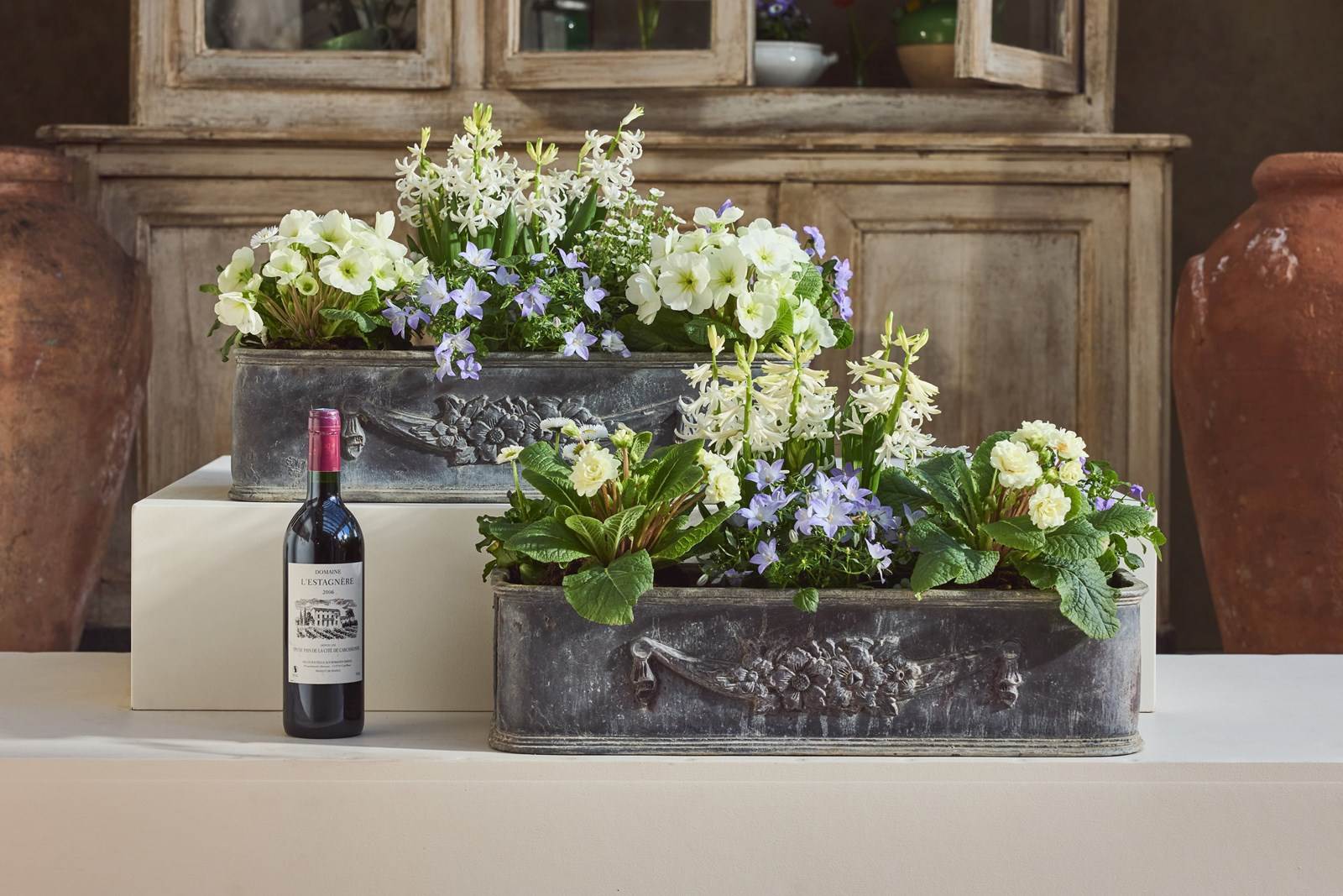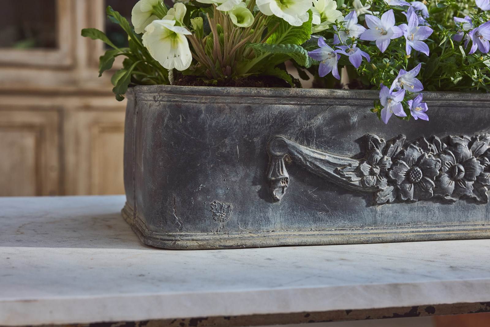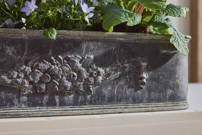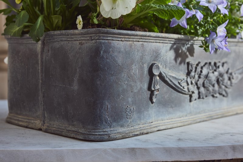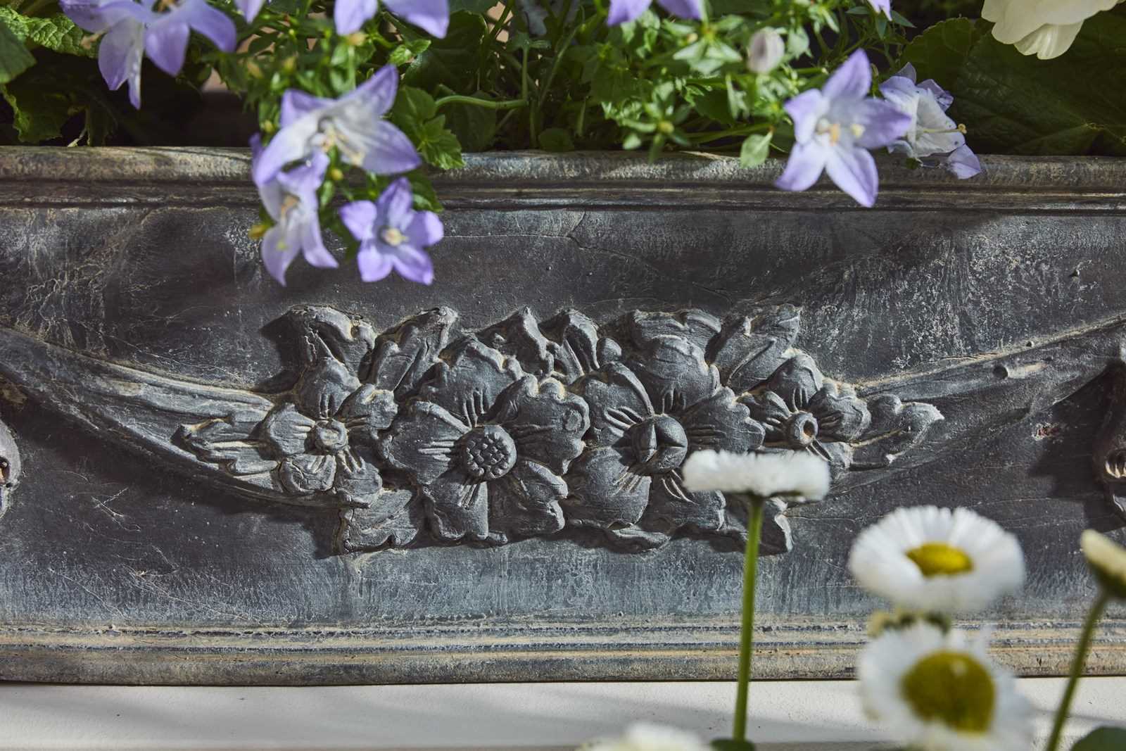Each planter is decorated with a charming garland of flowers, adding an elegant classical detail. English in origin but discovered in the South of France, they carry a lovely sense of age and history.
