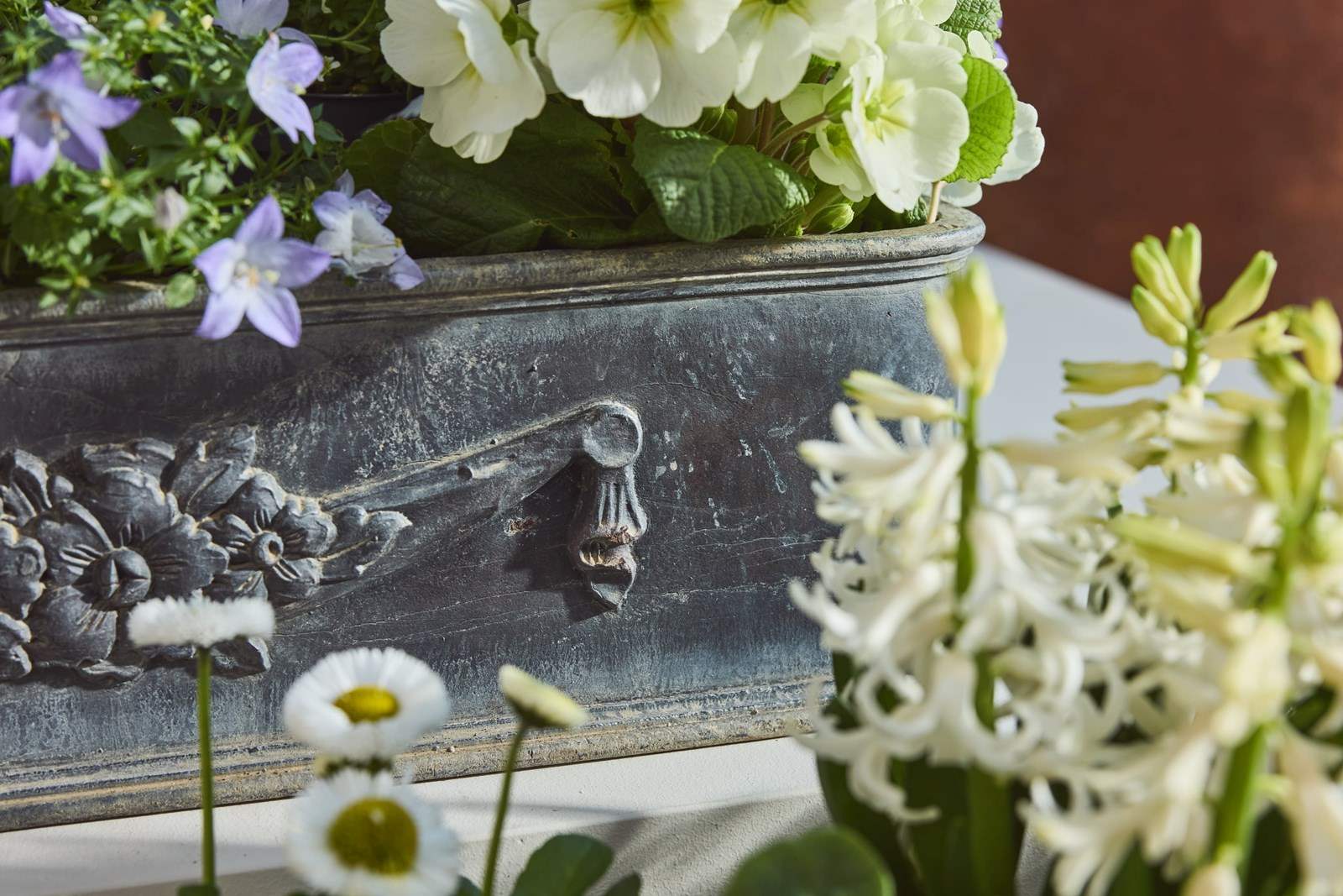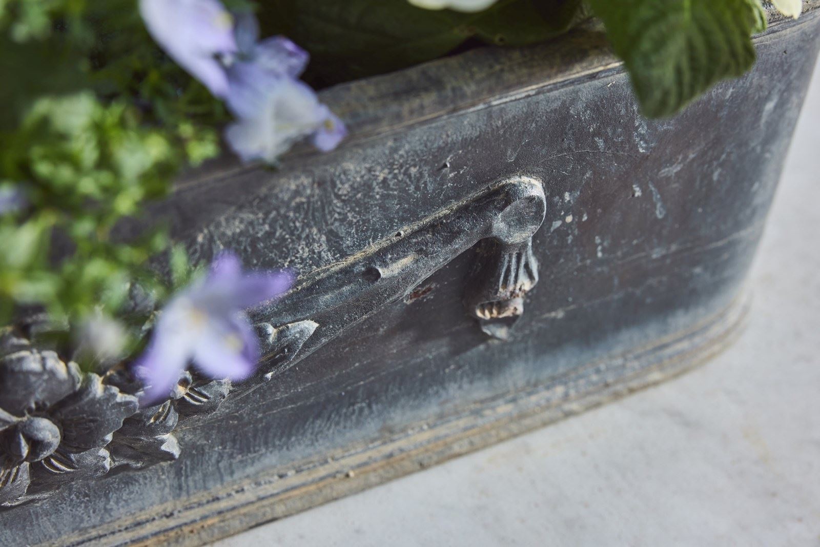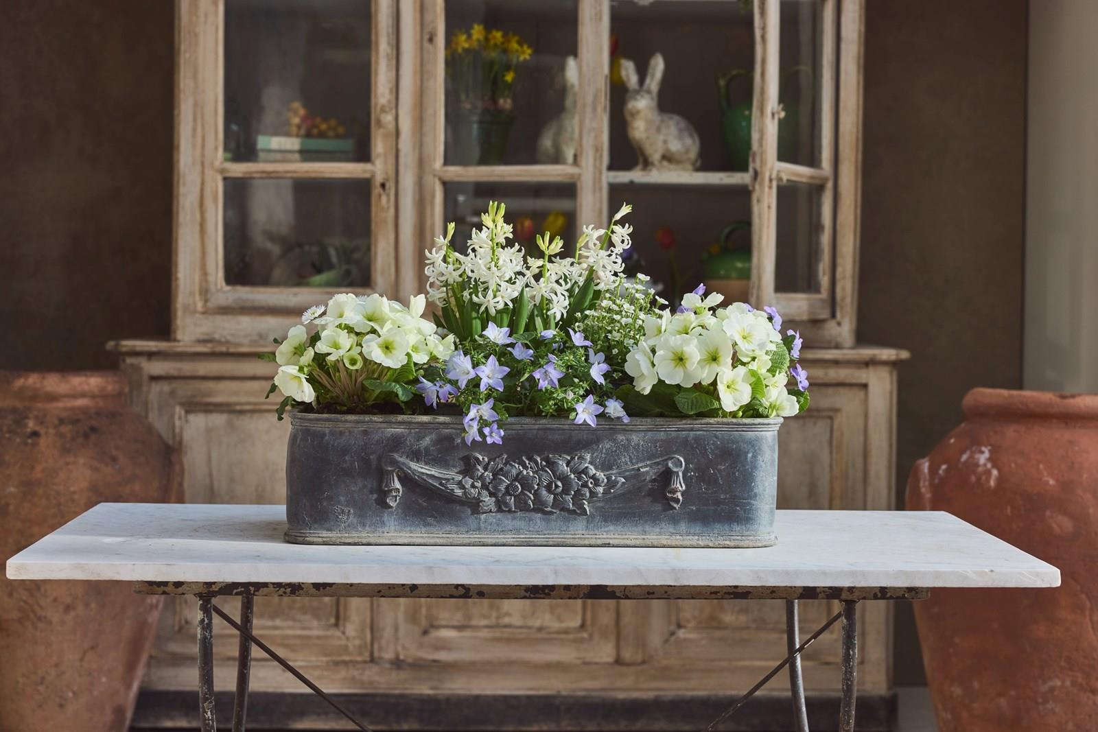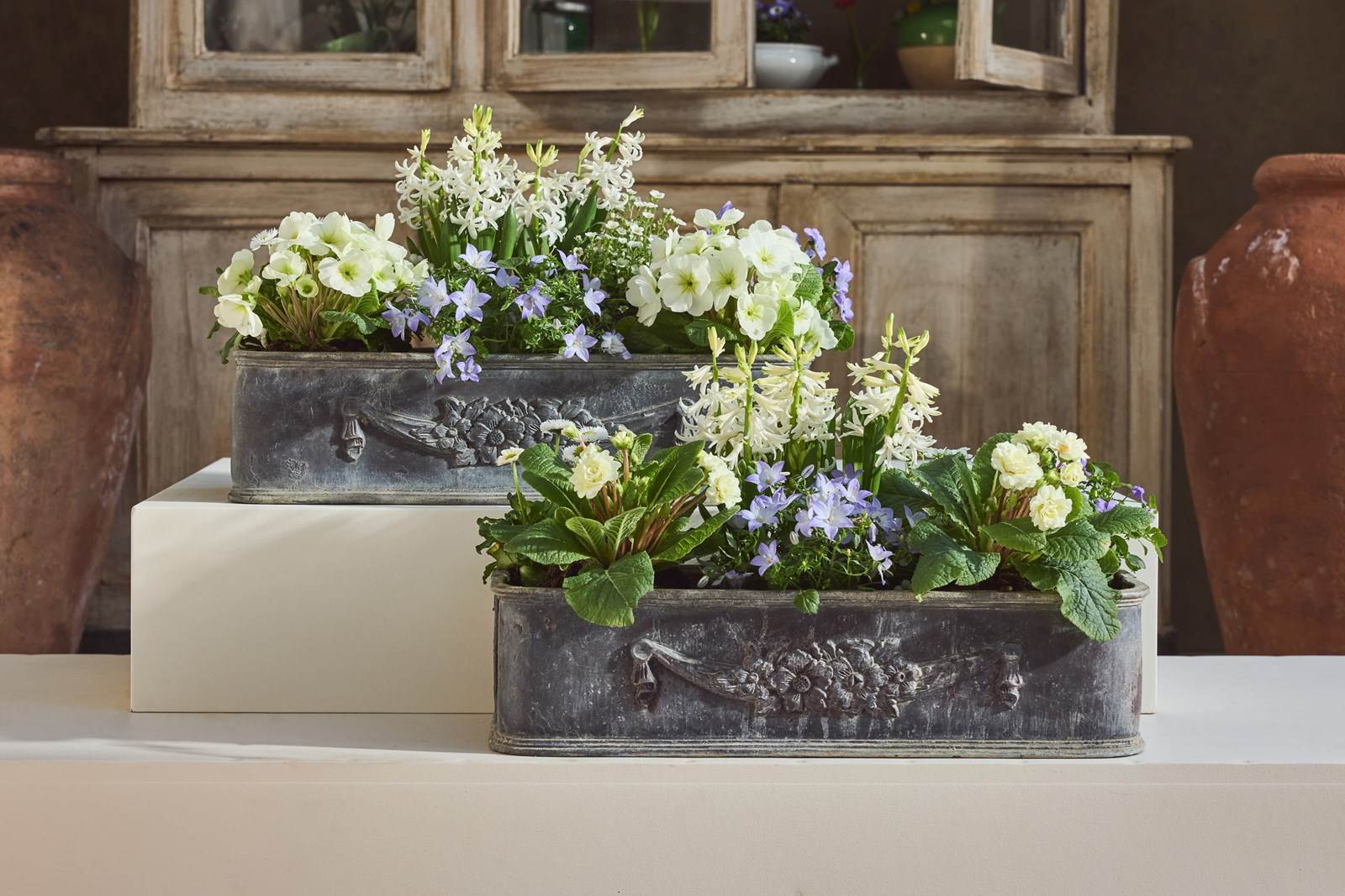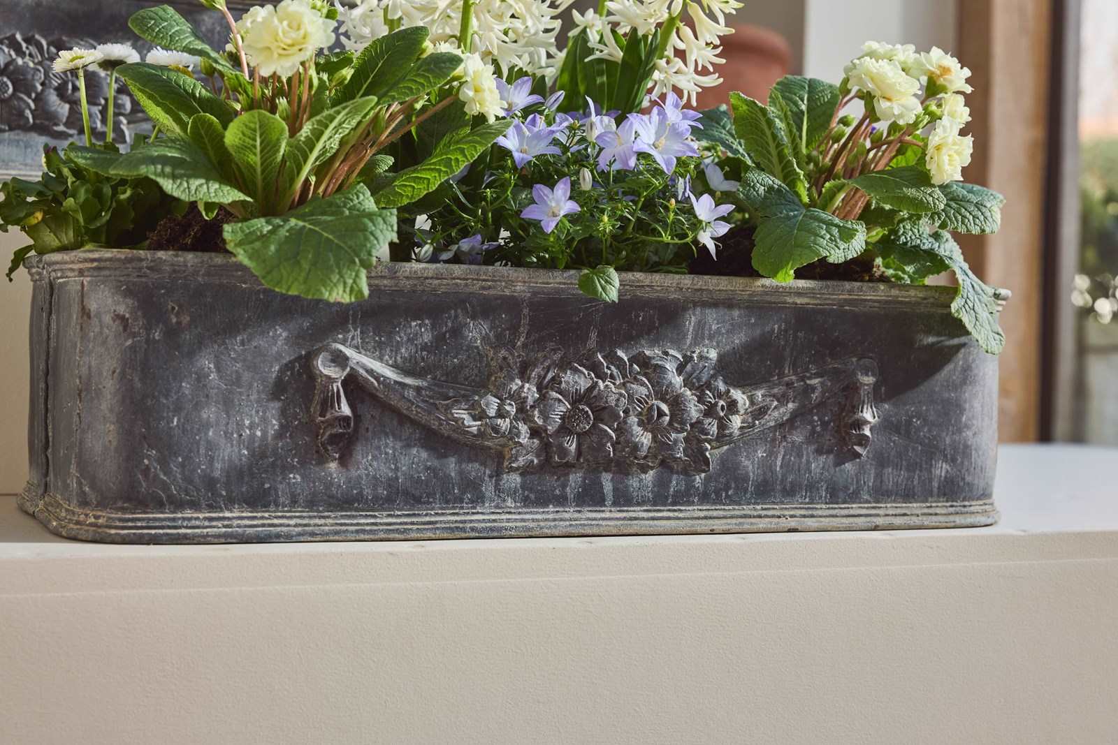 Each planter is decorated with a charming garland of flowers, adding an elegant classical detail. English in origin but discovered in the South of France, they carry a lovely sense of age and history.