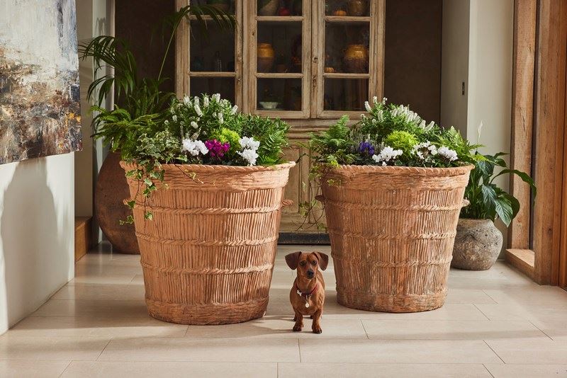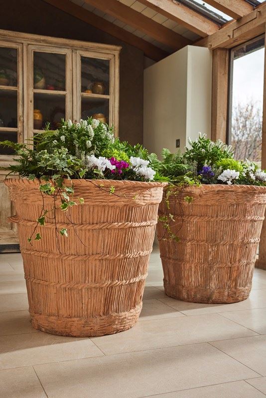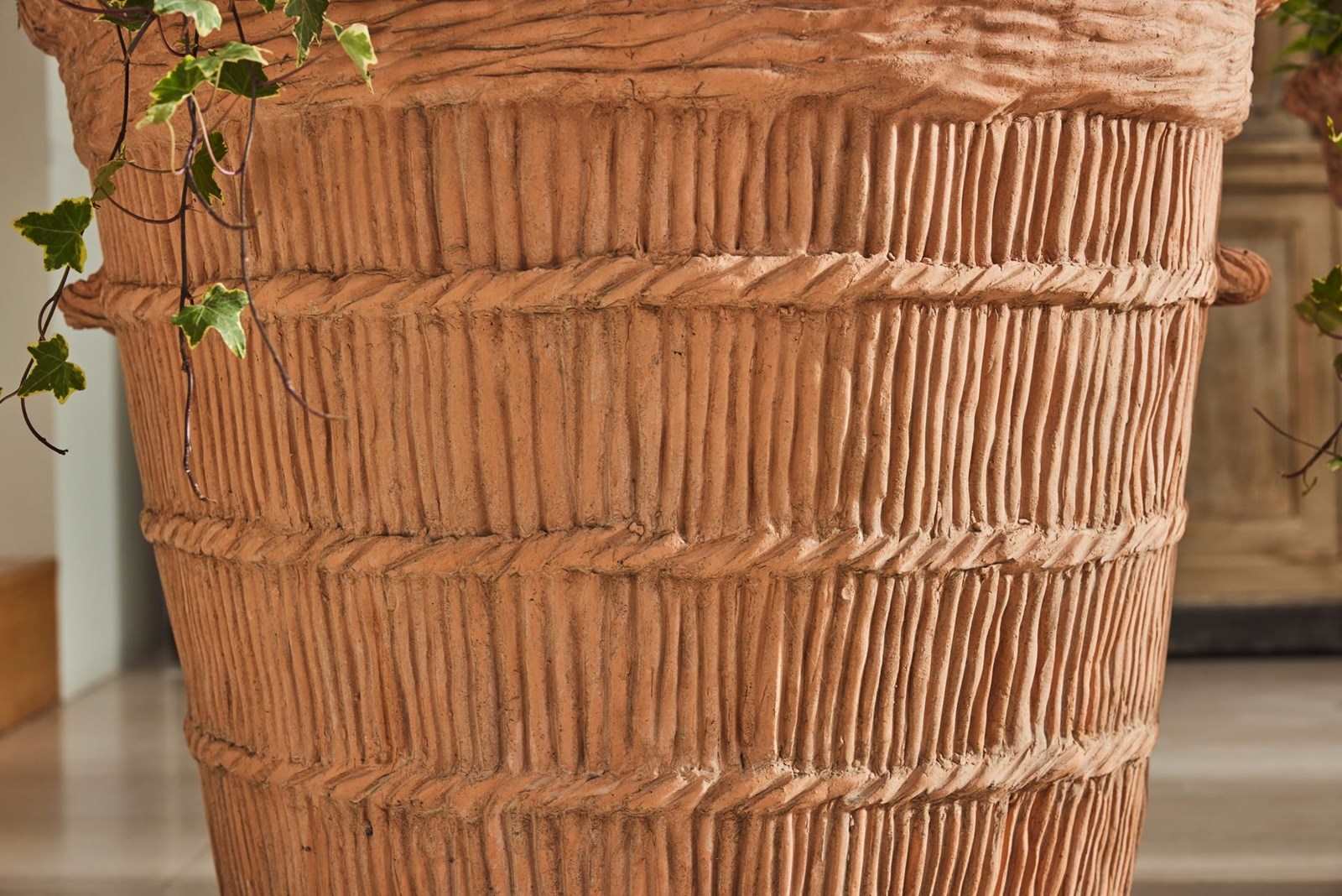 A pair of substantial terracotta planters modelled to resemble woven wicker baskets, produced in the 1960s using original 19th-century casts. The surface detail is crisp, with hand-finished texture that gives depth and a natural, well-crafted character.