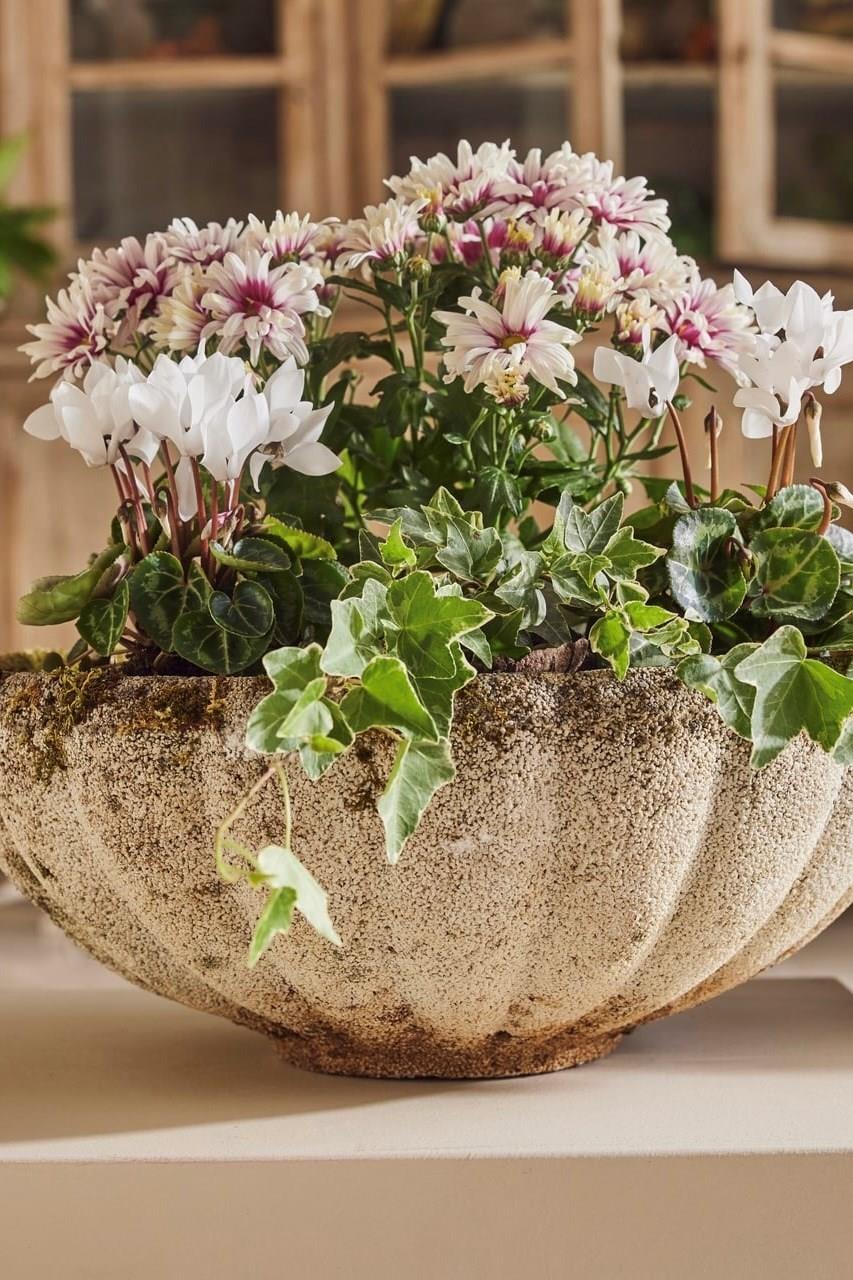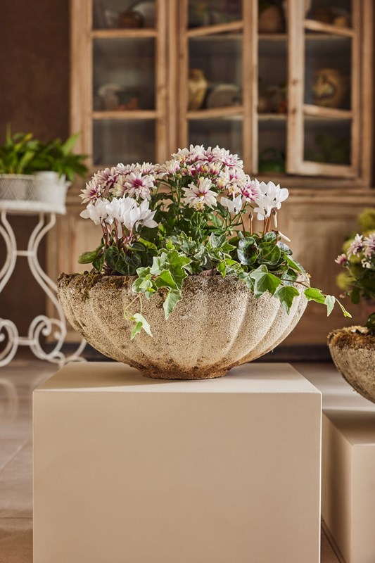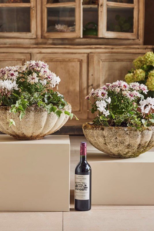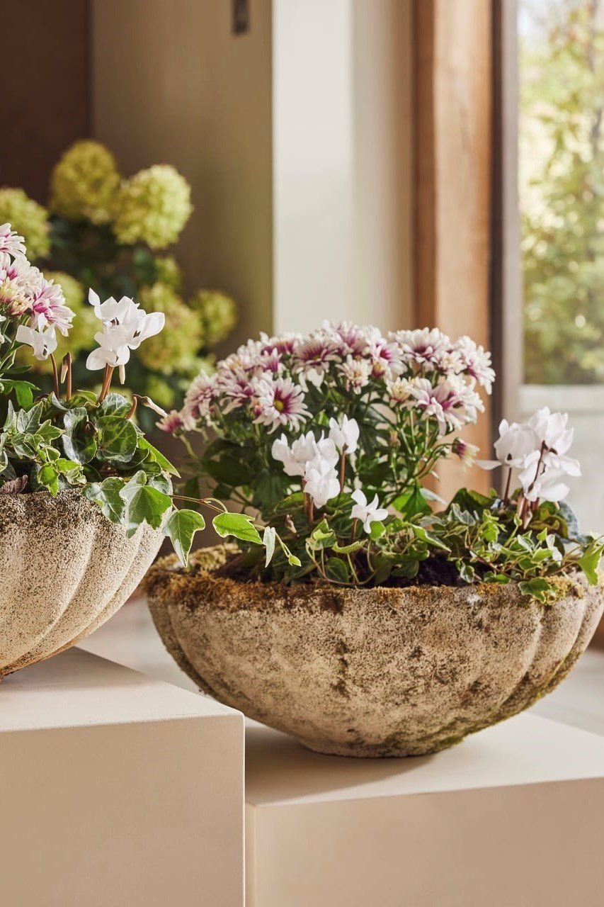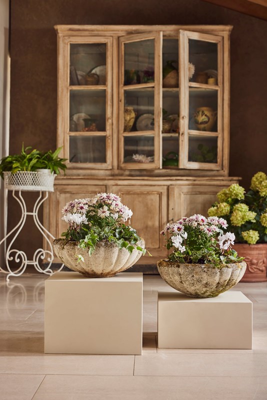 A charming pair of bowl planters with a gently weathered finish and scalloped bodies that blend seamlessly into a mature garden setting. Simple yet elegant, they are perfect for seasonal planting and remain in very good condition.