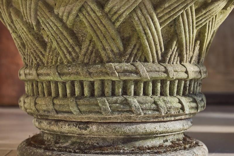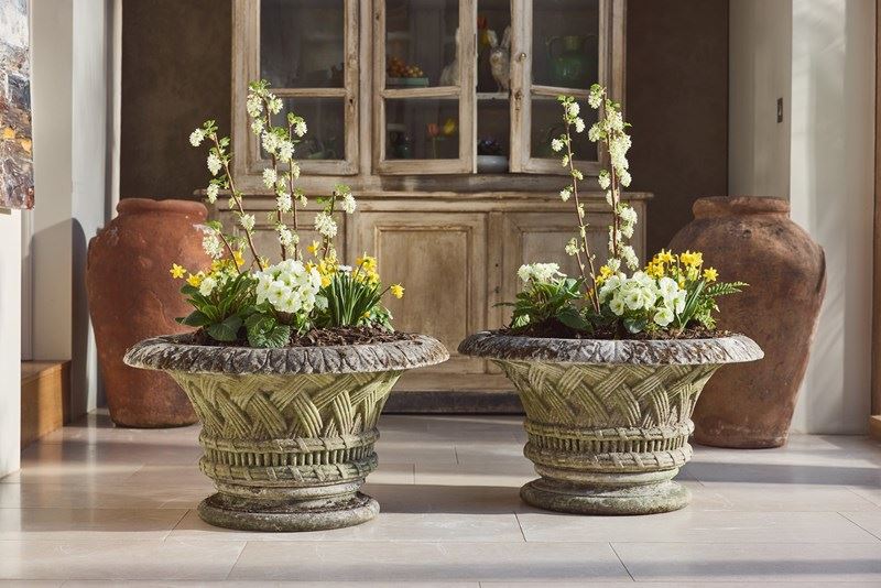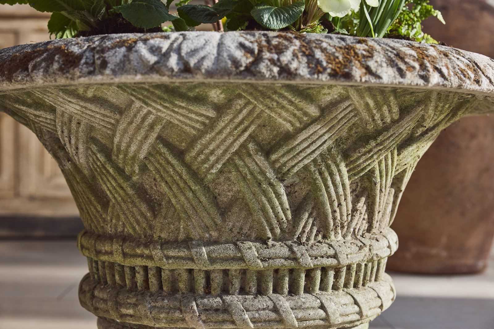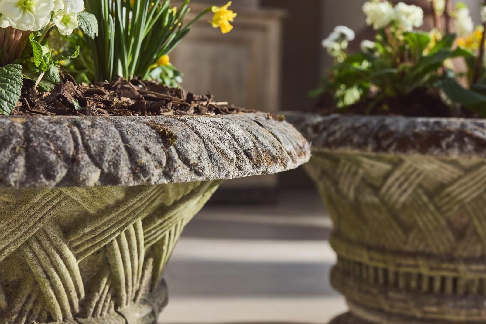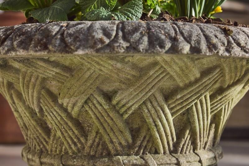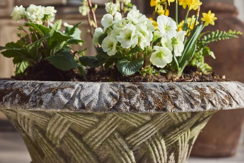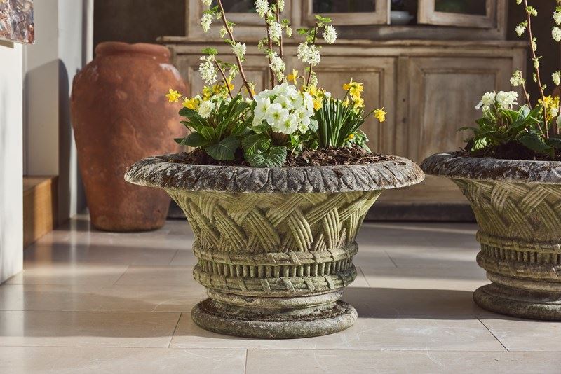 A pair of large cast stone garden urns dating from around 1910, of low flared form with basket-weave decoration, raised on circular bases. Nicely weathered, with good colour and surface character from years outdoors.