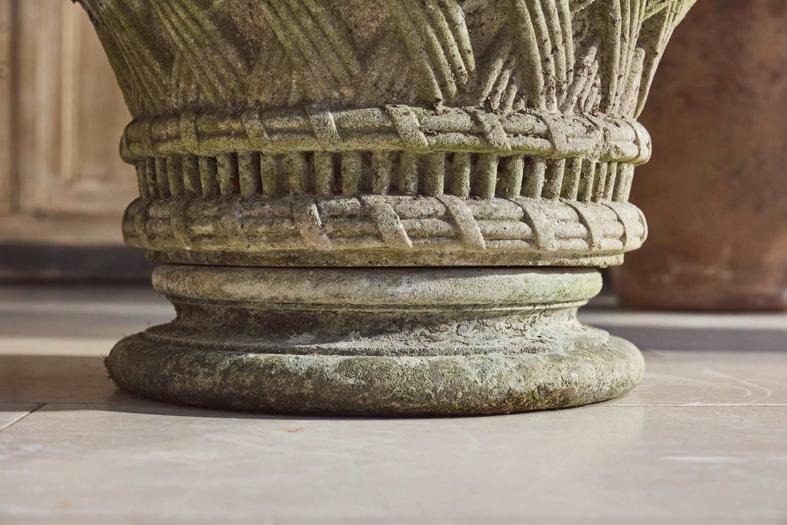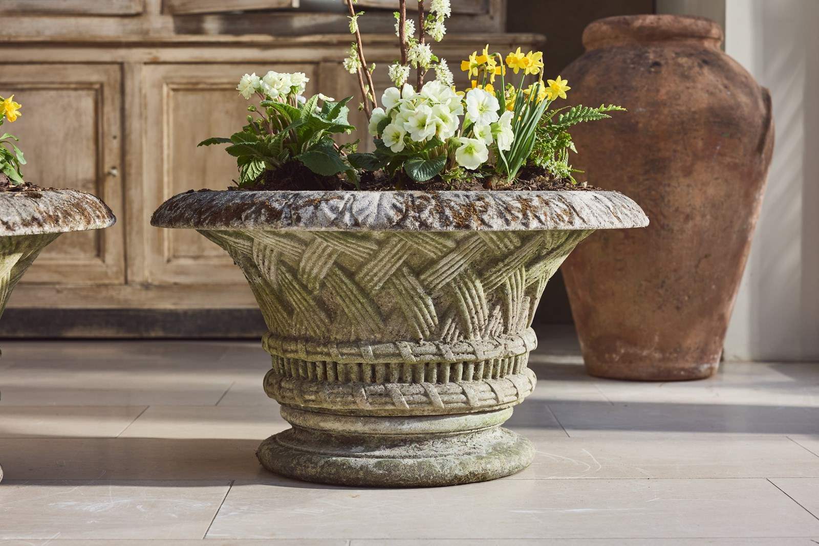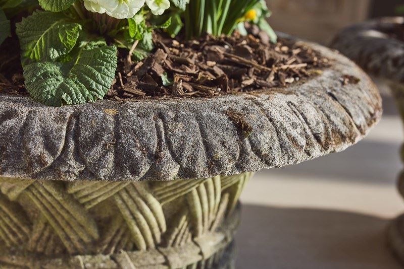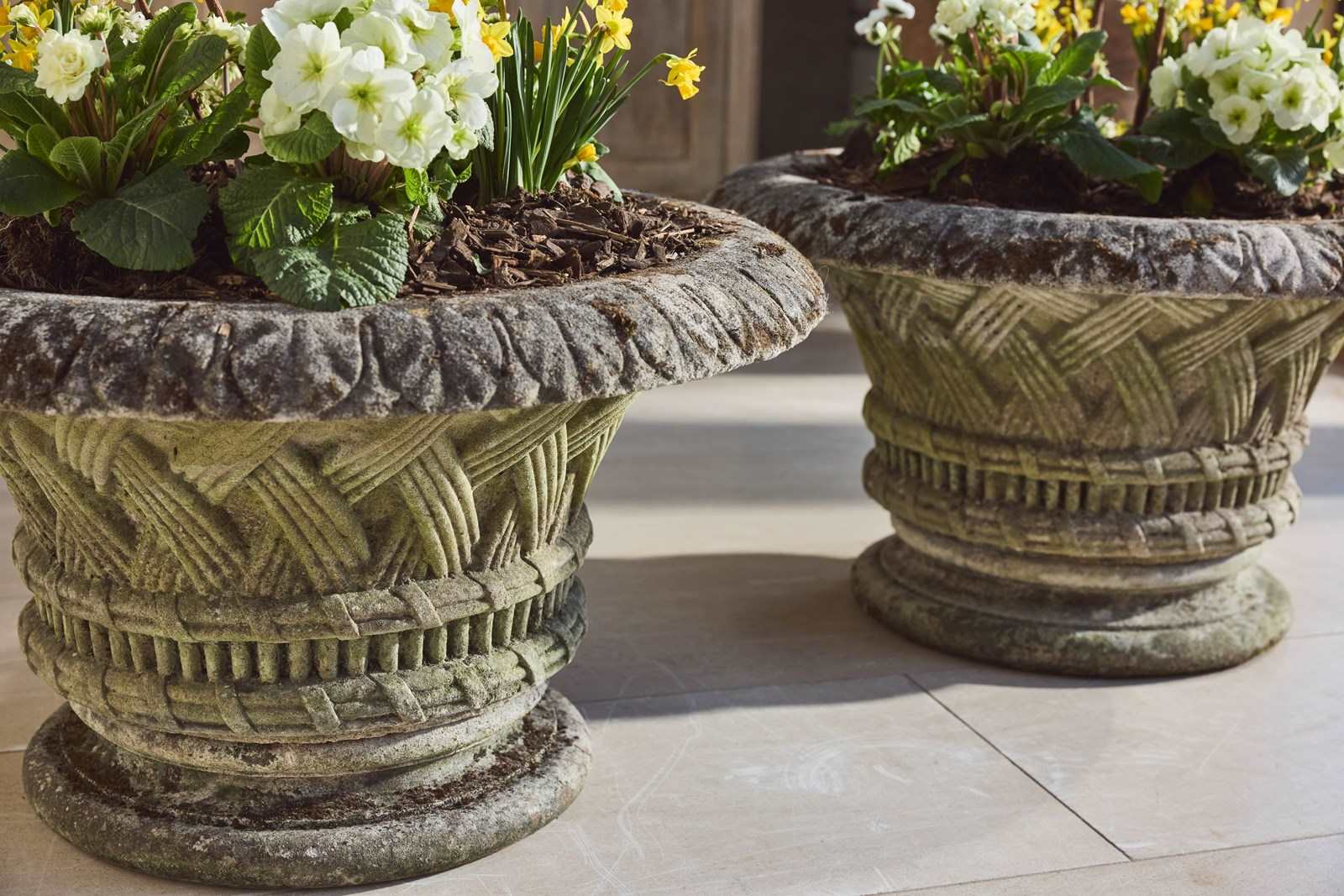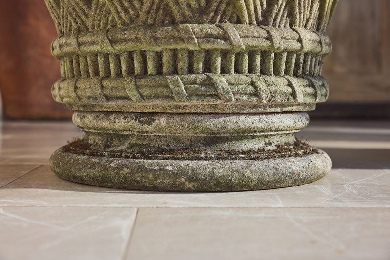 A pair of large cast stone garden urns dating from around 1910, of low flared form with basket-weave decoration, raised on circular bases. Nicely weathered, with good colour and surface character from years outdoors.