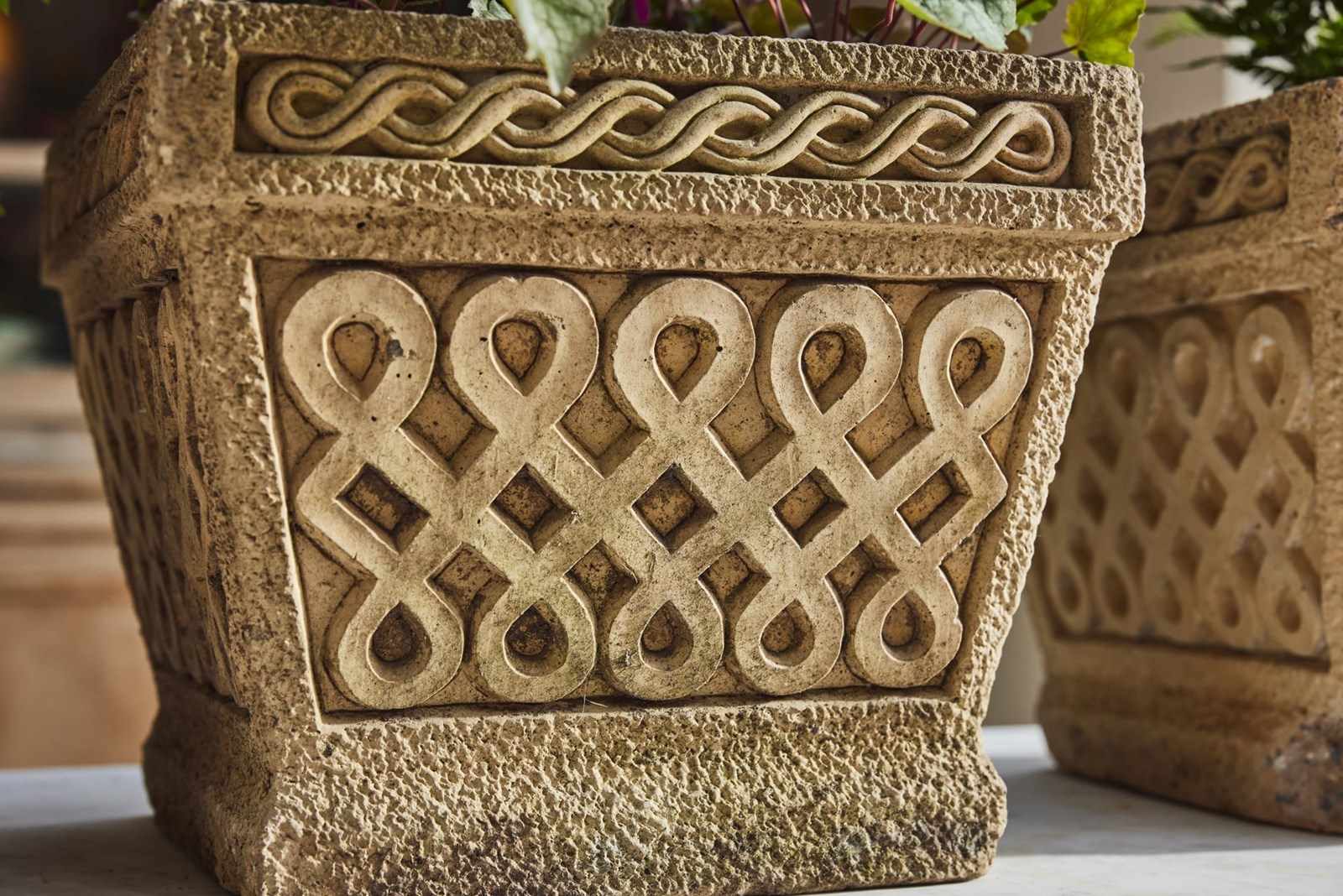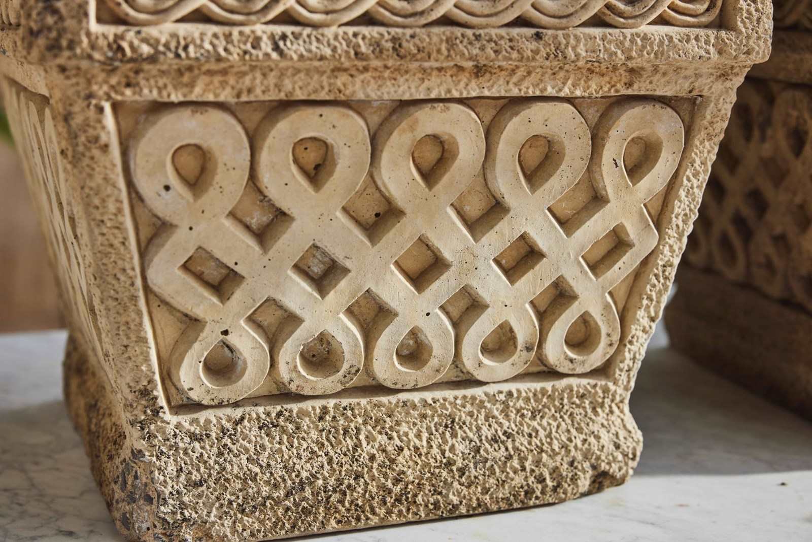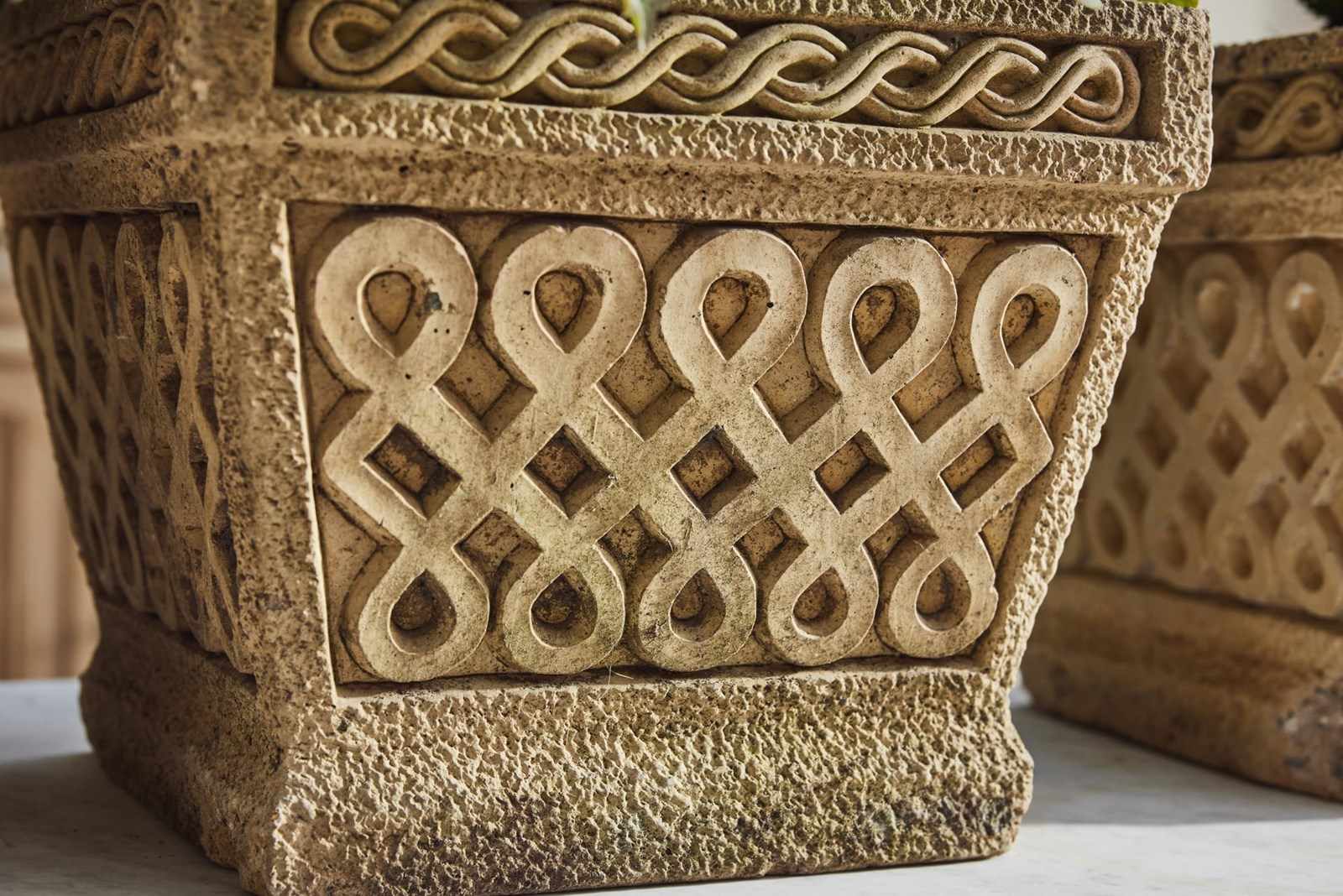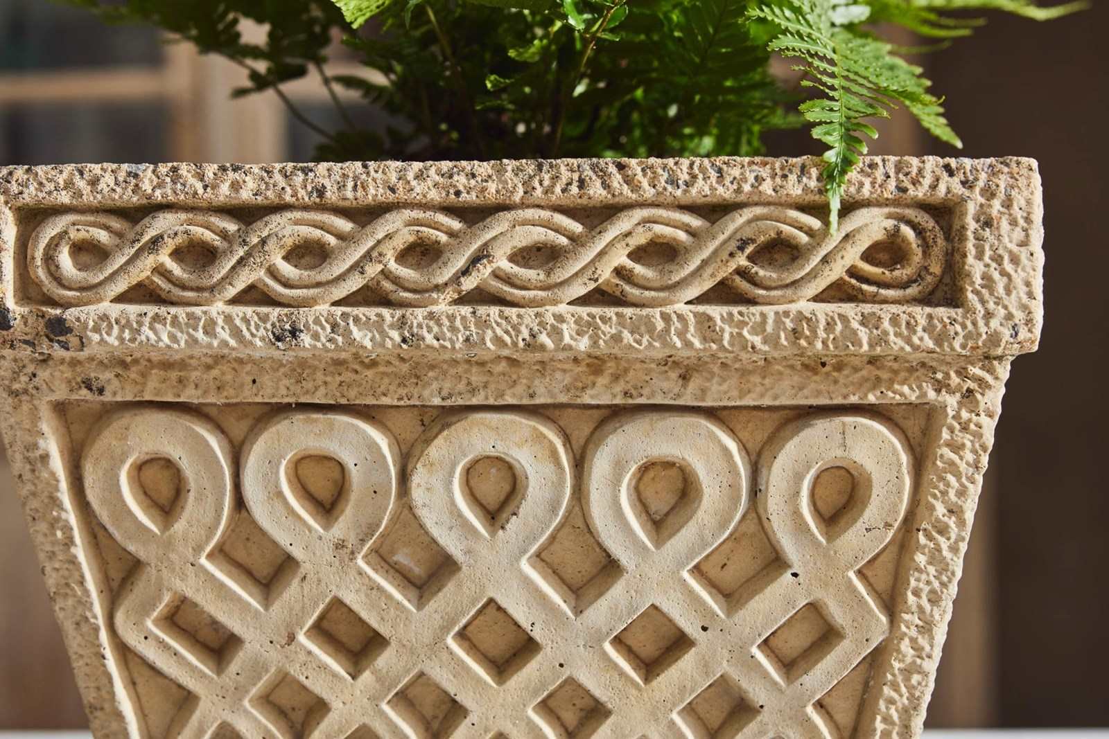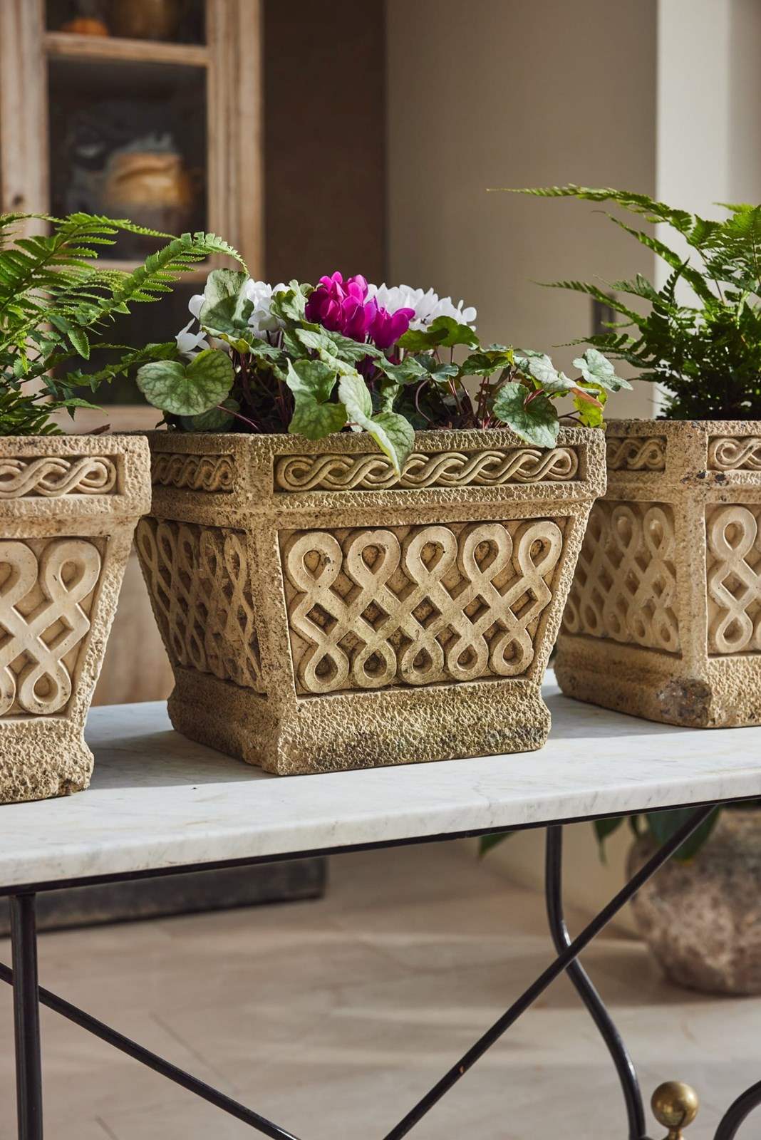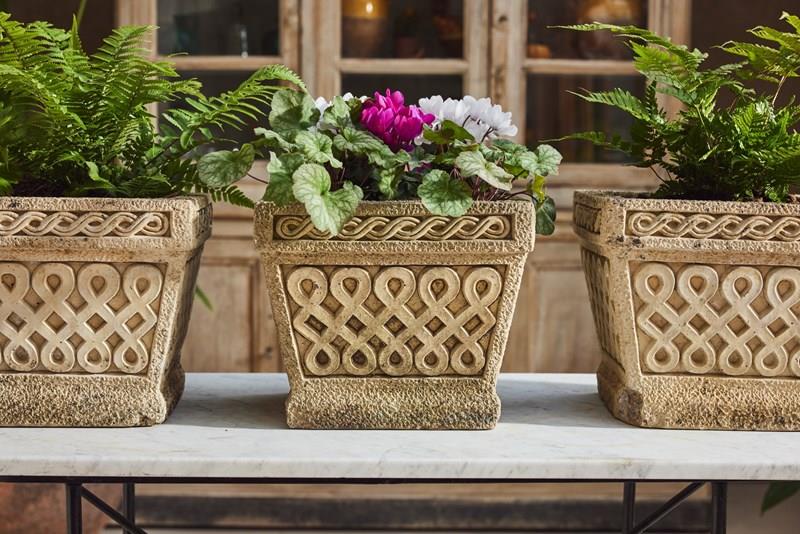 Set of three cast stone planters from Cotswold Studio, 1960s. The patterned surface draws from Arts and Crafts influences, offering simple, well-balanced detailing. Made to resemble natural Cotswold stone, they have developed an appealing, authentic weathered finish.