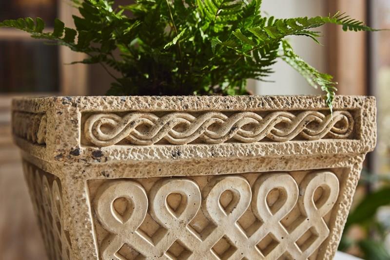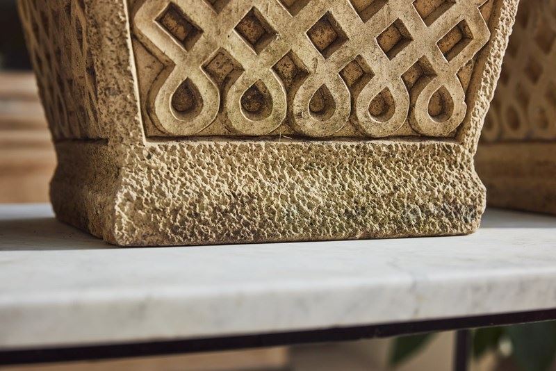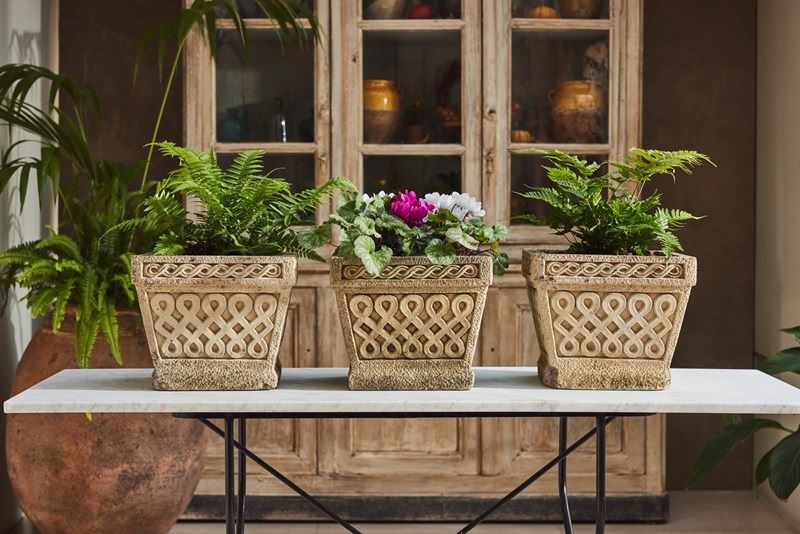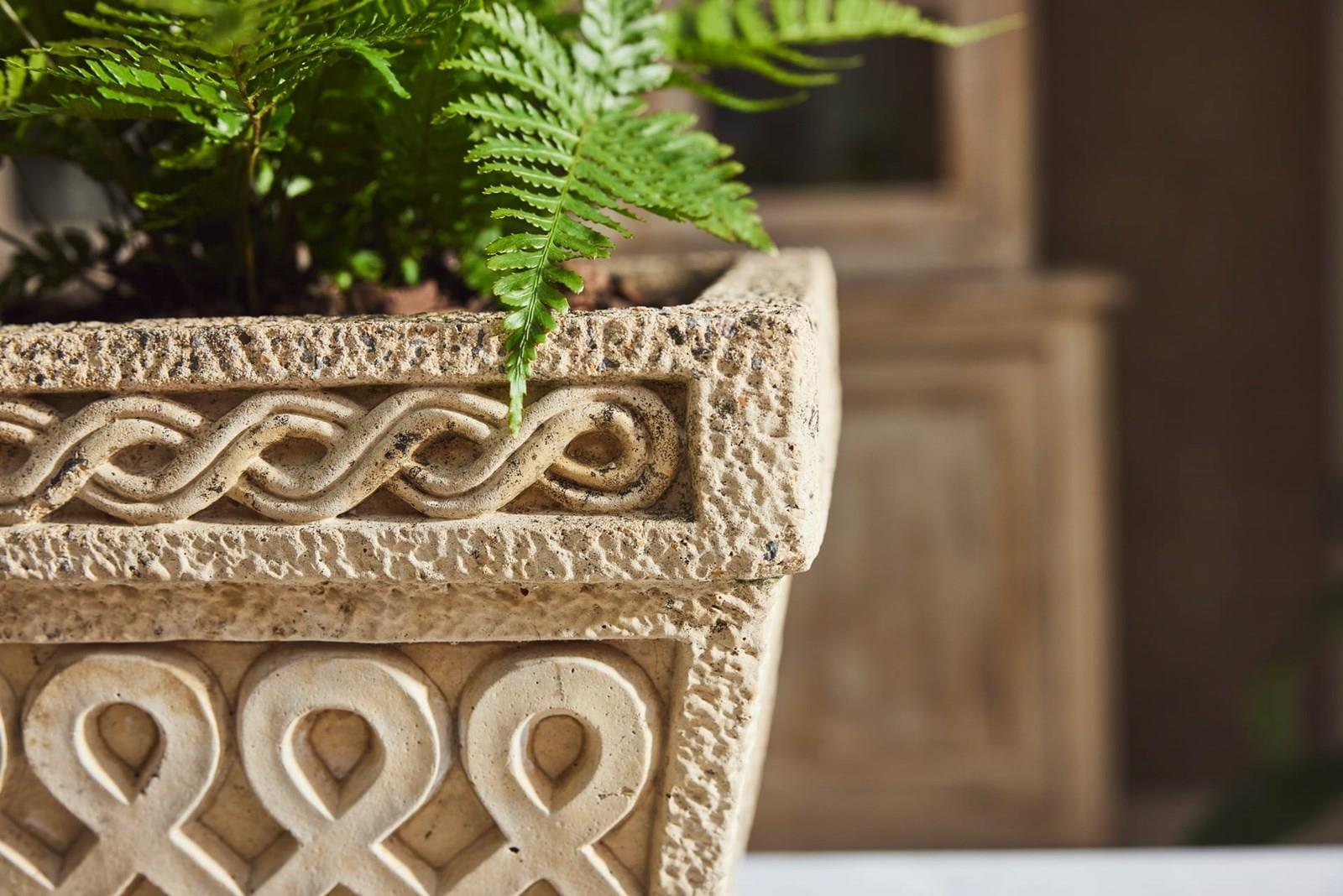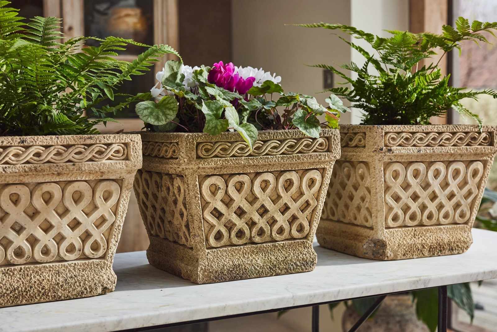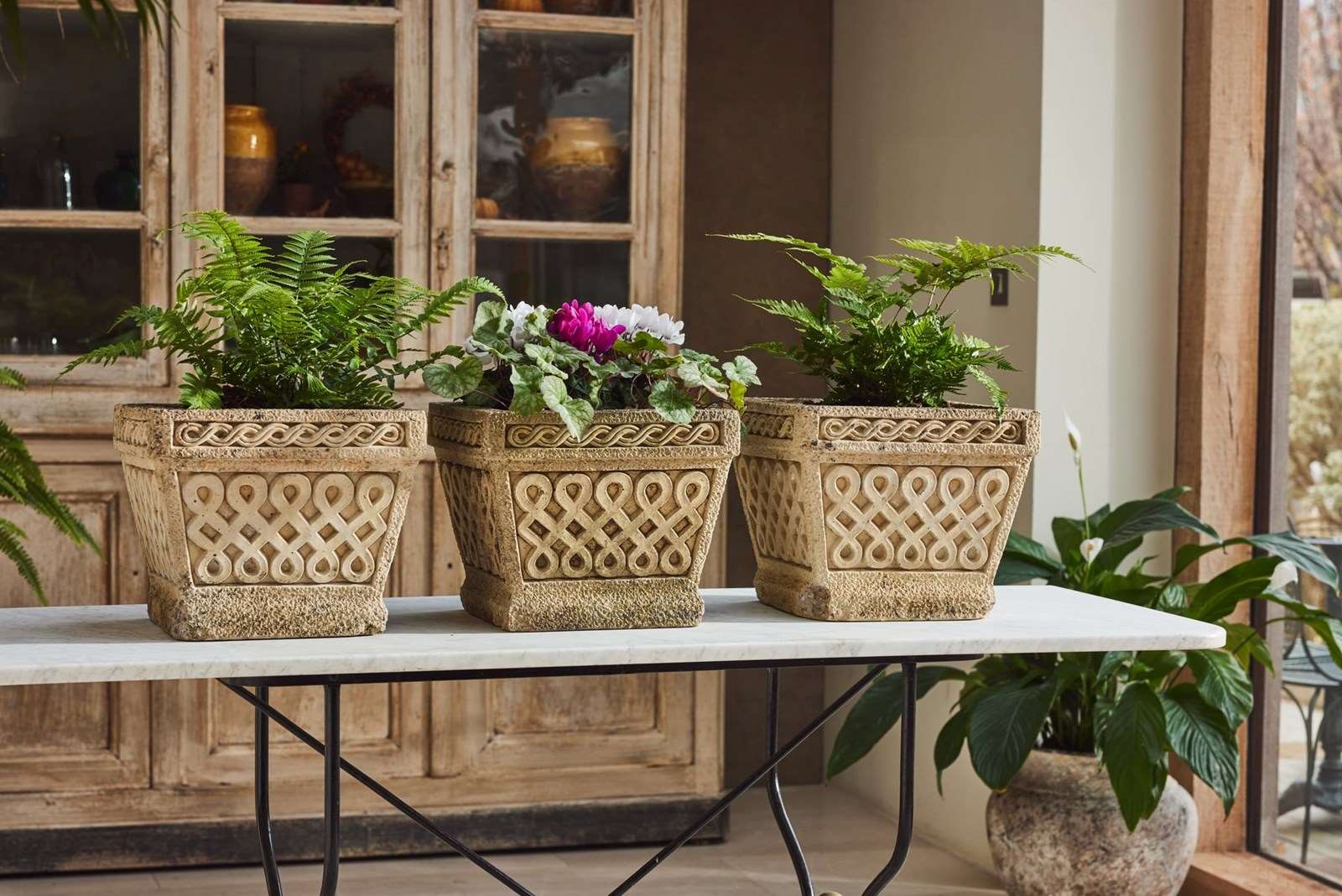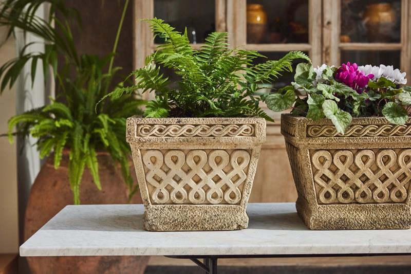 Set of three cast stone planters from Cotswold Studio, 1960s. The patterned surface draws from Arts and Crafts influences, offering simple, well-balanced detailing. Made to resemble natural Cotswold stone, they have developed an appealing, authentic weathered finish.