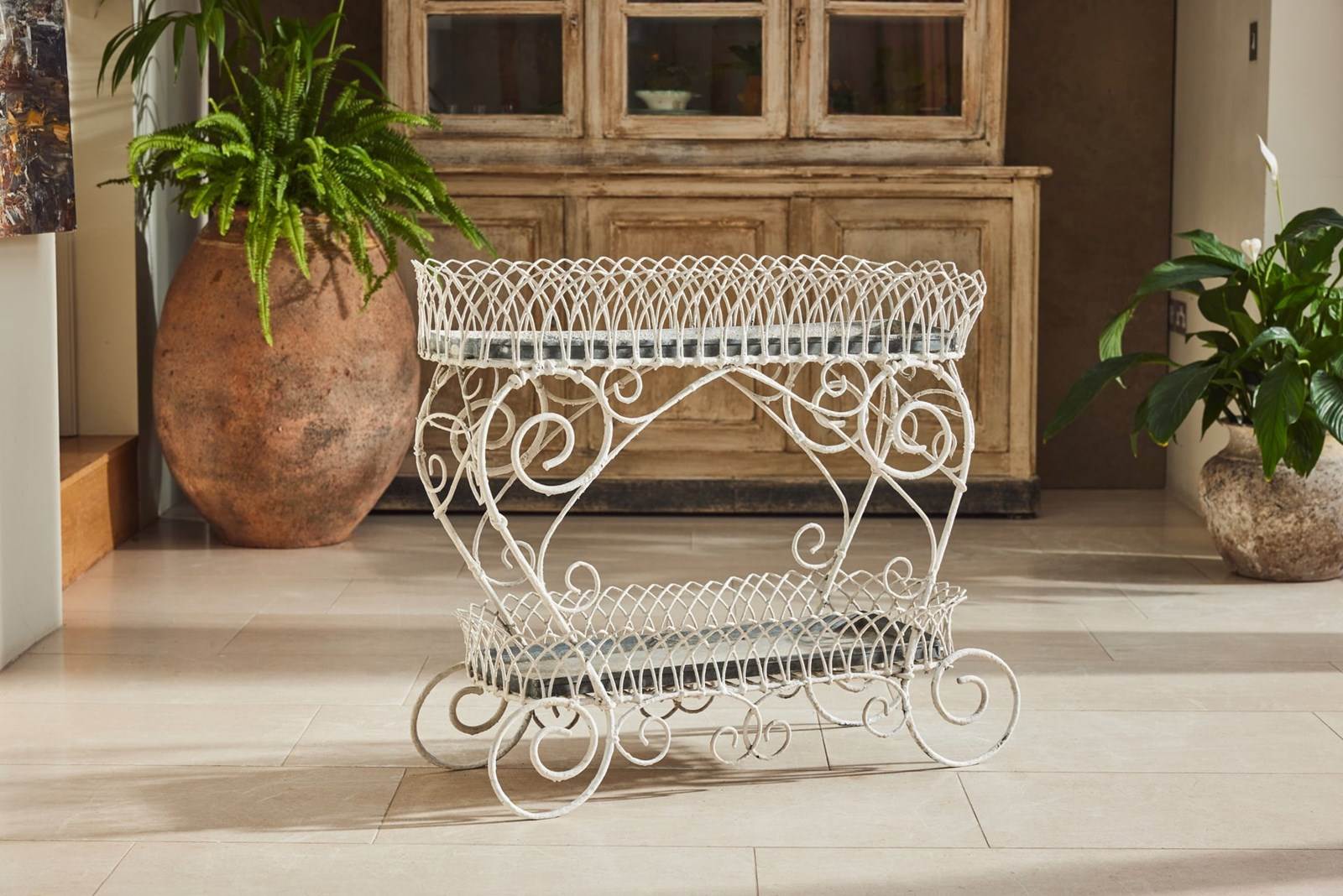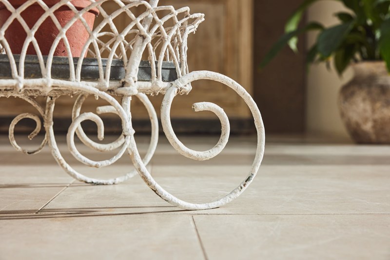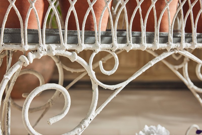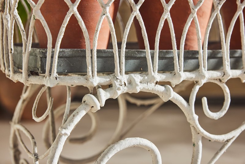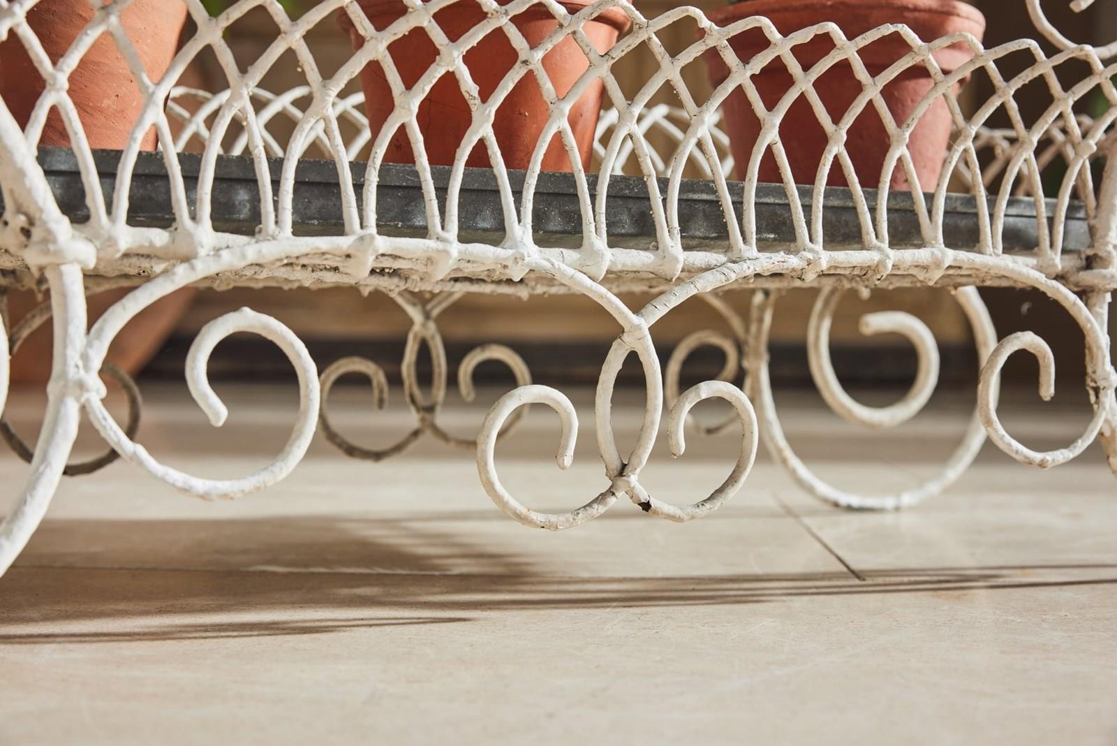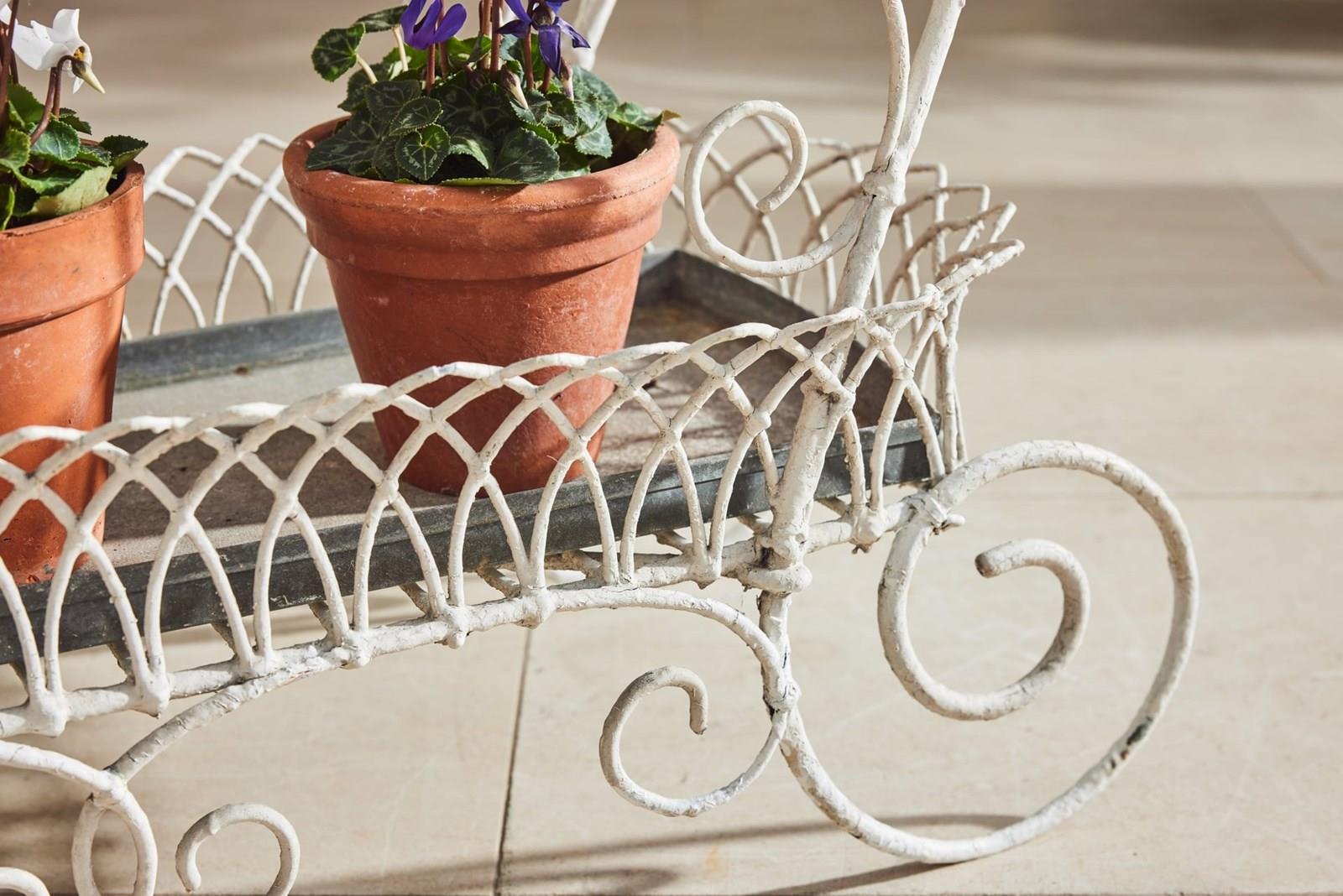 Handmade wire-framed jardiniere in original thick white paint, clipped and formed by hand with attractive, consistent workmanship. Arranged over two tiers, each level retains its original zinc tray, providing a practical base for plants, bulbs, or seasonal displays.