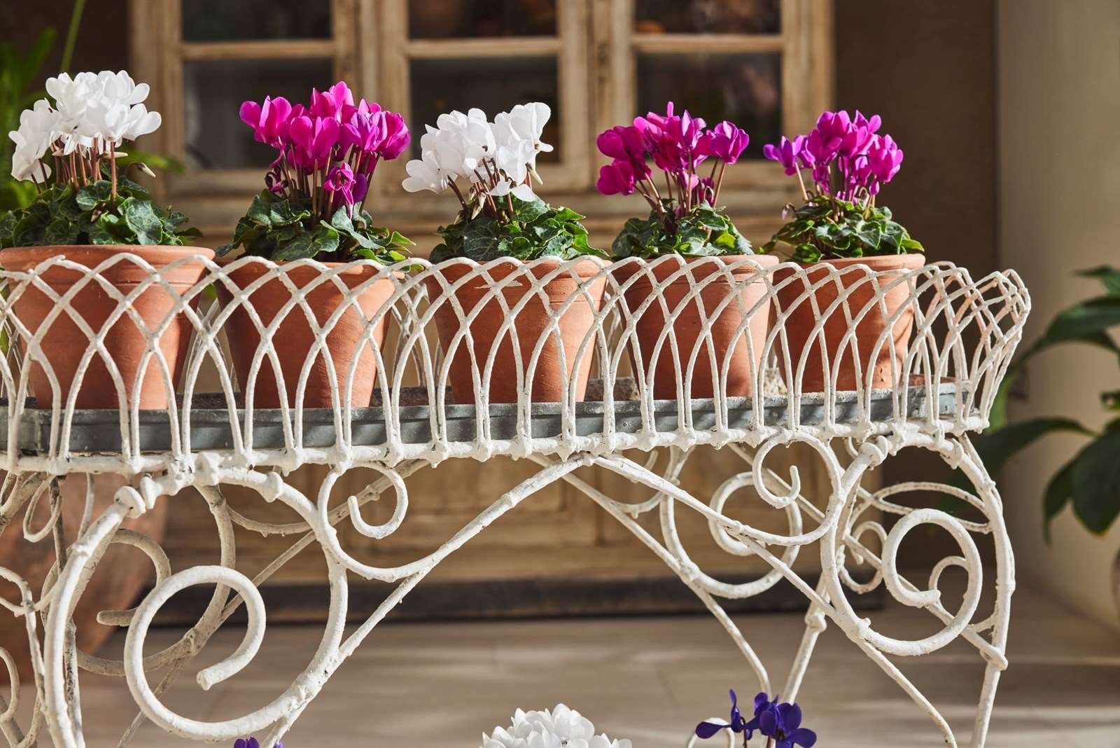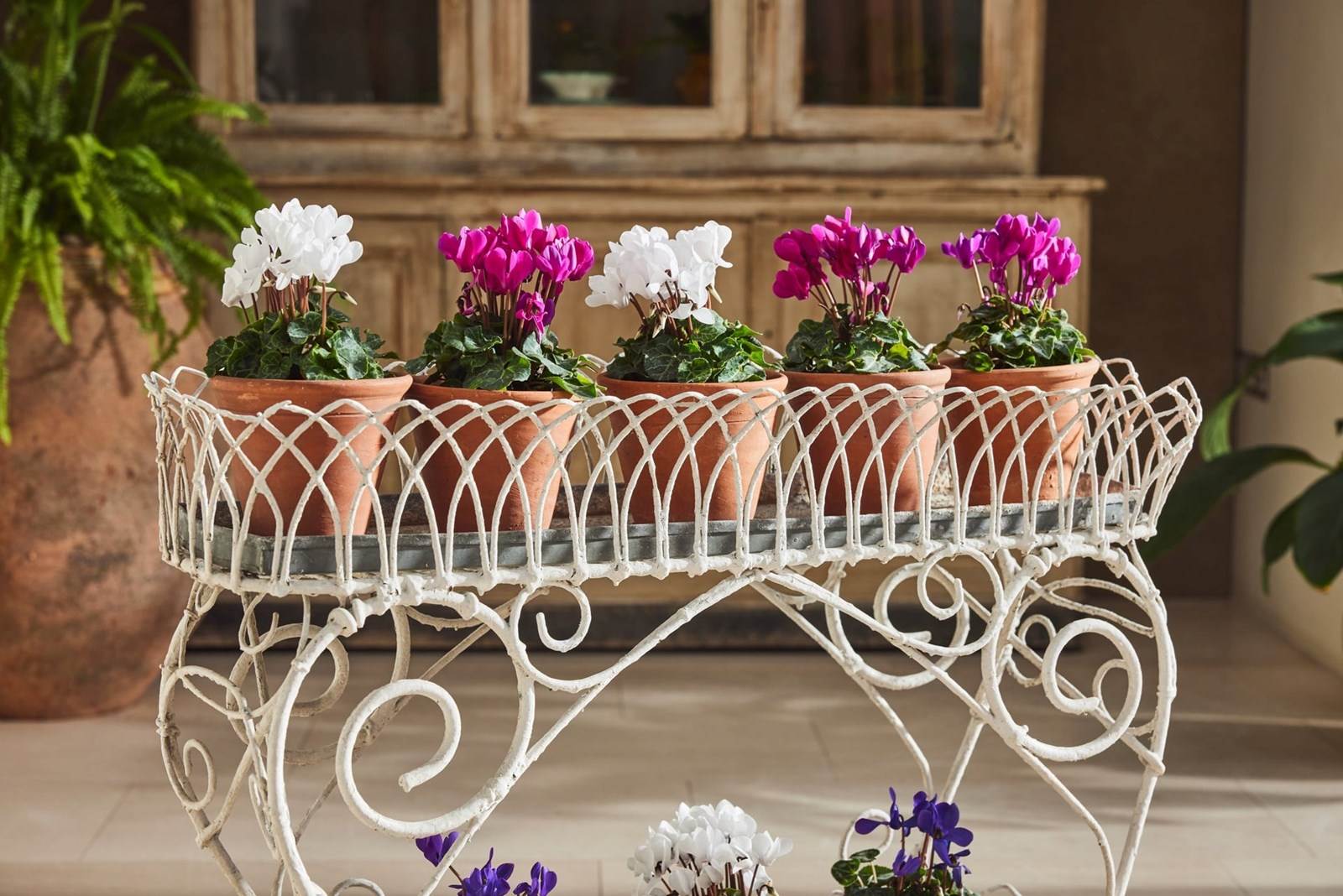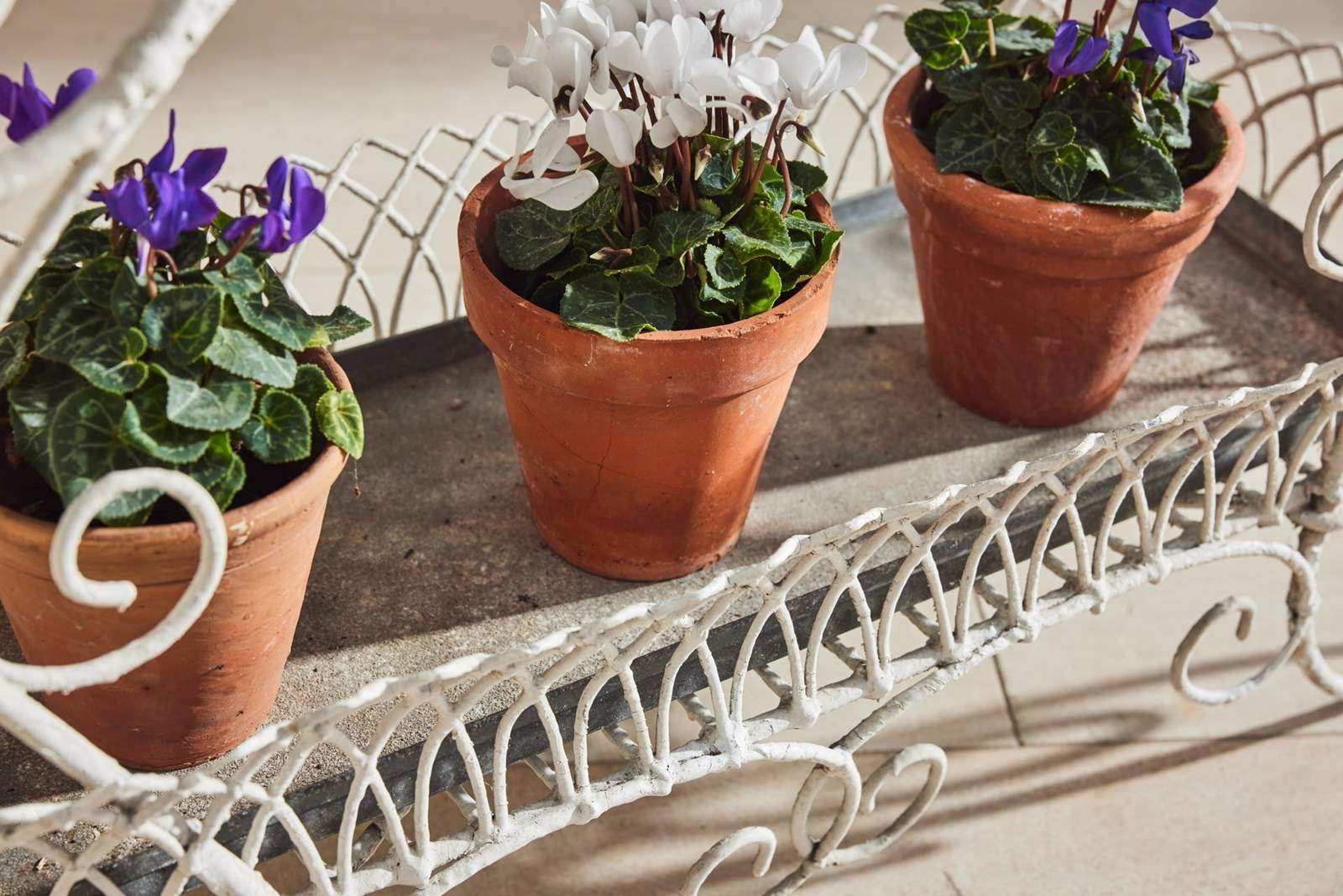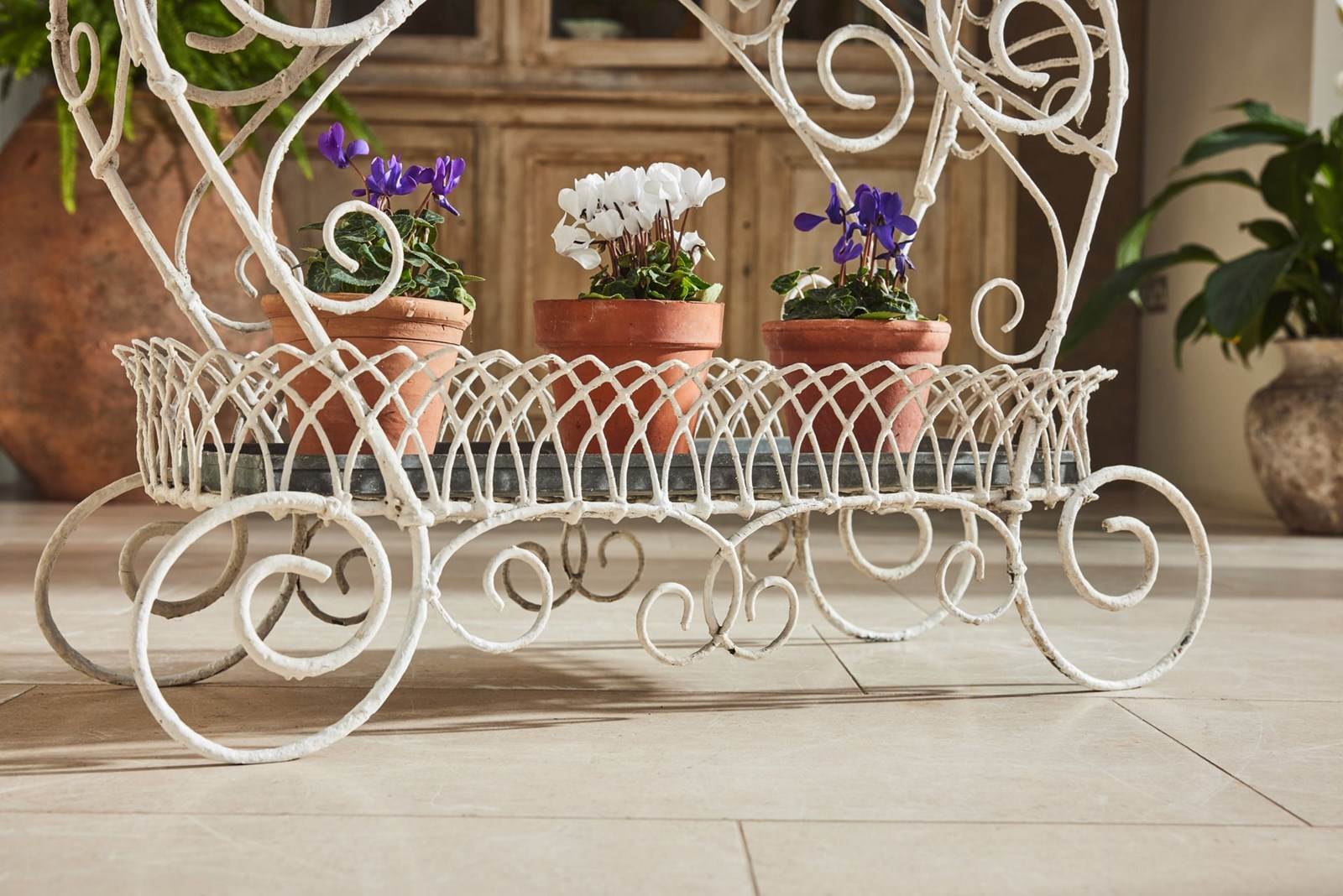 Handmade wire-framed jardiniere in original thick white paint, clipped and formed by hand with attractive, consistent workmanship. Arranged over two tiers, each level retains its original zinc tray, providing a practical base for plants, bulbs, or seasonal displays.