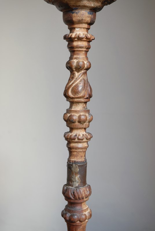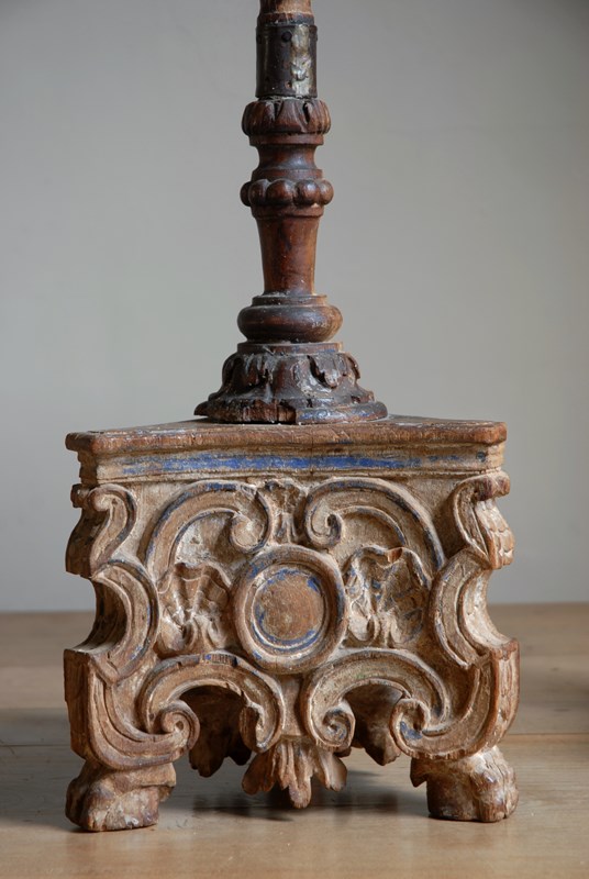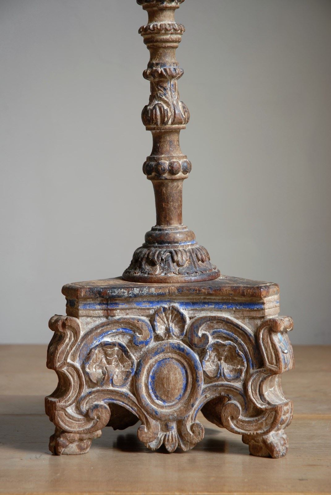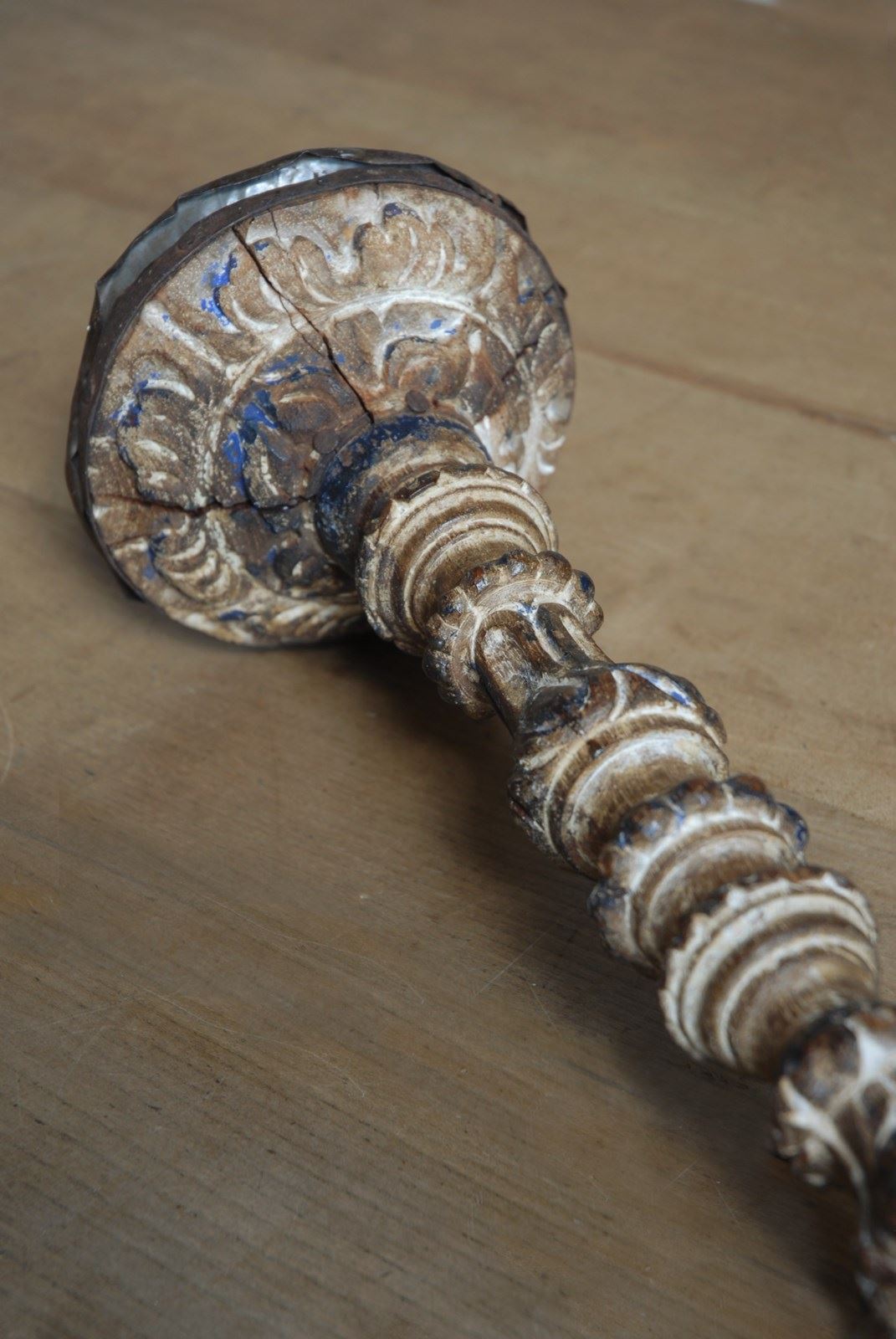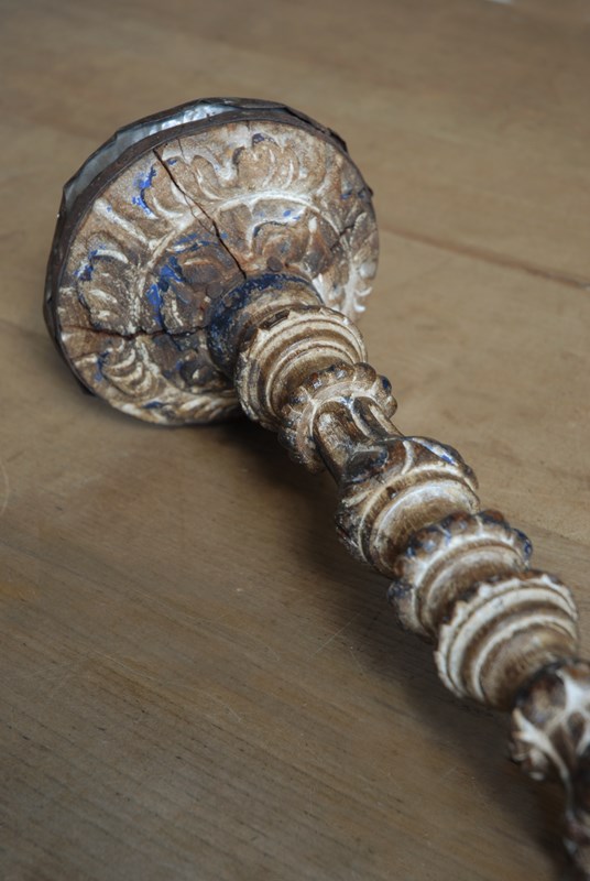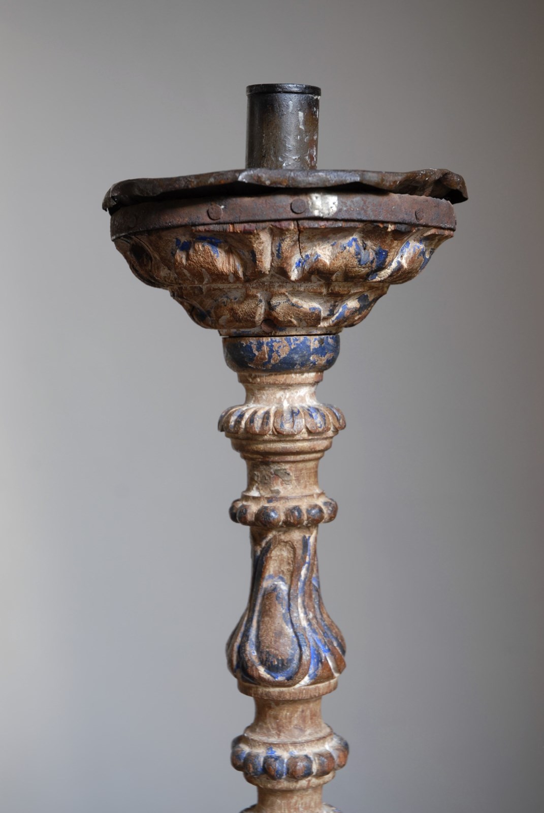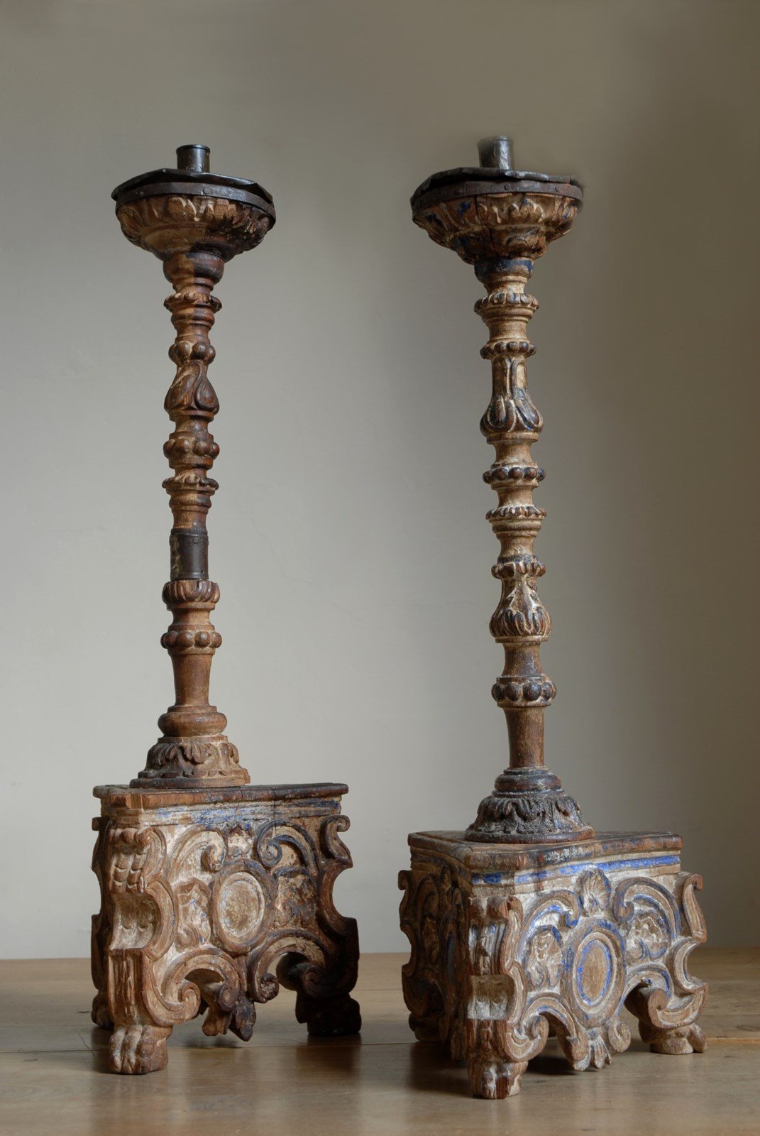 Condition: Very good. One of the sticks is slightly taller and has an old honest repair in metal to the carved column. The shorter one has a split to one side of the base, however it is strong and does not effect the use. There is a time-worn and beautiful patination to the polychrome surface and some small losses to the wood in parts.