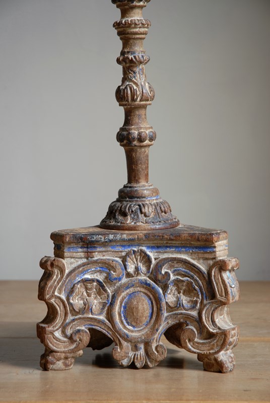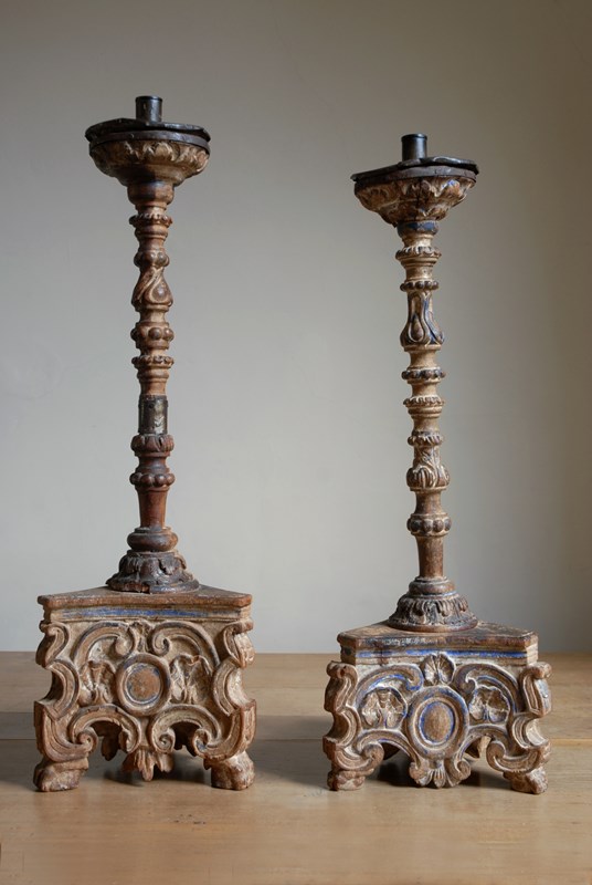 Description: A pair of tall 18th Century Italian altar candlesticks. In hand carved lime wood with subtle polychrome painted decoration in shades of blue and cream. The top of the candlesticks consist of metal work drip pans, raised on carved baluster stems and the bases are triform with scrolled feet. These over sized, classically ornamented candlesticks would have originally adorned a Palazzo or Church altar.