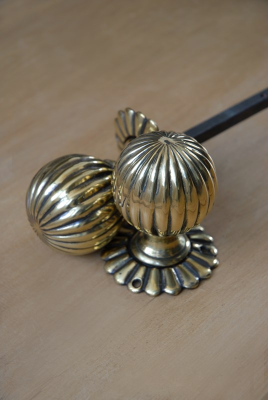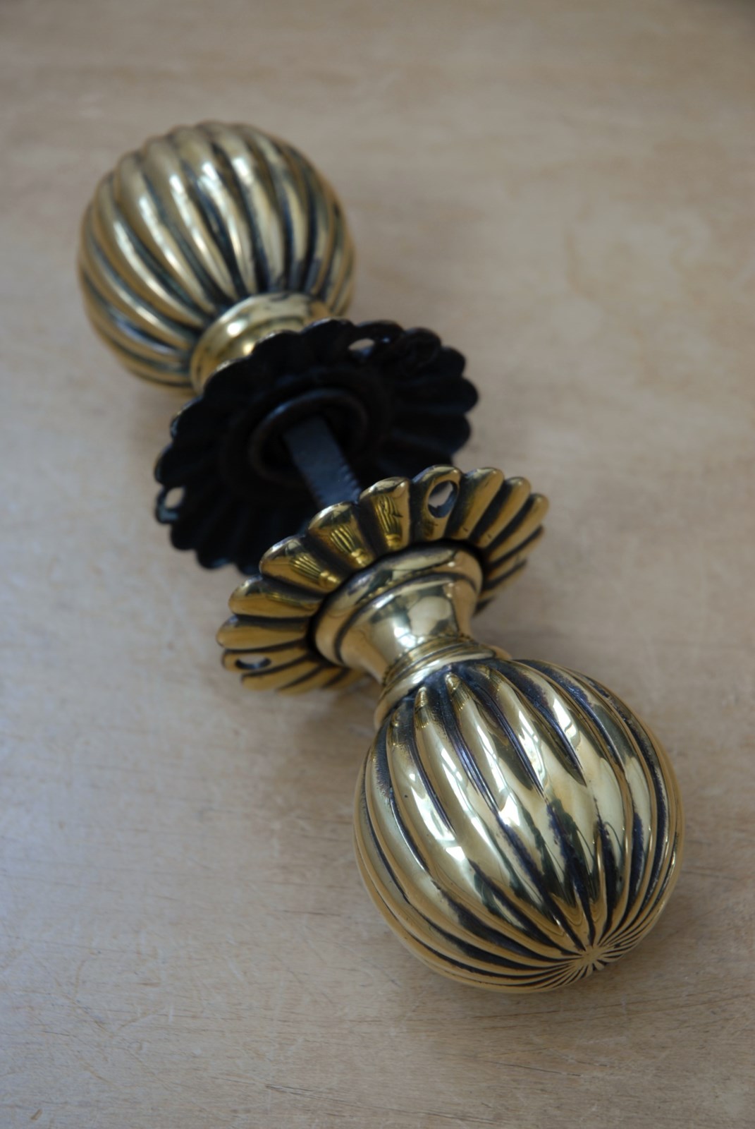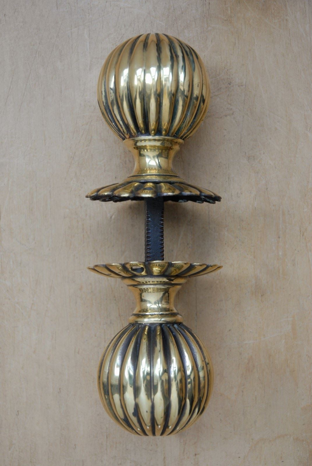 Description: Original, quality pair of antique door knobs, dating from the 1800’s. The round handles have a distinctive lobed pattern radiating out from the centre, this design is then echoed on the backplate. The backplate has three screw holes for installation. This set come with a square bar spindle and are suitable for fitting with mortice or latch fittings.