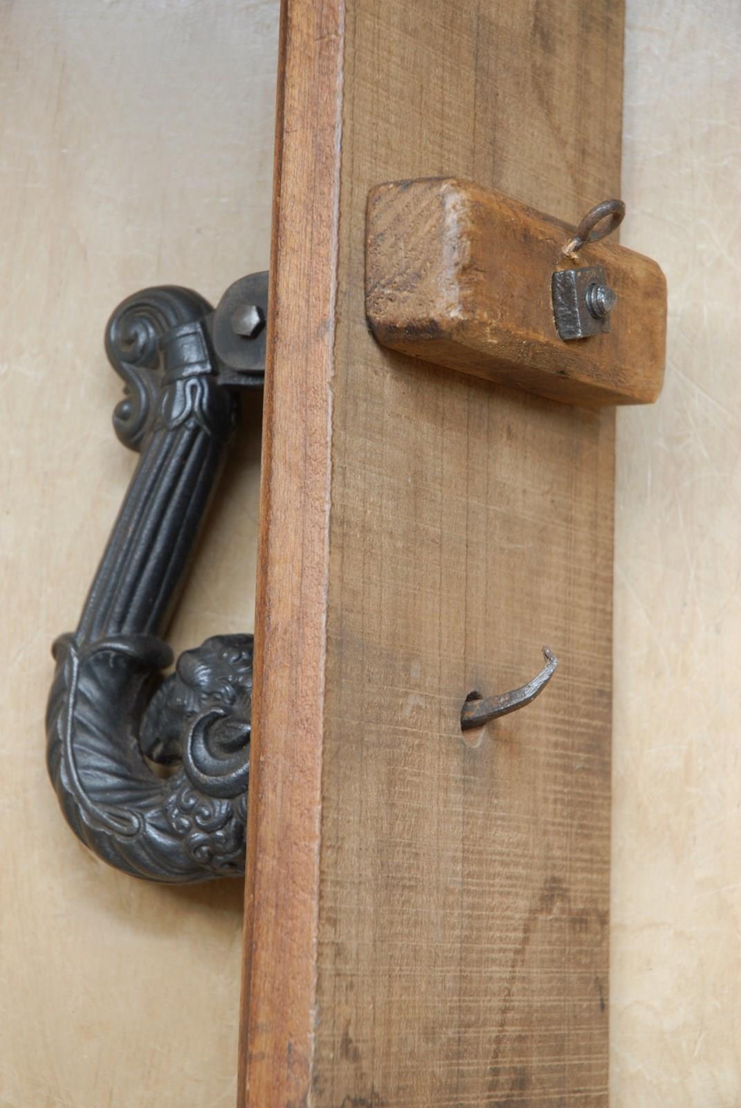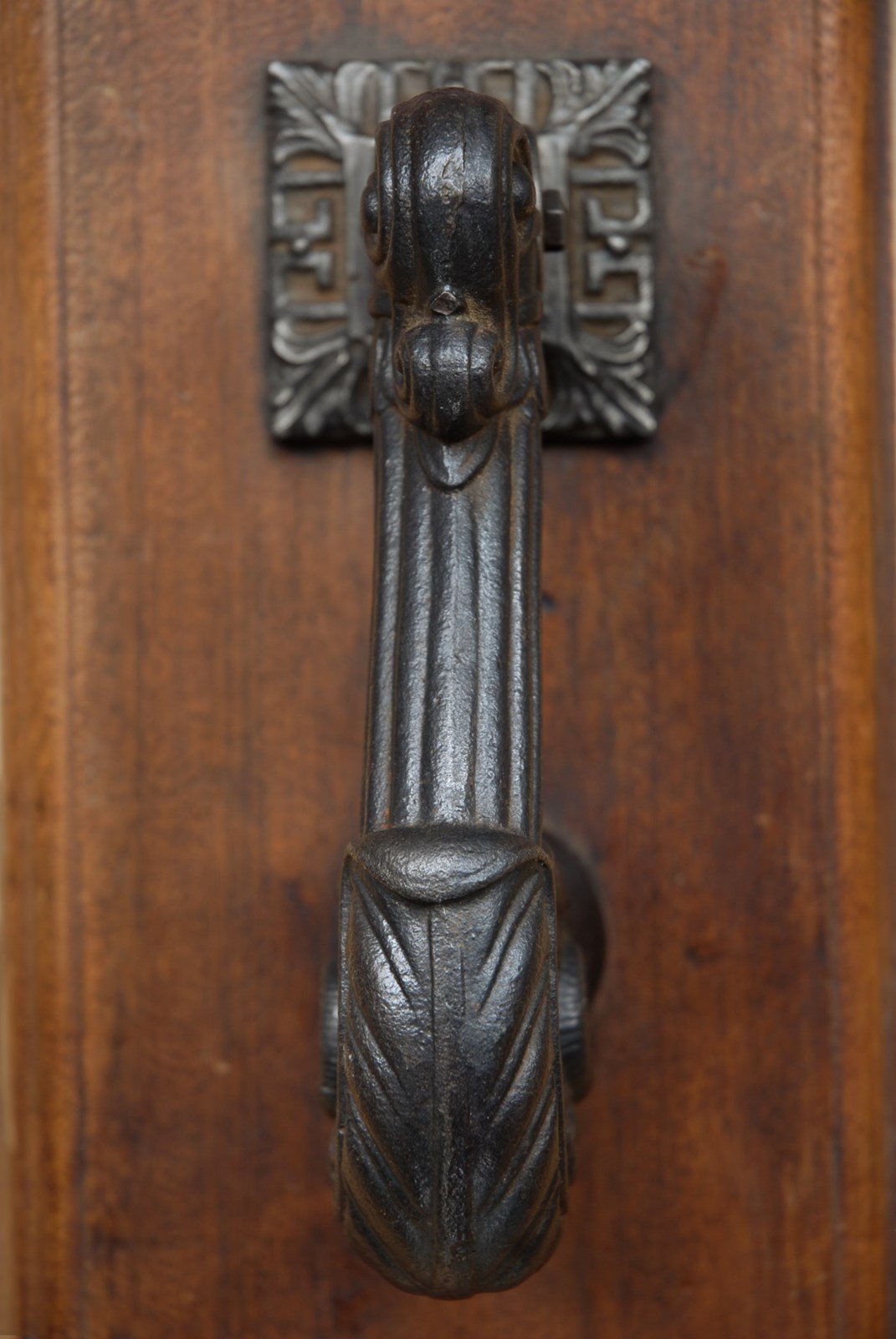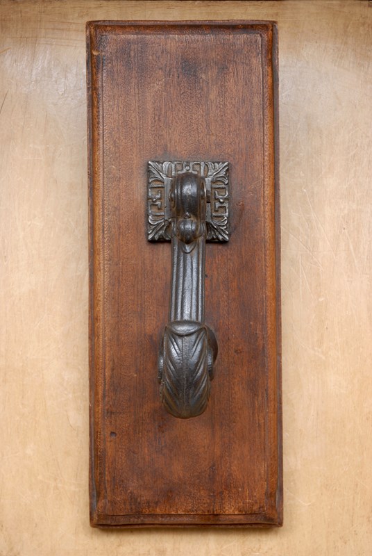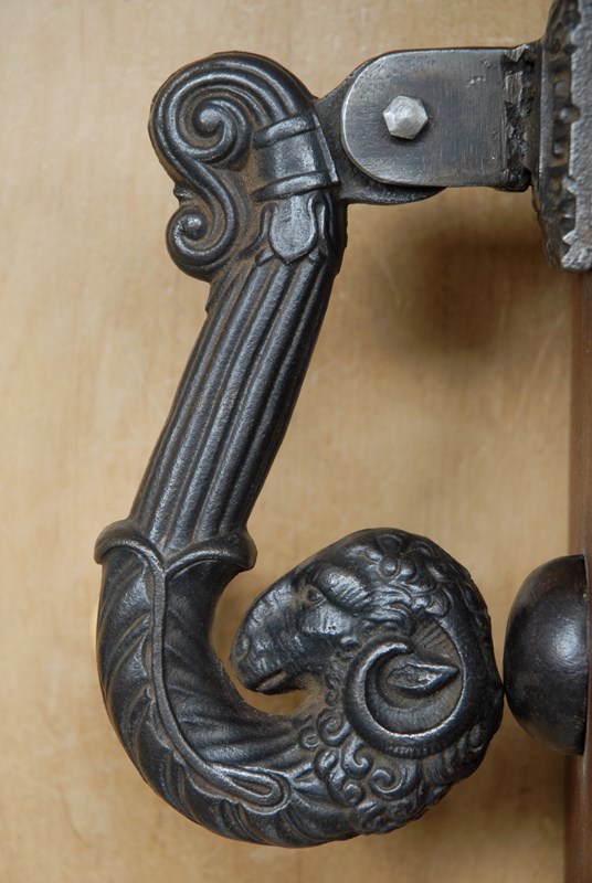 An original quality large, antique cast iron door knocker. Dating from the early 1800’s this is a fine example of an antique front door knocker. Sourced in the South of France in Cannes, I’ve seen a similar example on an Italian church, it is possible that it originated from Italy. The handle takes the form of a rams head with stylised foliage scroll work running down the length. You can really see the quality in the details, like the hand made artisan feel to the strike and bolts. Complete with its original strike plate, this example has been mounted on a backboard, straightforward to remove and fix to a front door.